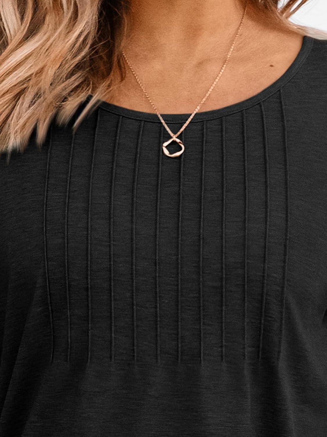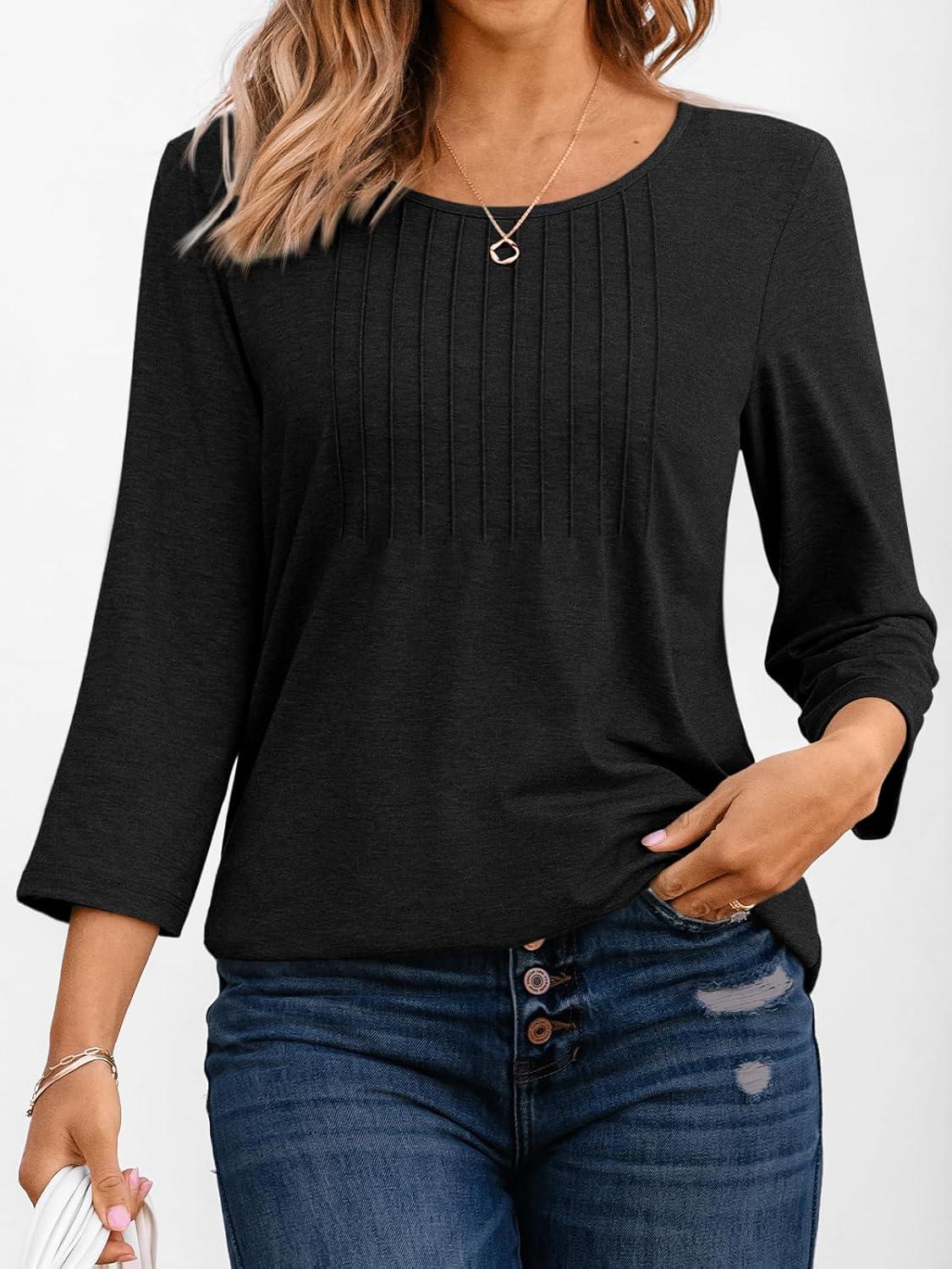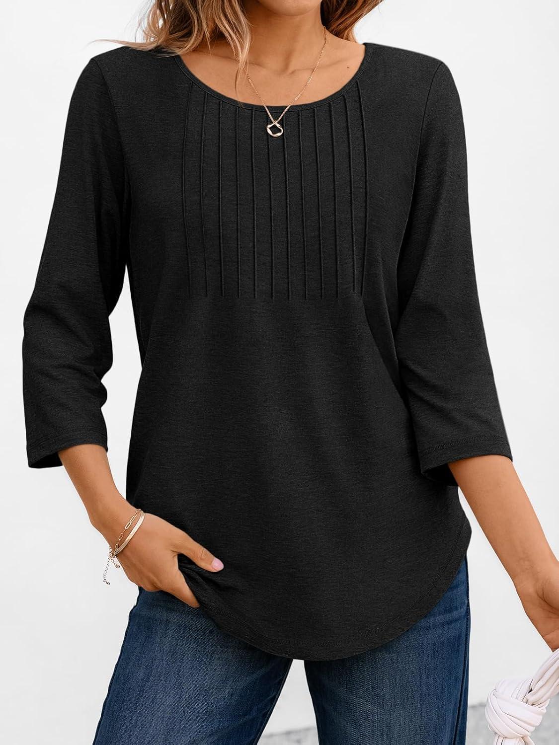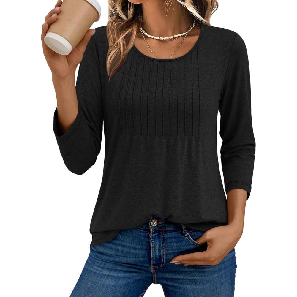 AUTOMET 3/4 Length Sleeve Womens Tops Casual Top Pleated Tunic Loose Fit Shirts Women Blouses Fall Outfits 2025(Black)