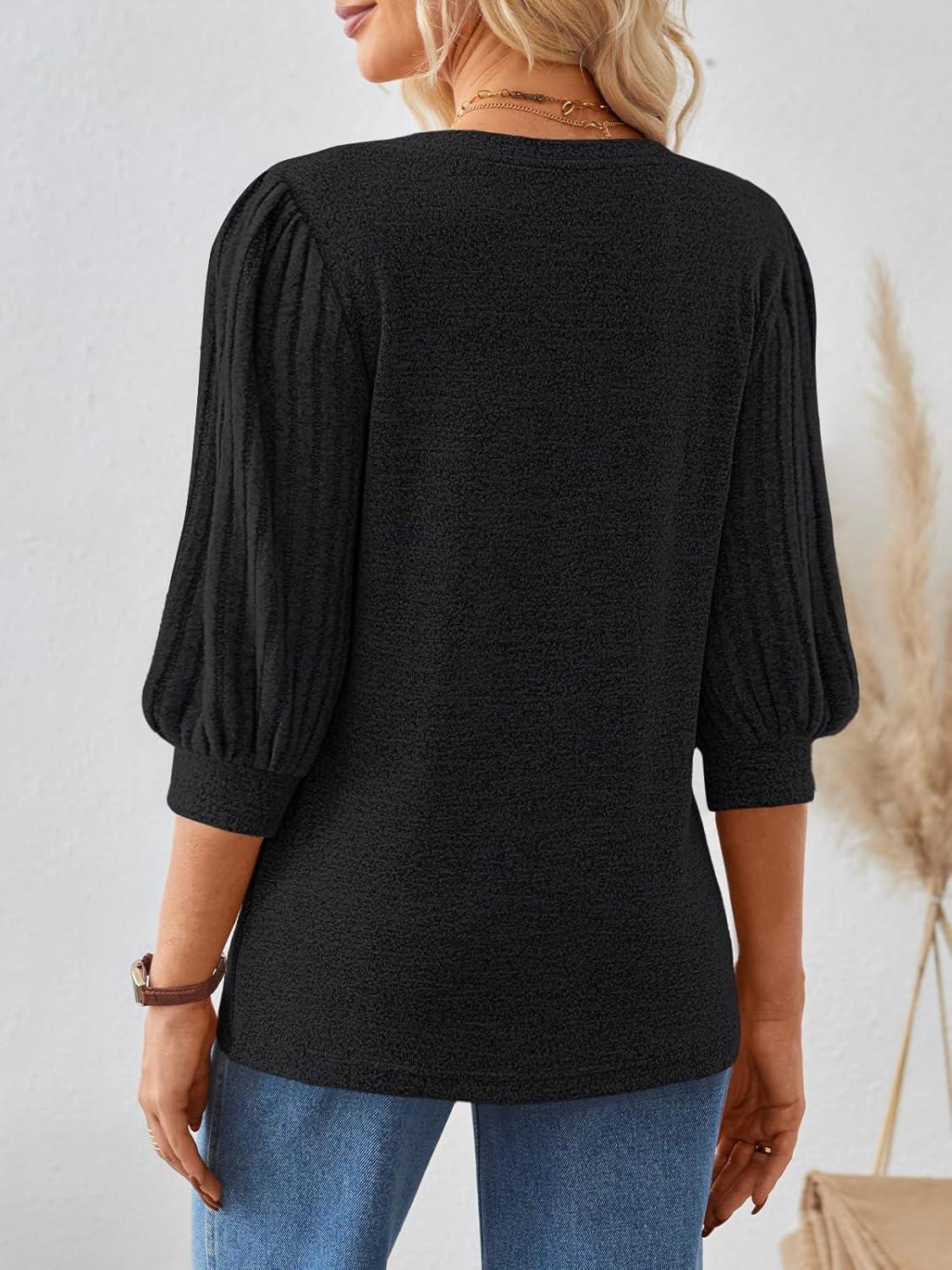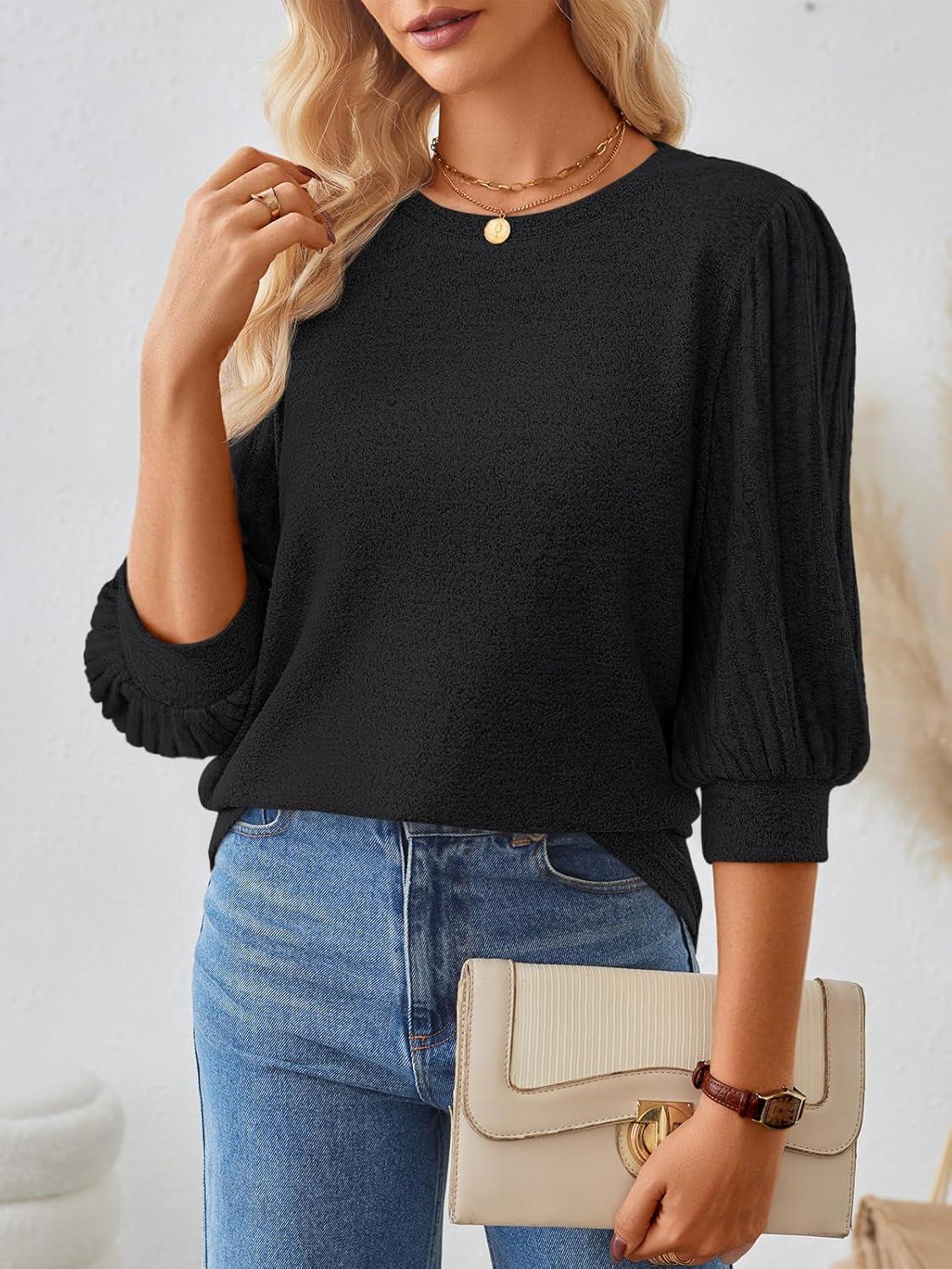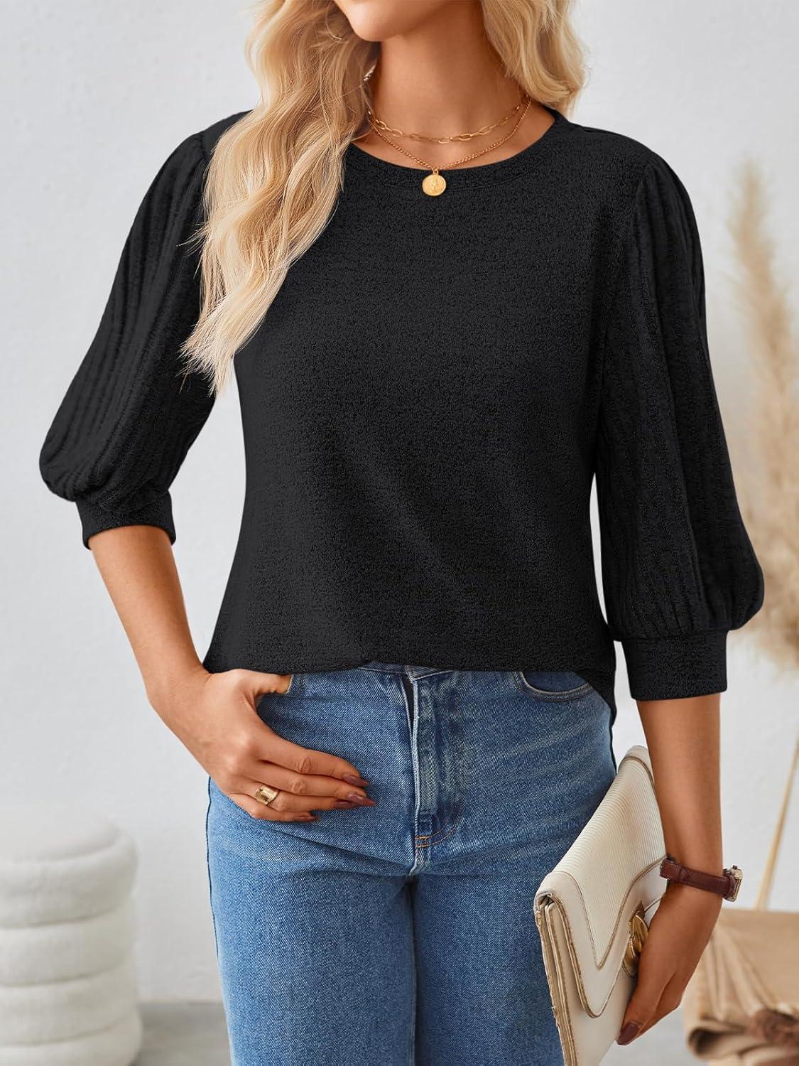 AUTOMET 3/4 Length Sleeve Womens Tops Puff Sleeve Lightweight Fall Sweaters Business Dressy Casual Work Blouses Cute T Shirts(Black)