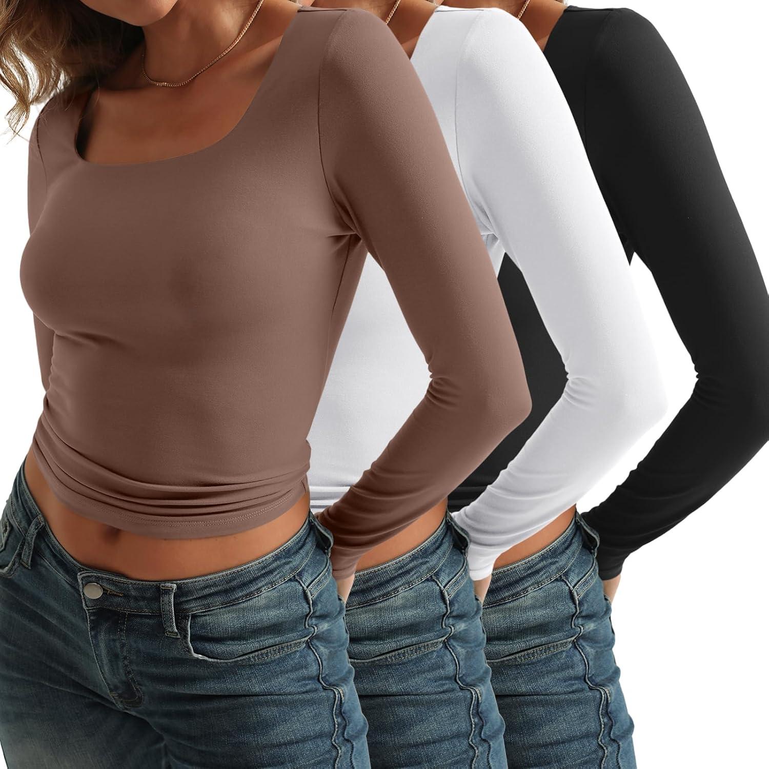 imageAUTOMET 3 Pack Womens Long Sleeve Shirts Fall Fashion Scoop Neck Crop Tops Basic Layer Slim Fit Y2K ClothesBlack white coffee Grey