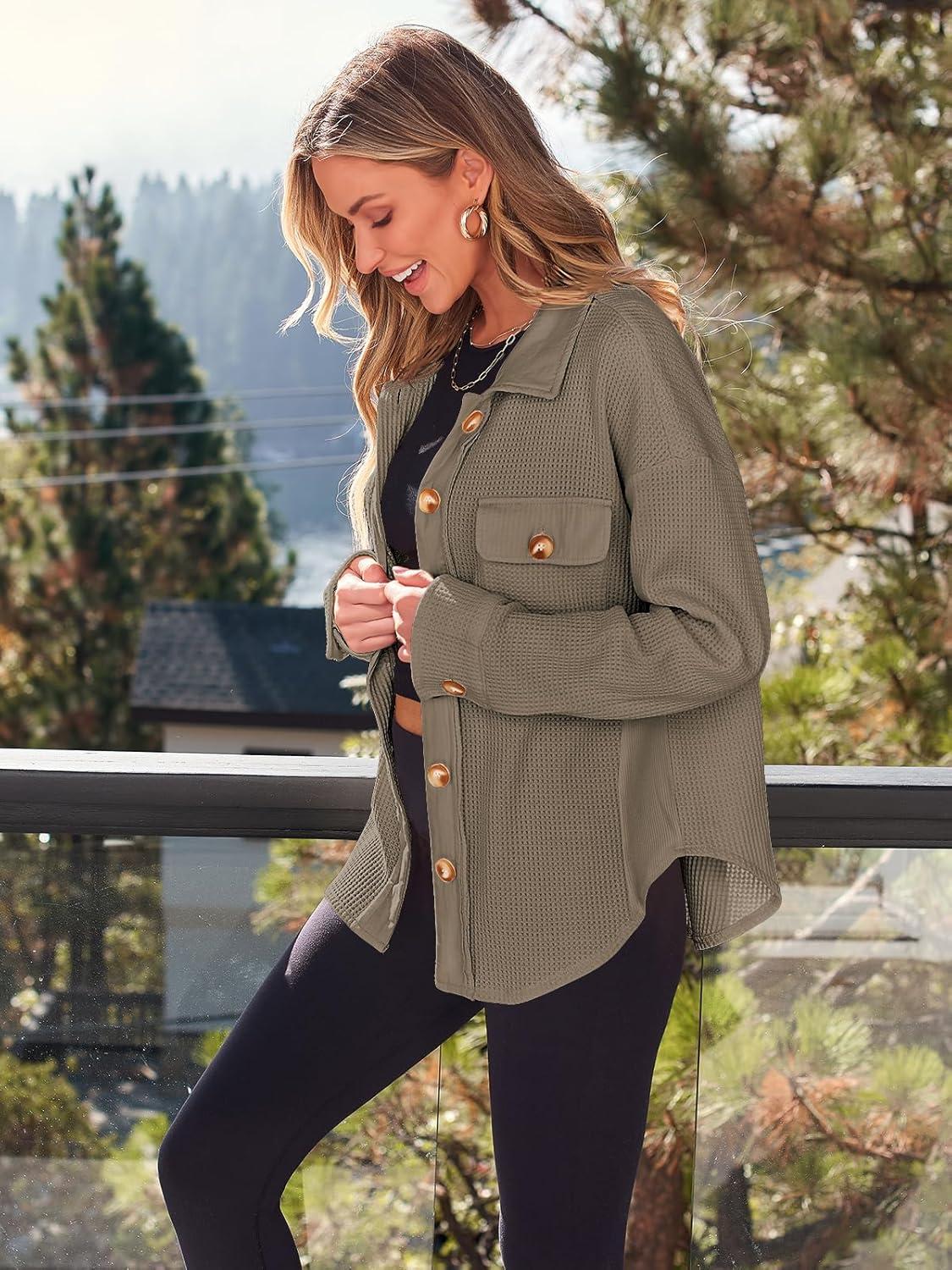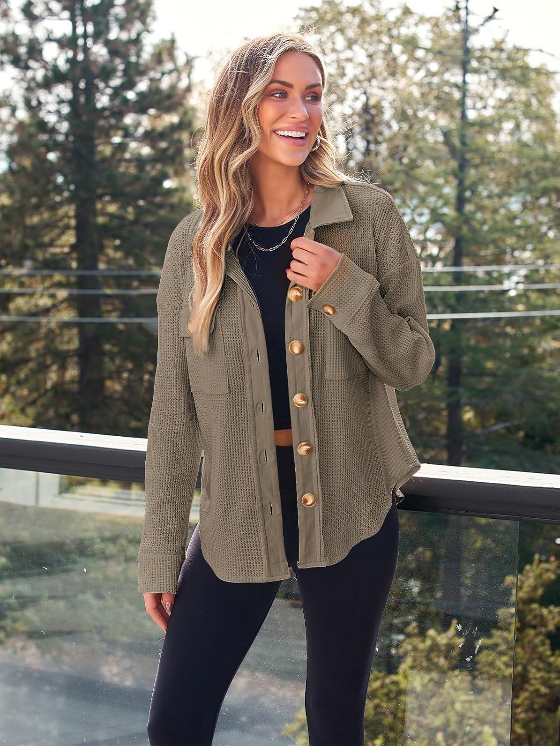 AUTOMET Fall Outfits for Women 2025 Fashion Clothes Winter Waffle Knit Clothing Oversized Button Down Shirt(Coffee)