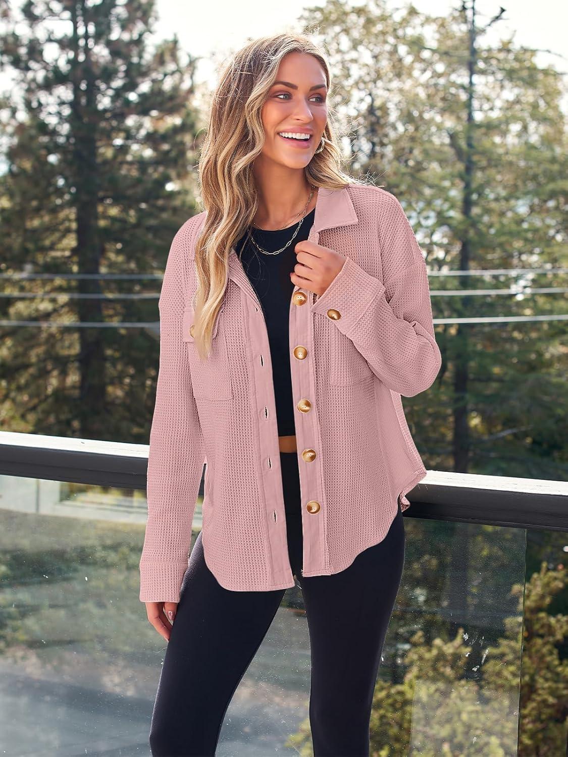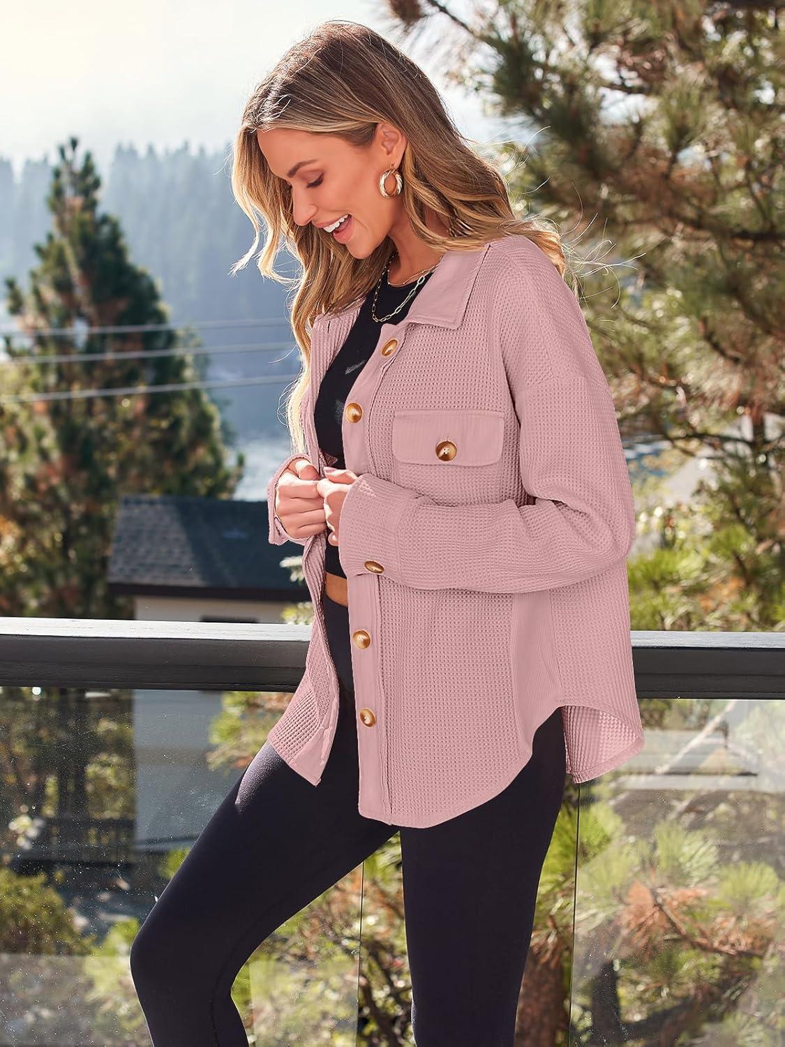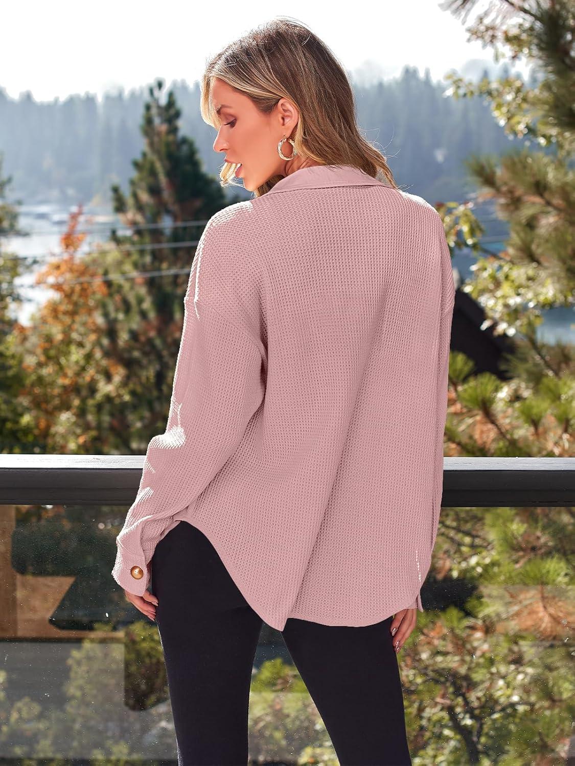 AUTOMET Fall Outfits for Women 2025 Fashion Clothes Winter Waffle Knit Clothing Oversized Button Down Shirt(Deeppink)