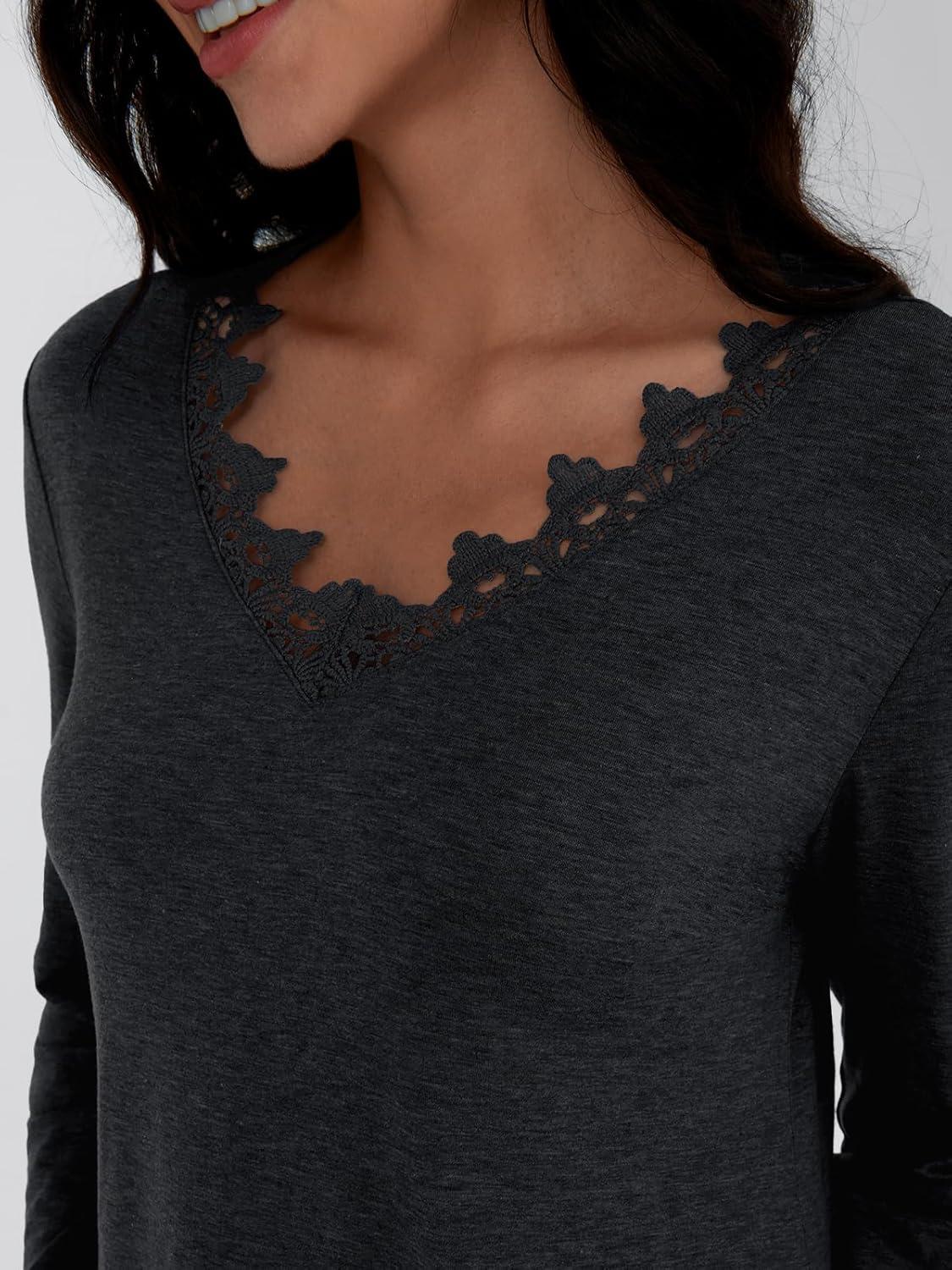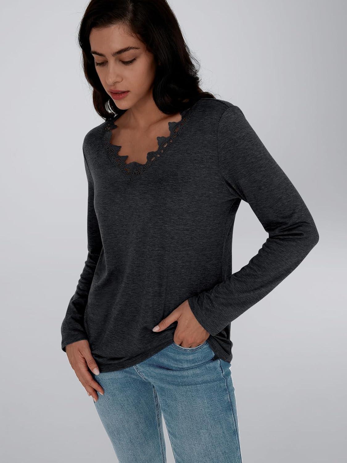 imageAUTOMET Long Sleeve Shirts for Women 2025 Fall Fashion Lace V Neck Loose Fit Casual Tops Trendy T Shirts Outfits ClothesCoffee Grey