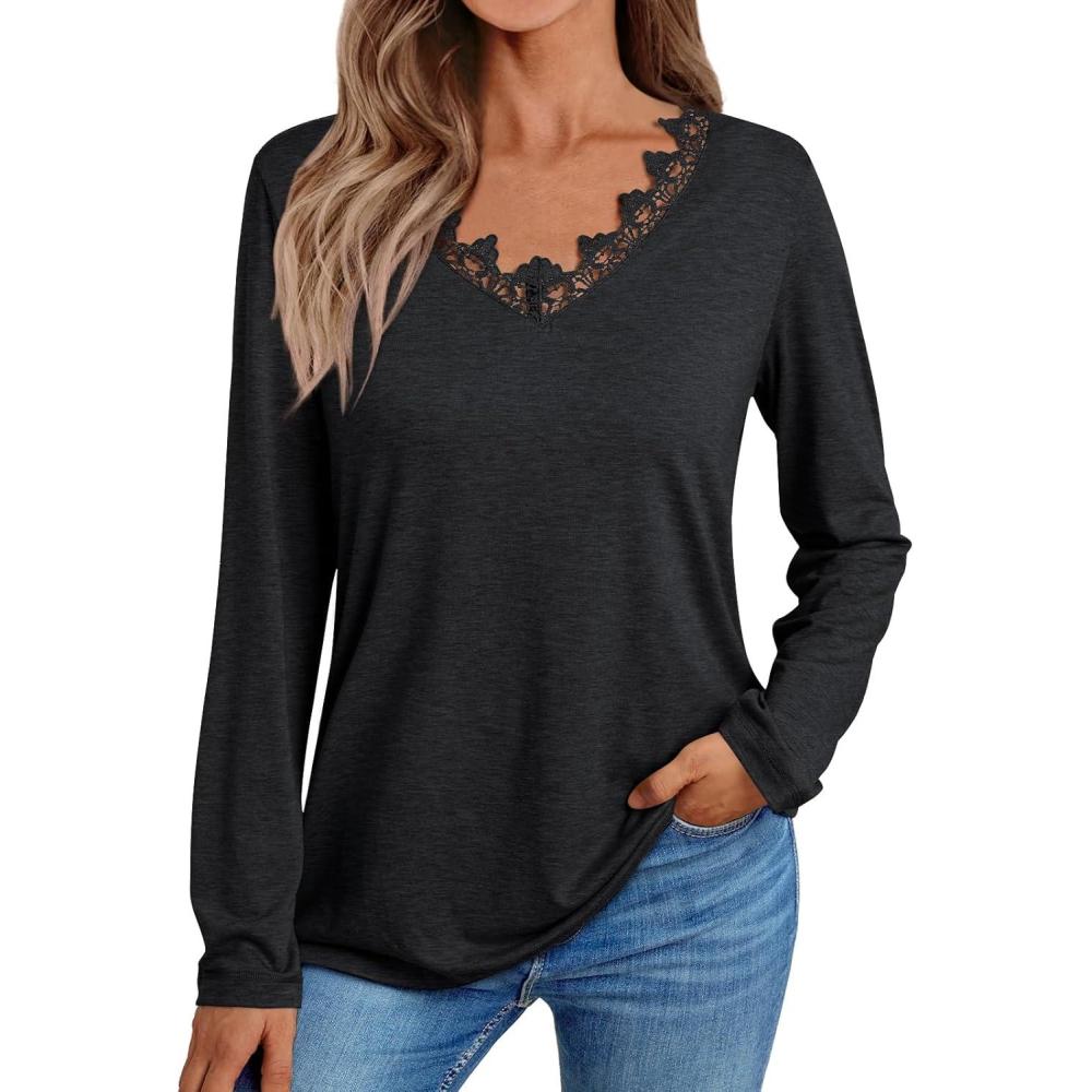 AUTOMET Long Sleeve Shirts for Women 2025 Fall Fashion Lace V Neck Loose Fit Casual Tops Trendy T Shirts Outfits Clothes(Black)