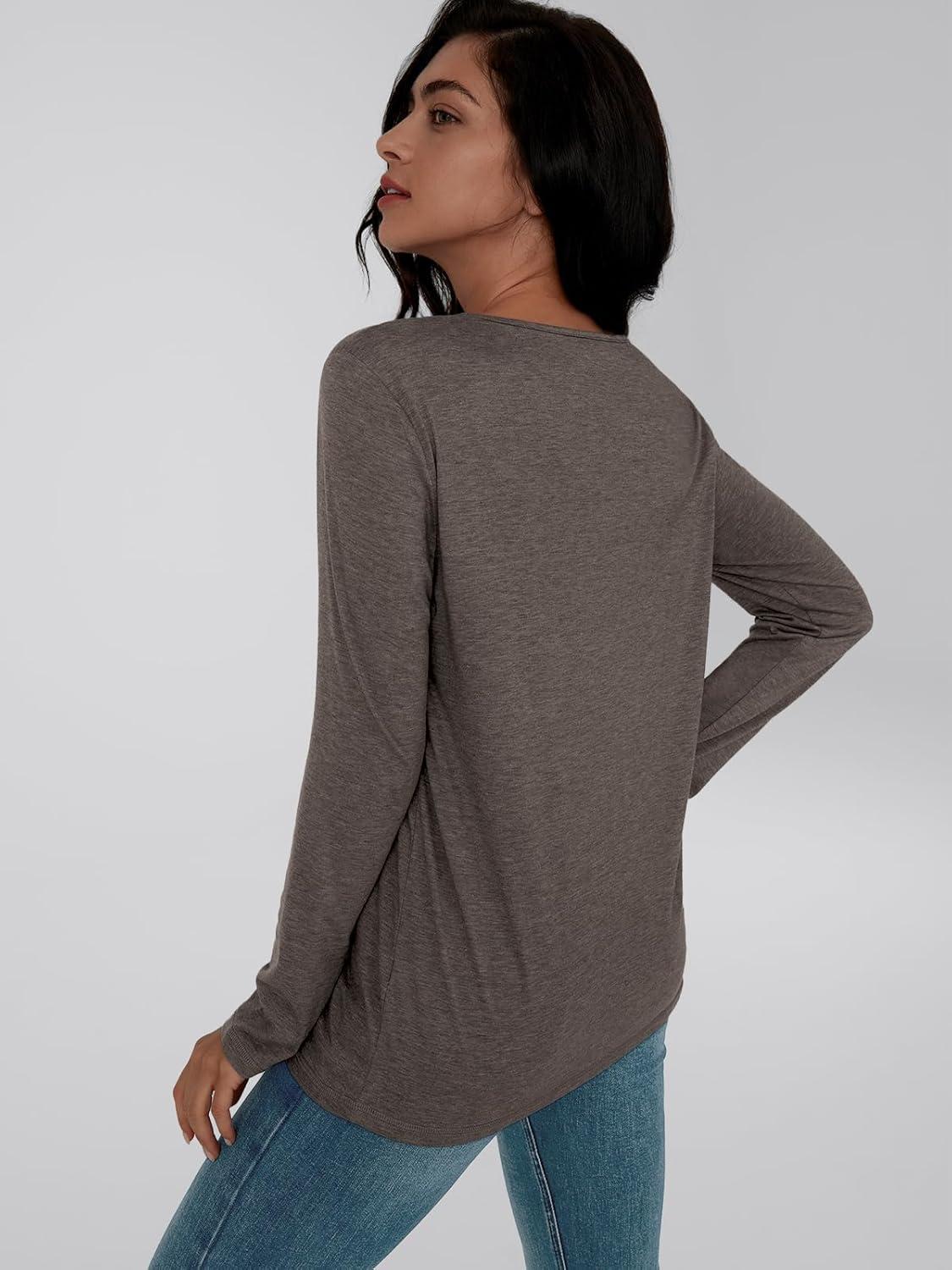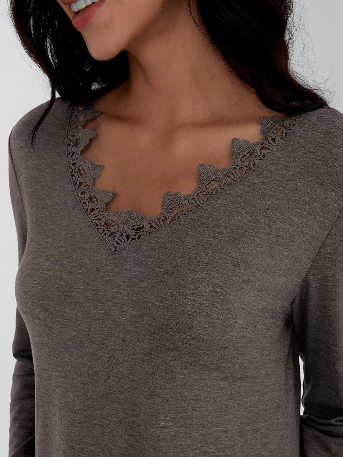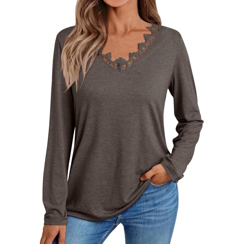 AUTOMET Long Sleeve Shirts for Women 2025 Fall Fashion Lace V Neck Loose Fit Casual Tops Trendy T Shirts Outfits Clothes(Coffee Grey)