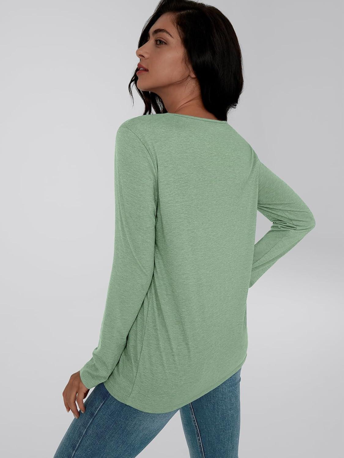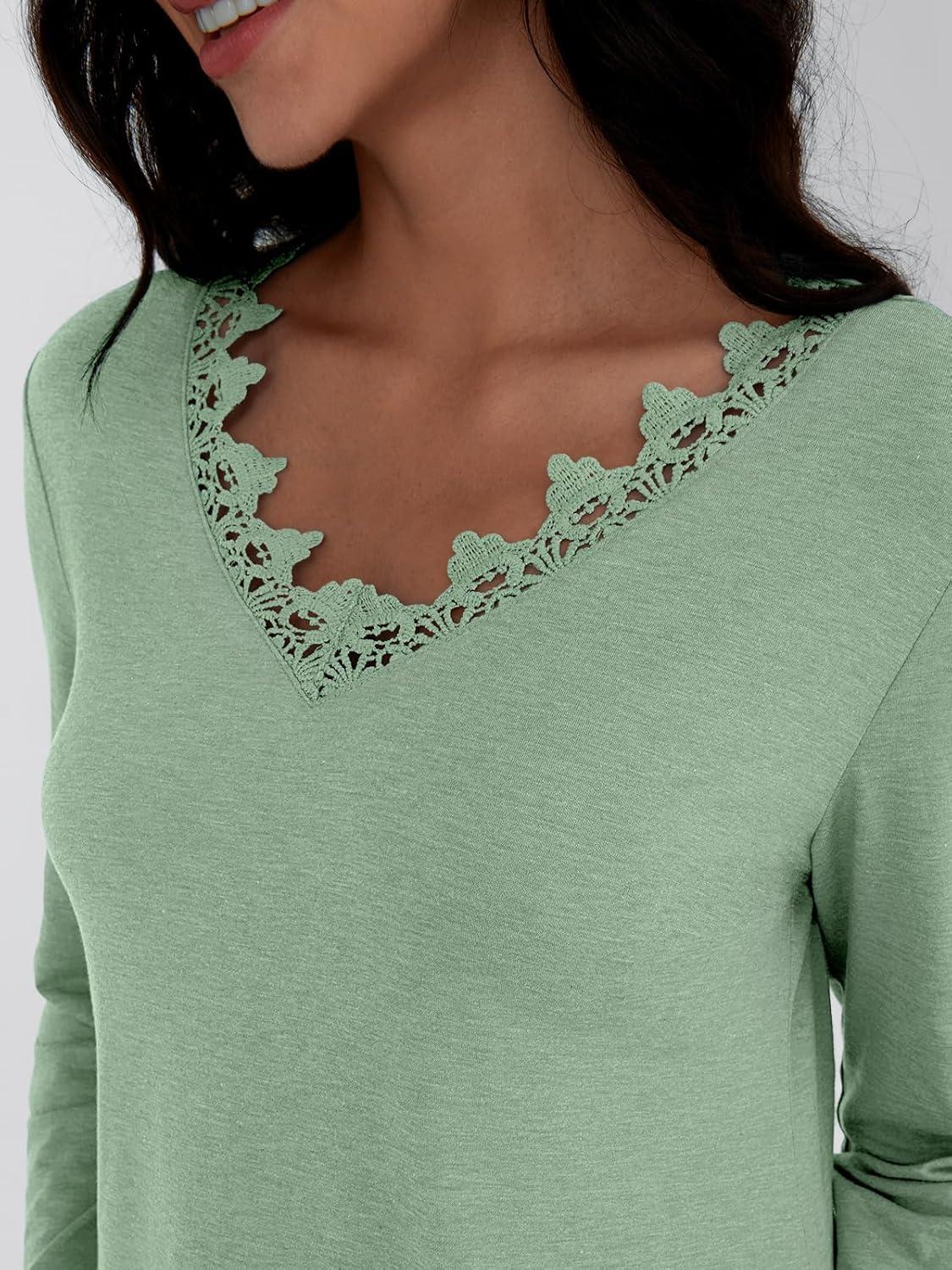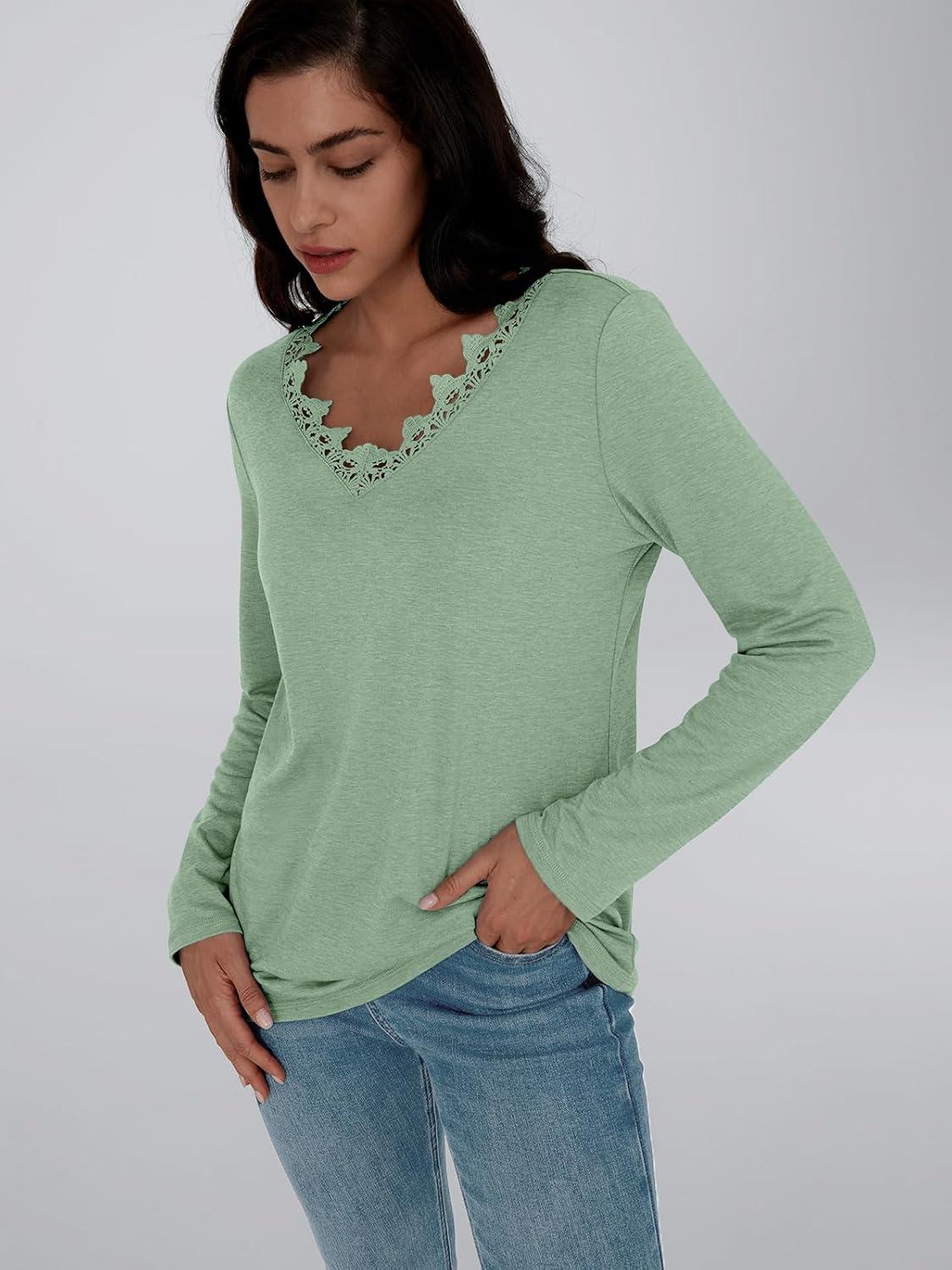 AUTOMET Long Sleeve Shirts for Women 2025 Fall Fashion Lace V Neck Loose Fit Casual Tops Trendy T Shirts Outfits Clothes(Light Green)