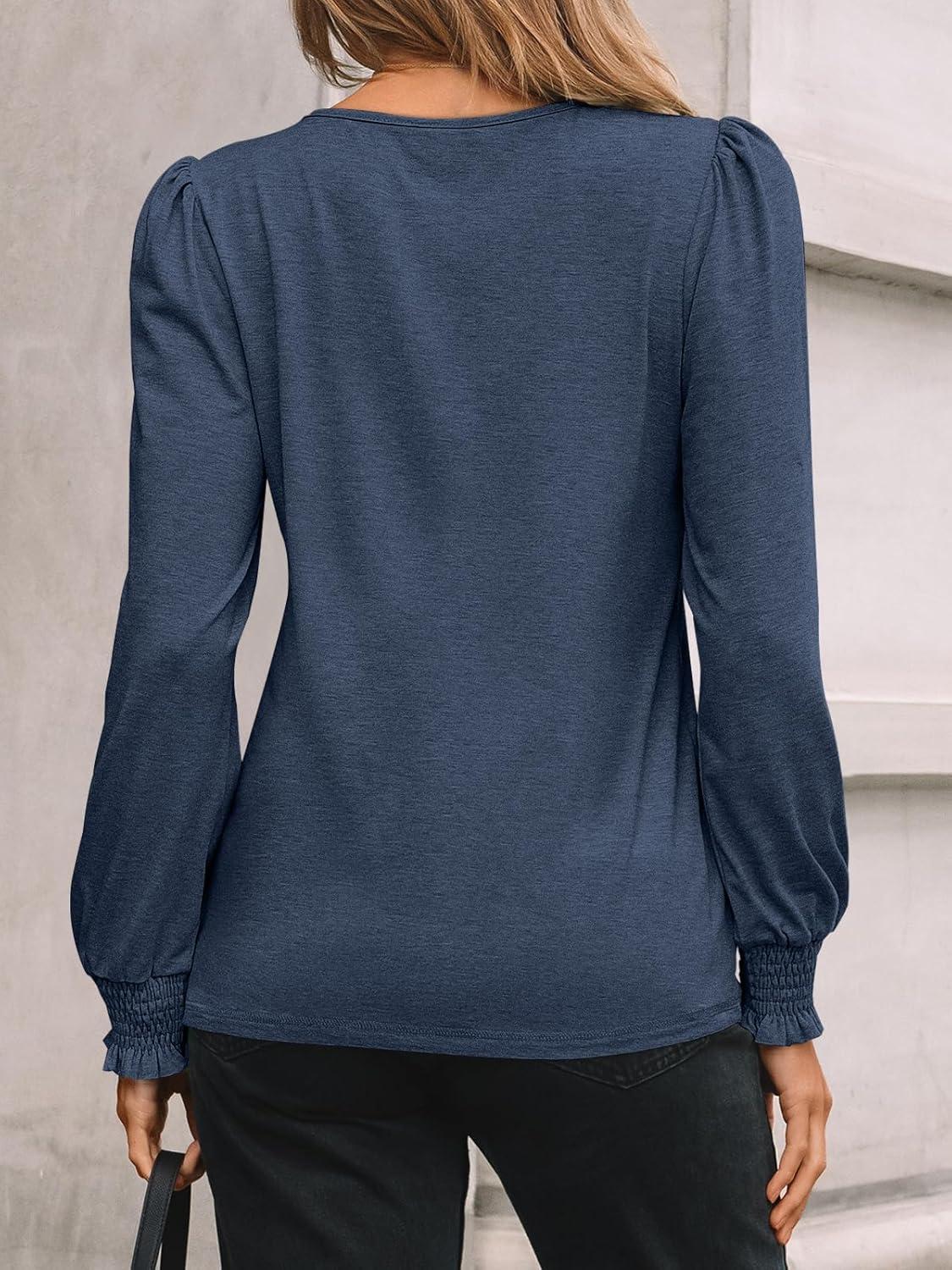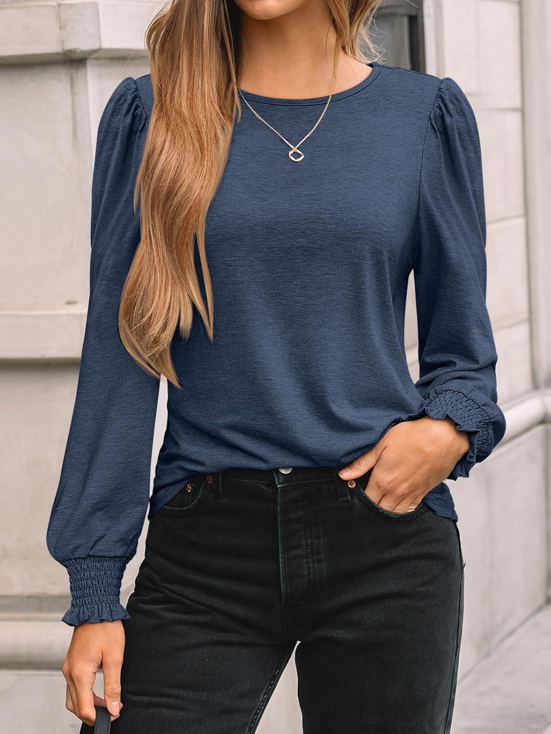 AUTOMET Long Sleeve Shirts for Women Business Casual Tops Dressy Blouses with Smocked Cuffs(Navy Blue)
