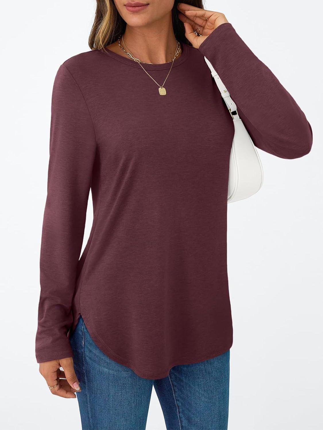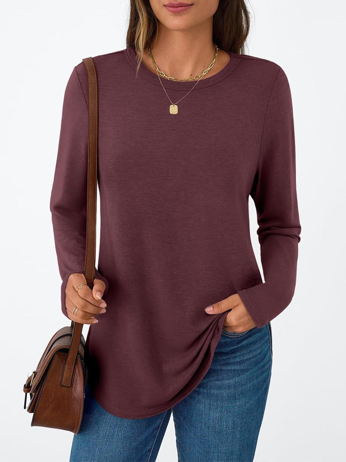 AUTOMET Long Sleeve Shirts for Women Casual Tops Loose Tunic Fashion 2025 Fall Crewneck Basic Tee(Winered)