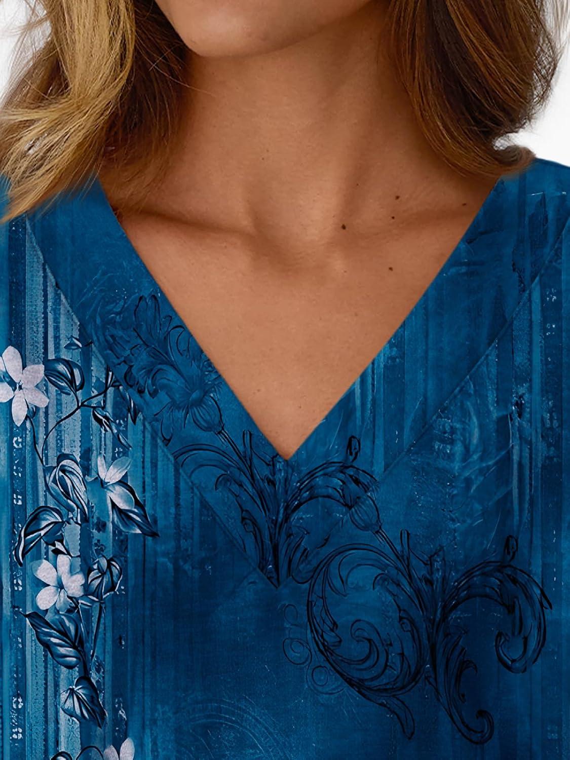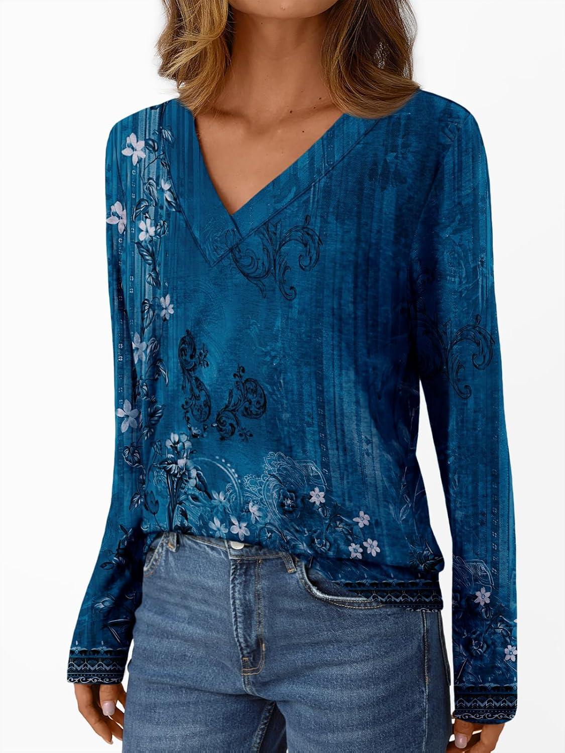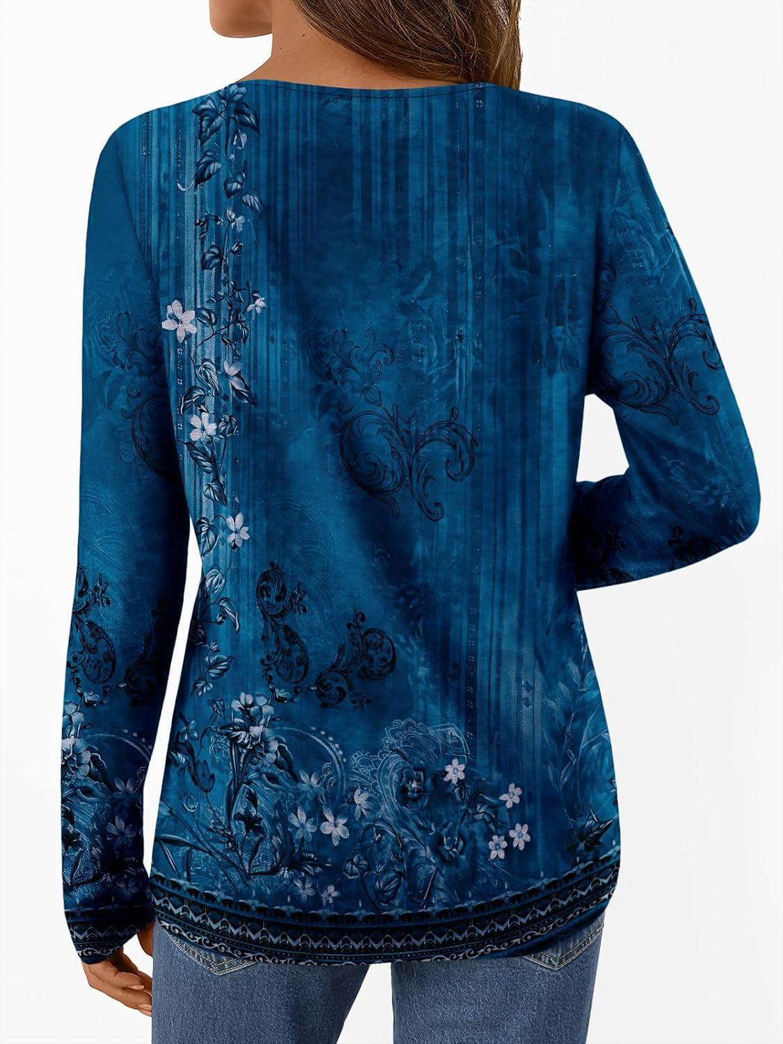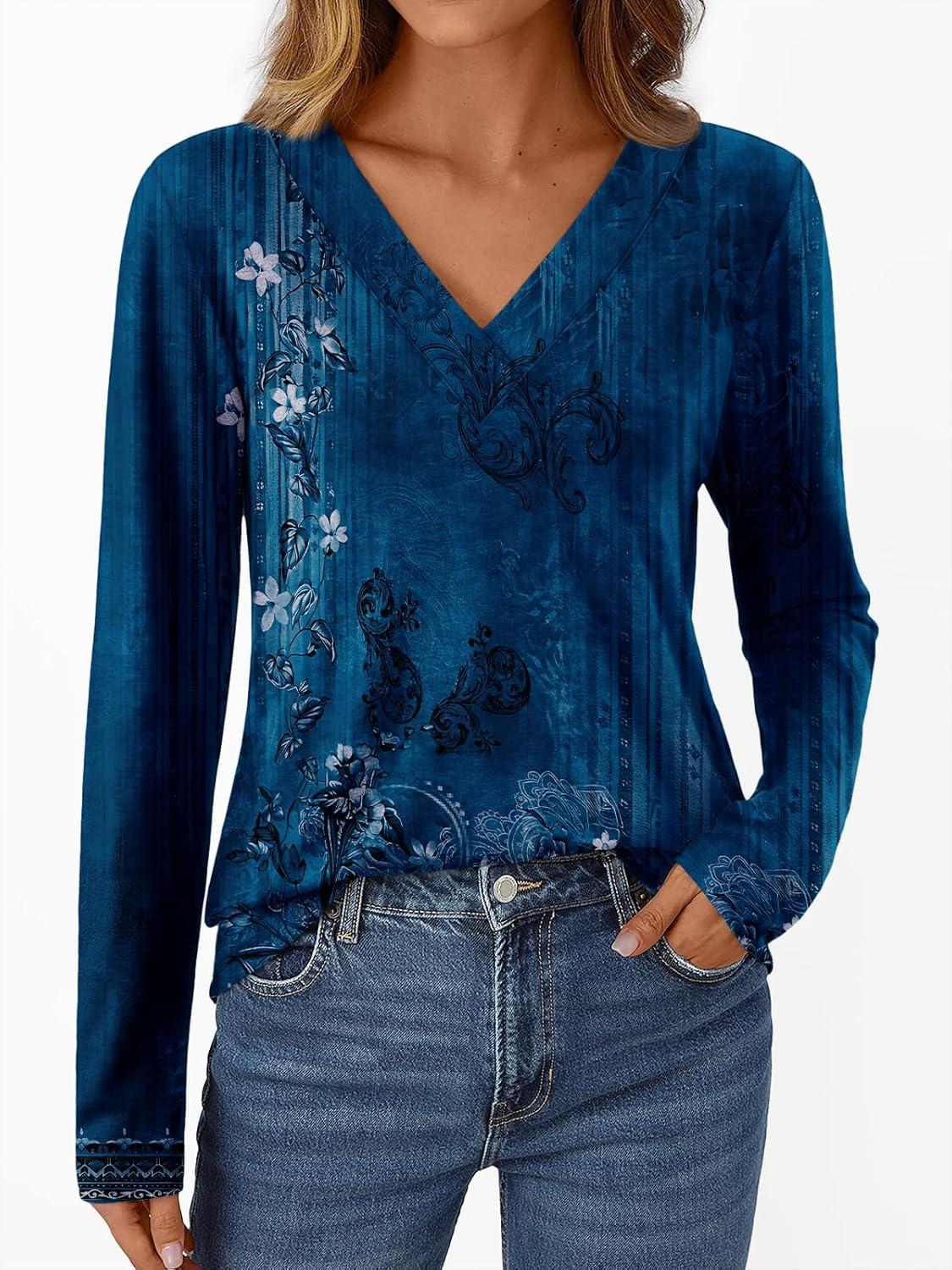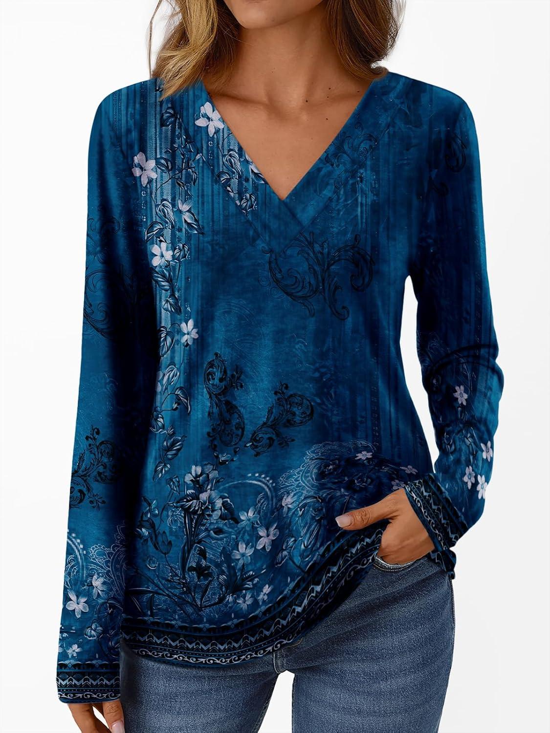 AUTOMET Long Sleeve Shirts for Women Tops V Neck Casual Top Comfortable Shirt Soft Basic Tees Women Blouses(Blue-print)