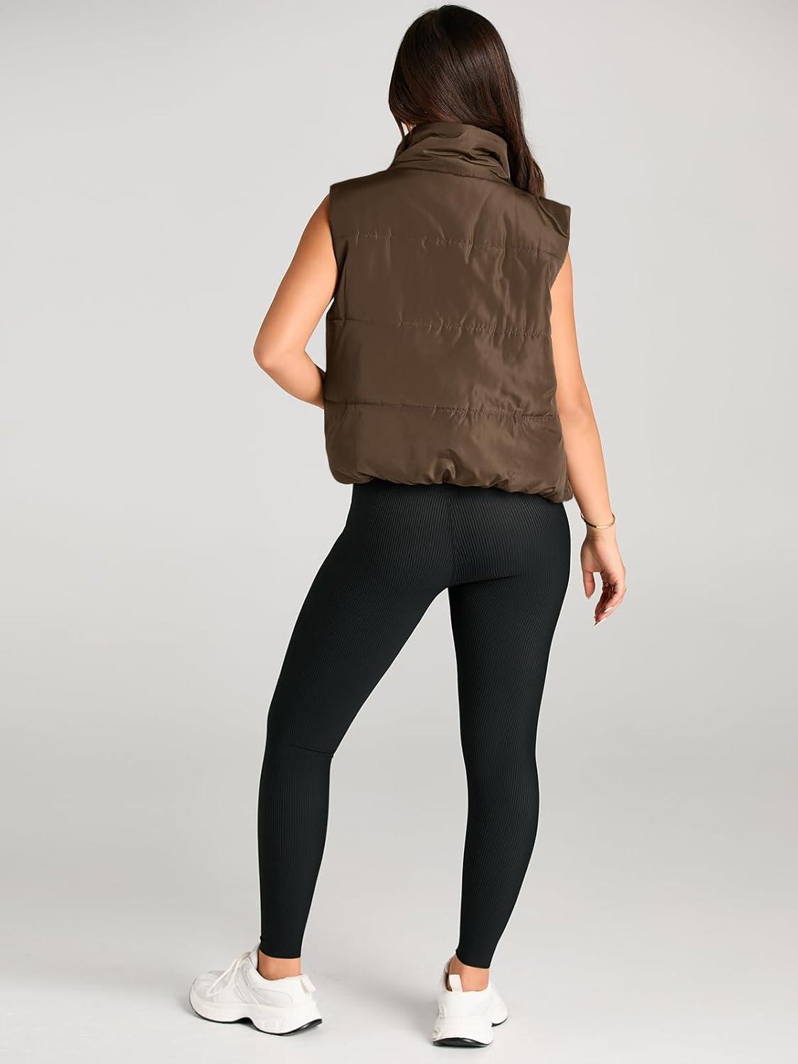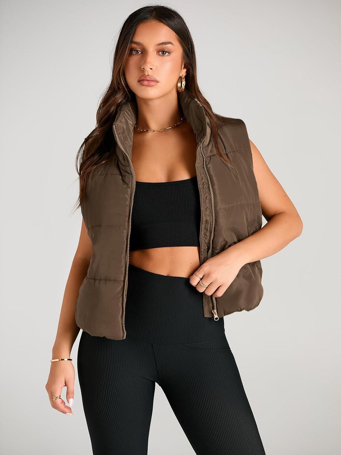 AUTOMET Puffer Vest Women Sleeveless Winter Cropped Outerwear Warm Puffy Lightweight Stand-up Collar Down with Pockets(Coffee)