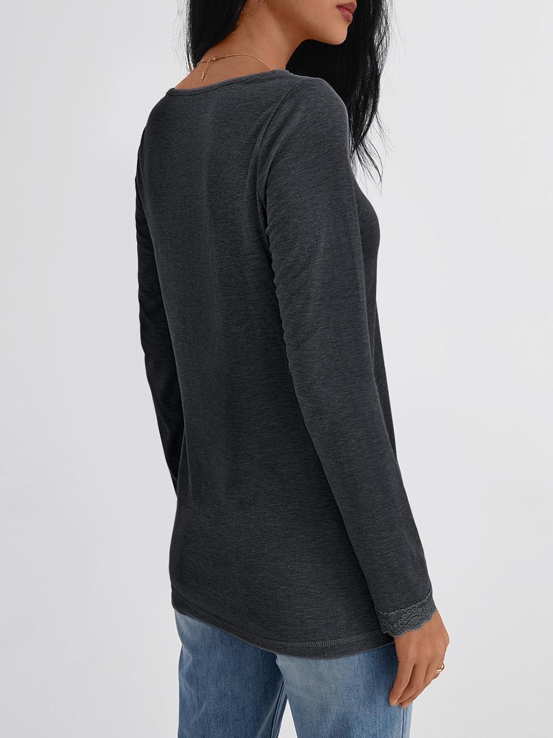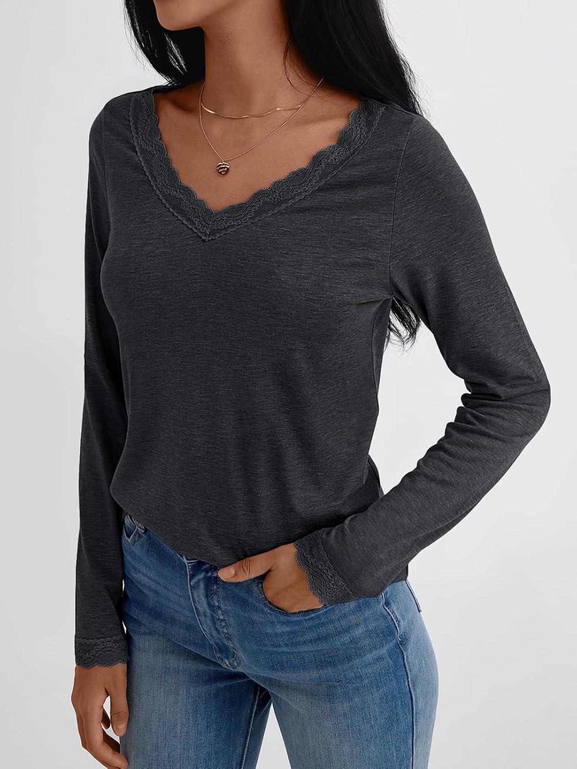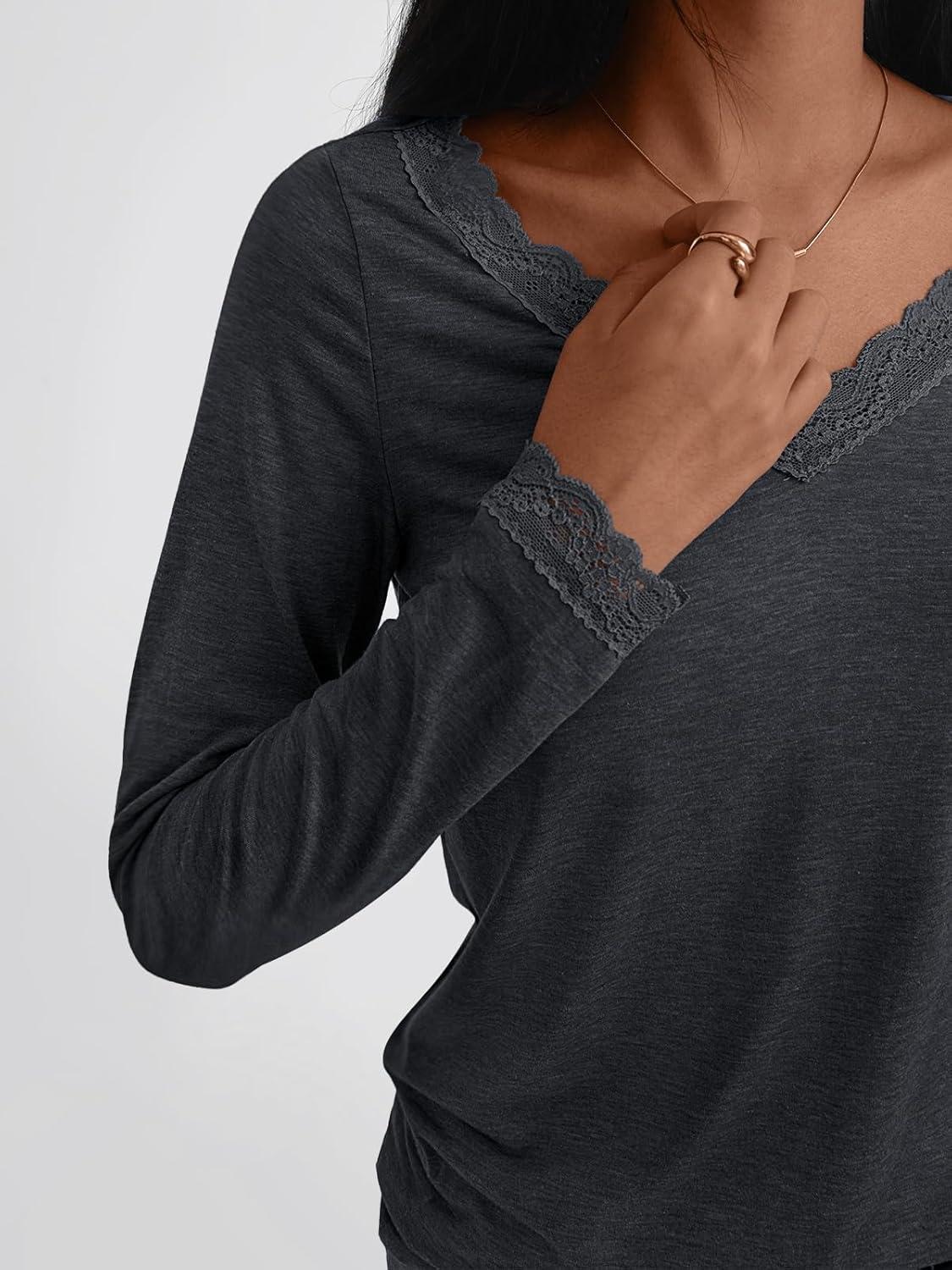imageAUTOMET V Neck T Shirts for Women Lace Long Sleeve Cute Tops Fall Winter Dressy Business Casual Blouses Trendy Basic TeesGrey