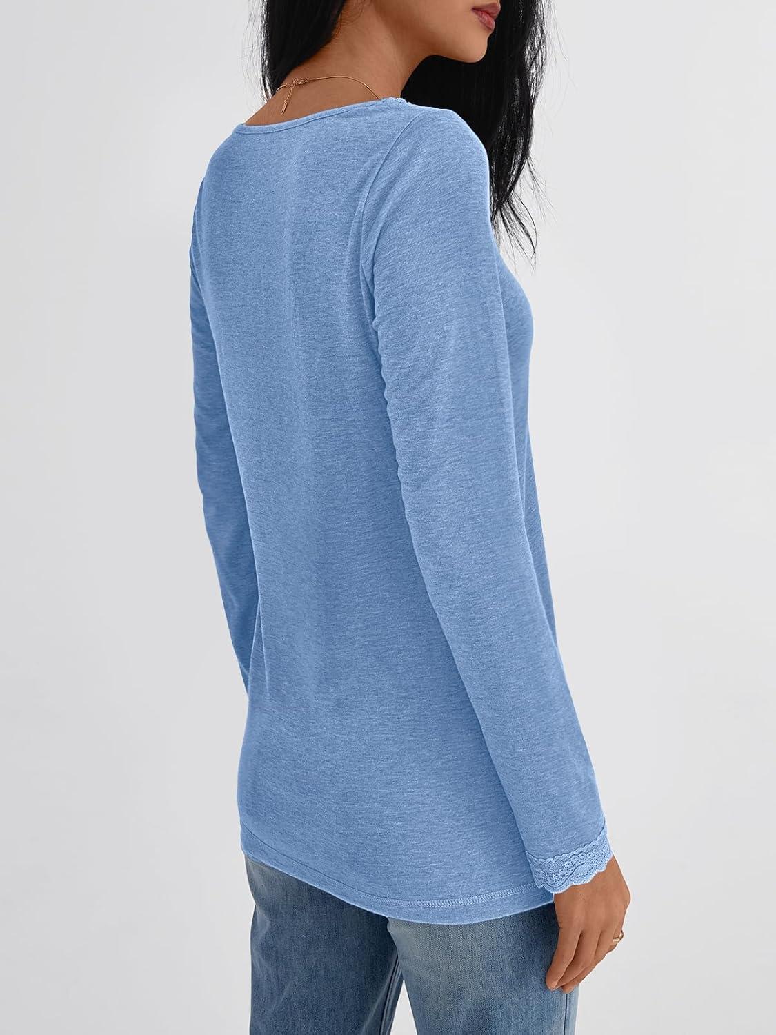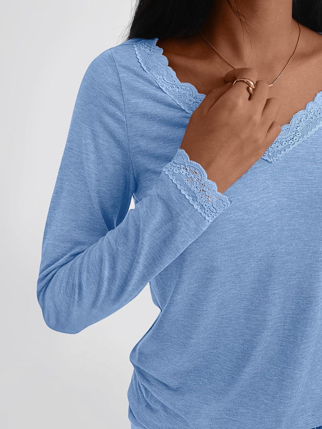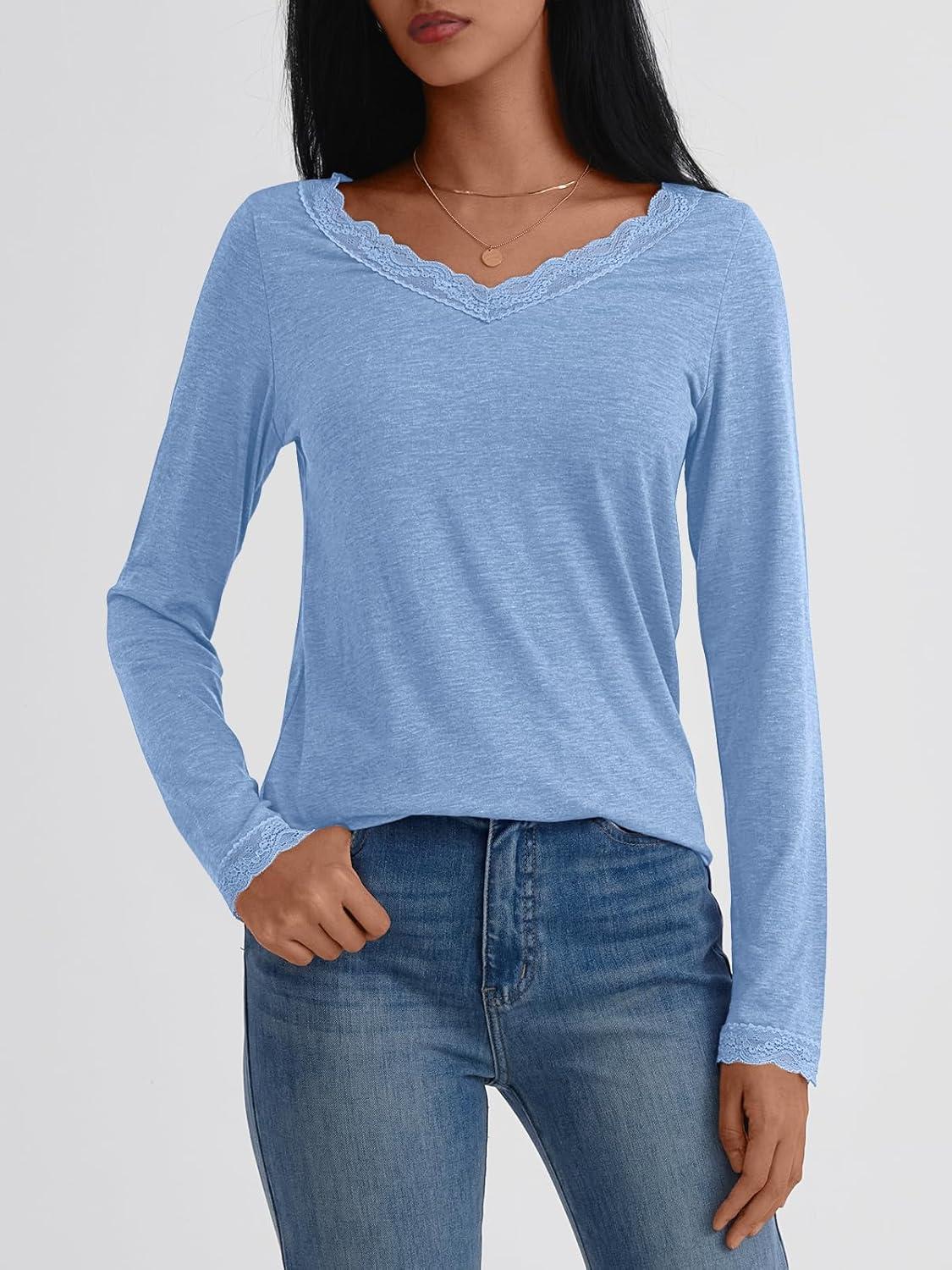 AUTOMET V Neck T Shirts for Women Lace Long Sleeve Cute Tops Fall Winter Dressy Business Casual Blouses Trendy Basic Tees(Skyblue)