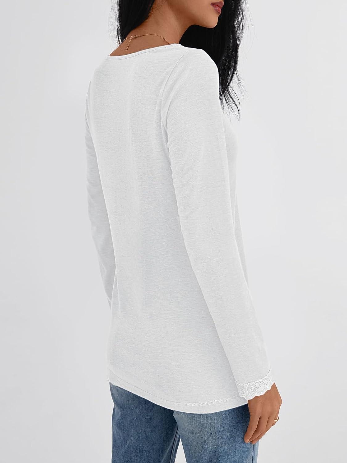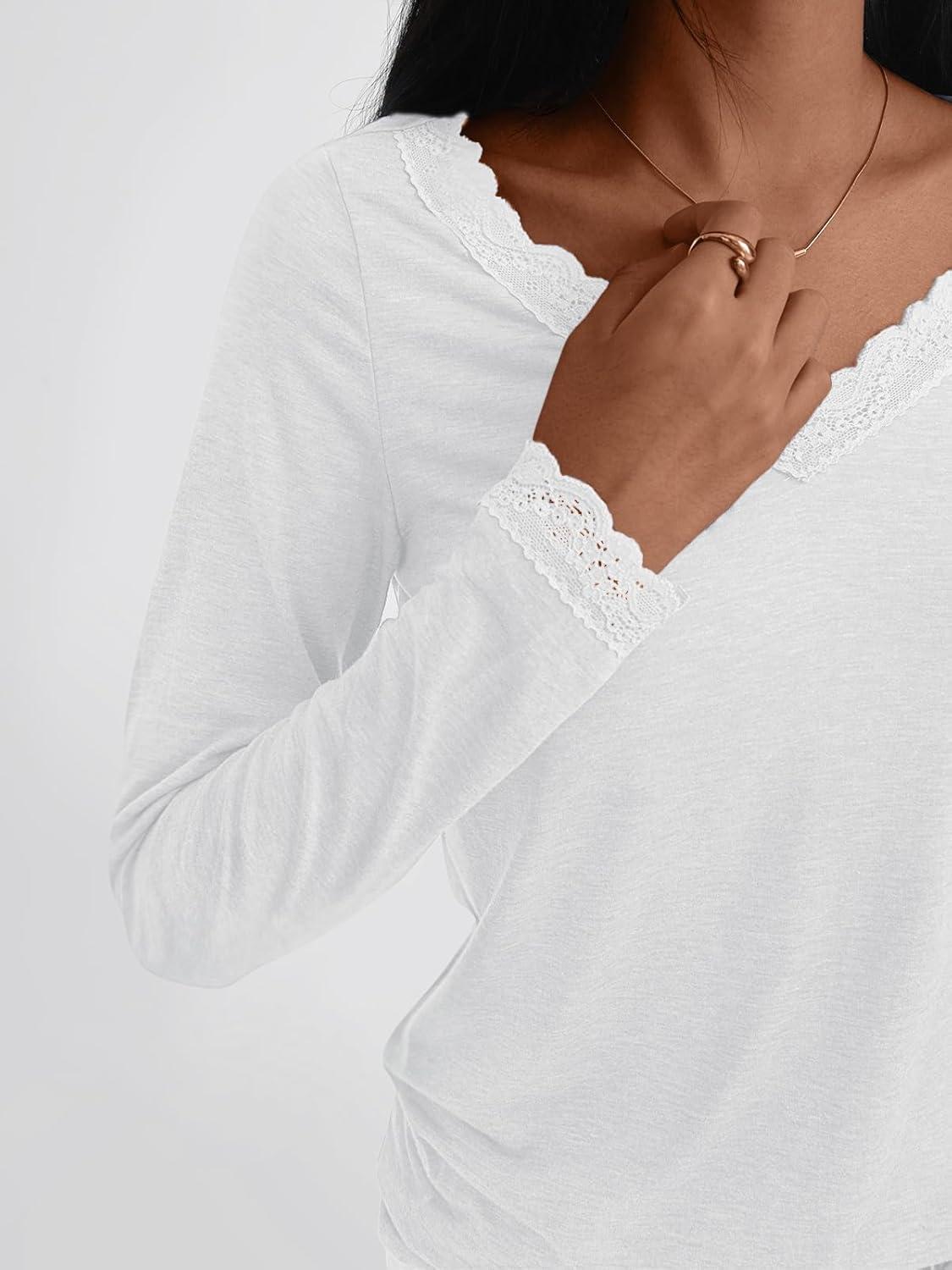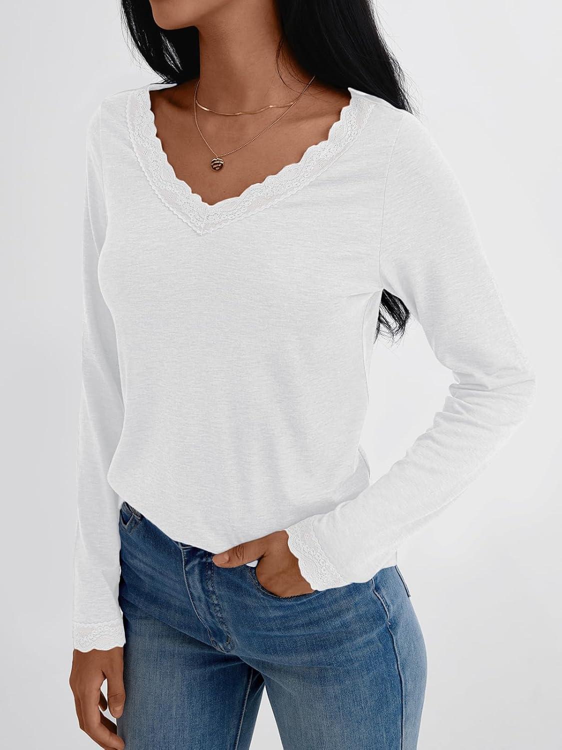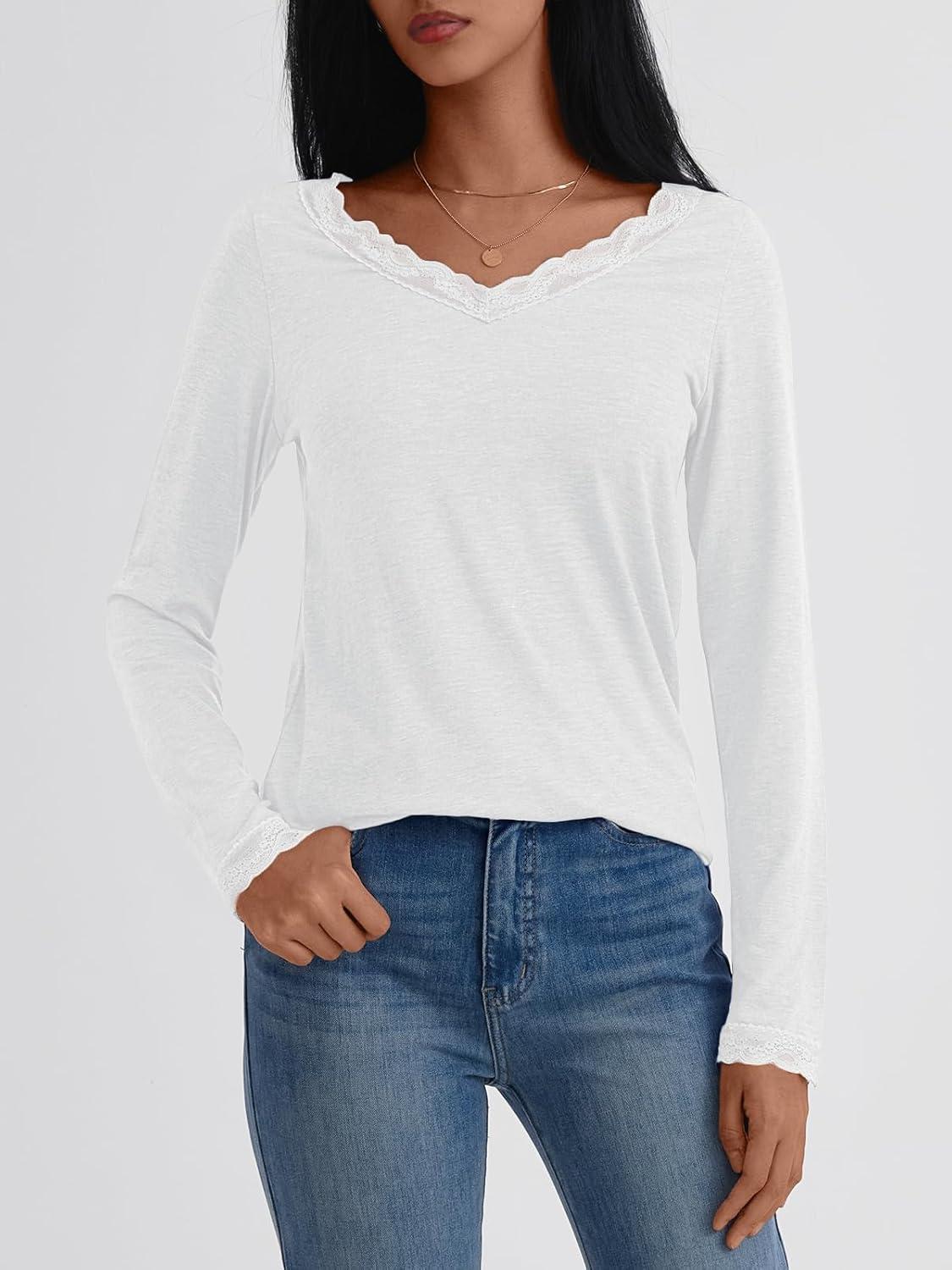 AUTOMET V Neck T Shirts for Women Lace Long Sleeve Cute Tops Fall Winter Dressy Business Casual Blouses Trendy Basic Tees(White)
