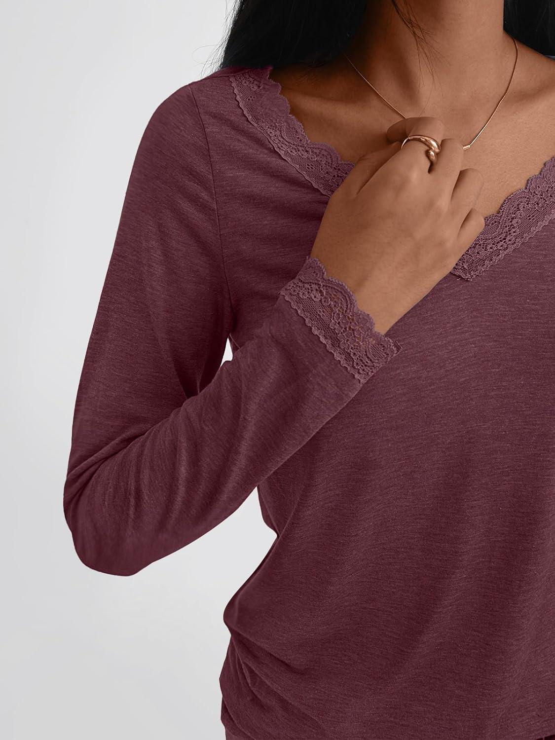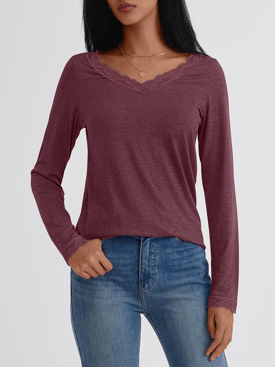 AUTOMET V Neck T Shirts for Women Lace Long Sleeve Cute Tops Fall Winter Dressy Business Casual Blouses Trendy Basic Tees(Winered)