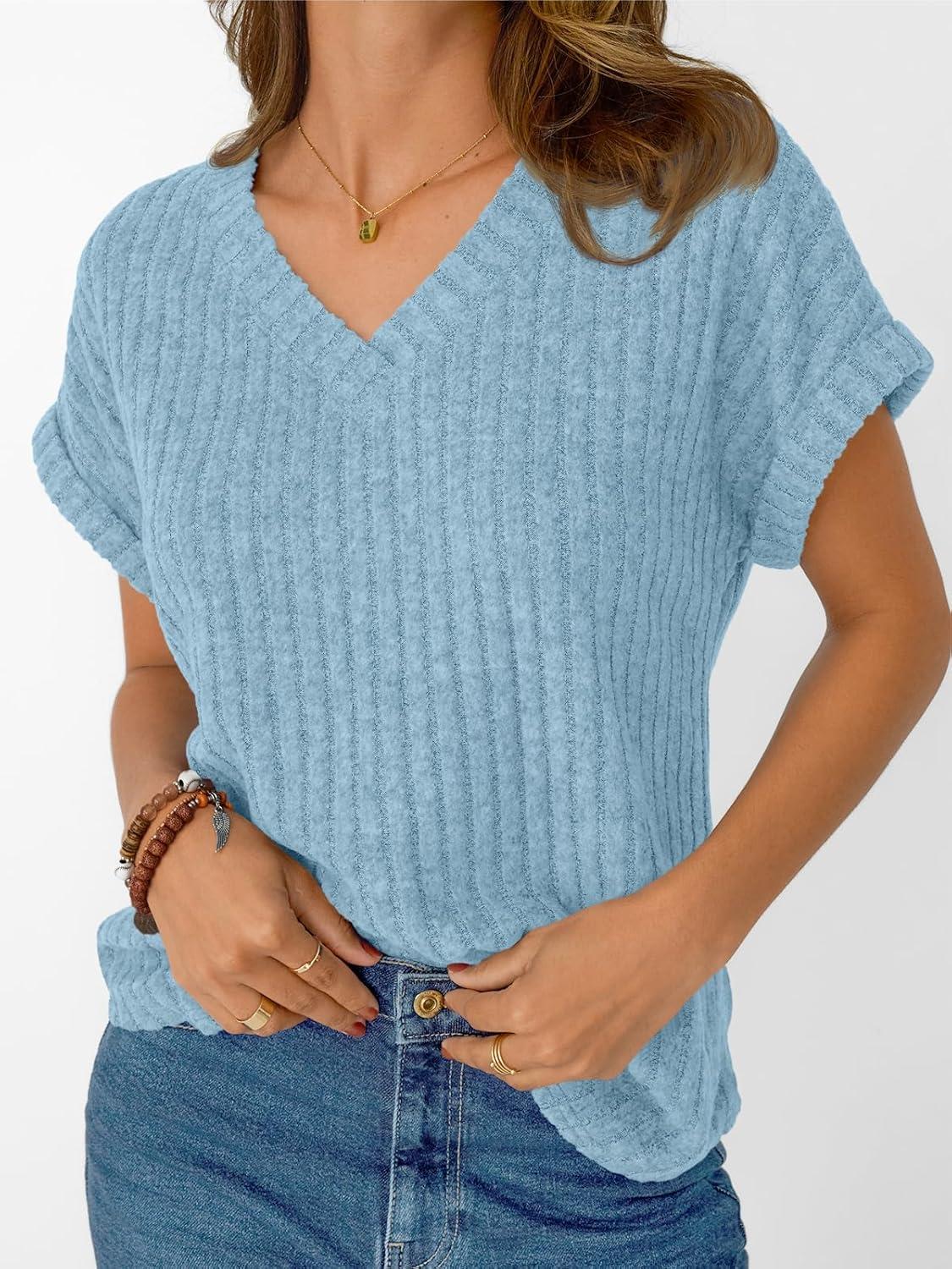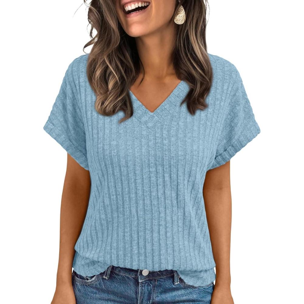 AUTOMET Women Tops Summer Sweaters Short Sleeve V Neck Shirts 2025 Spring Fashion Dressy Casual Business Tunic Blouses(Skyblue)