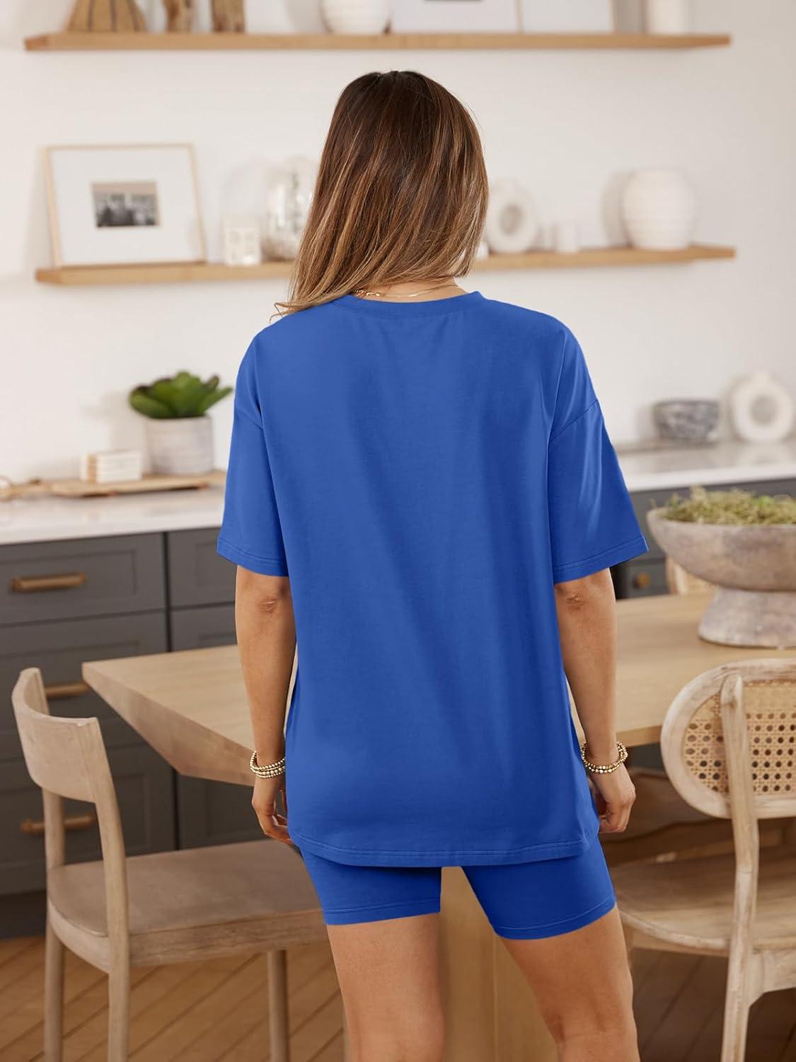 AUTOMET Womens 2 Piece Sets Summer Outfits 2025 Two Piece Lounge Set Matching Clothing Oversized Tshirts Biker Short Fashion(Blue)