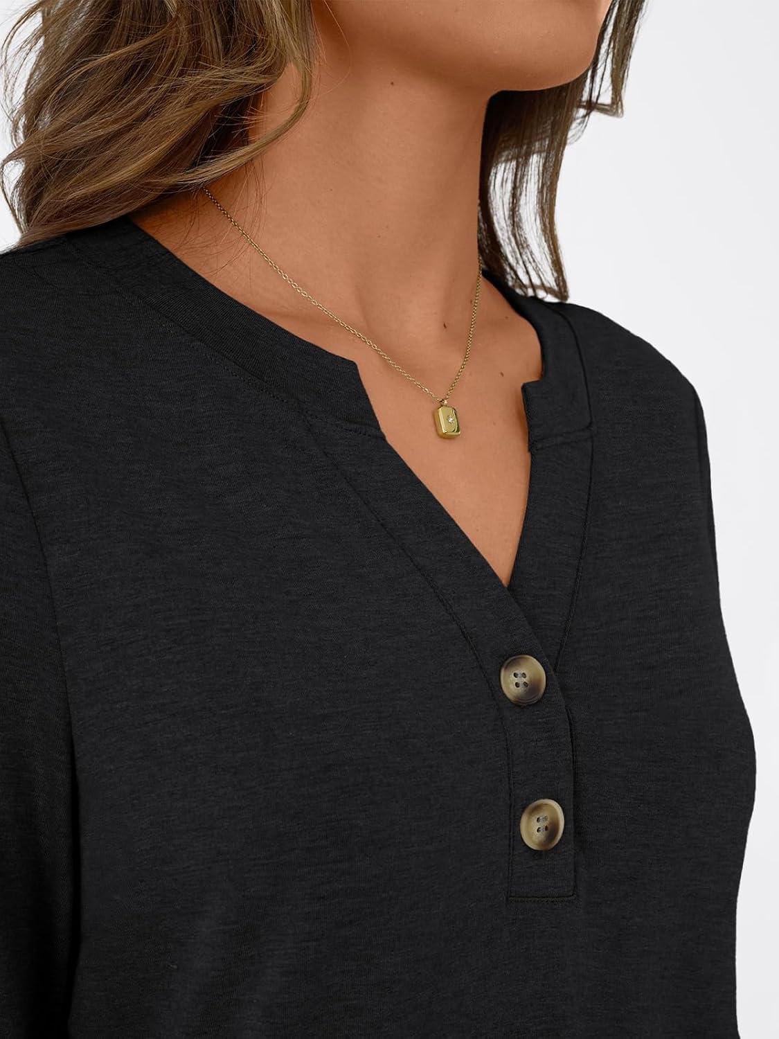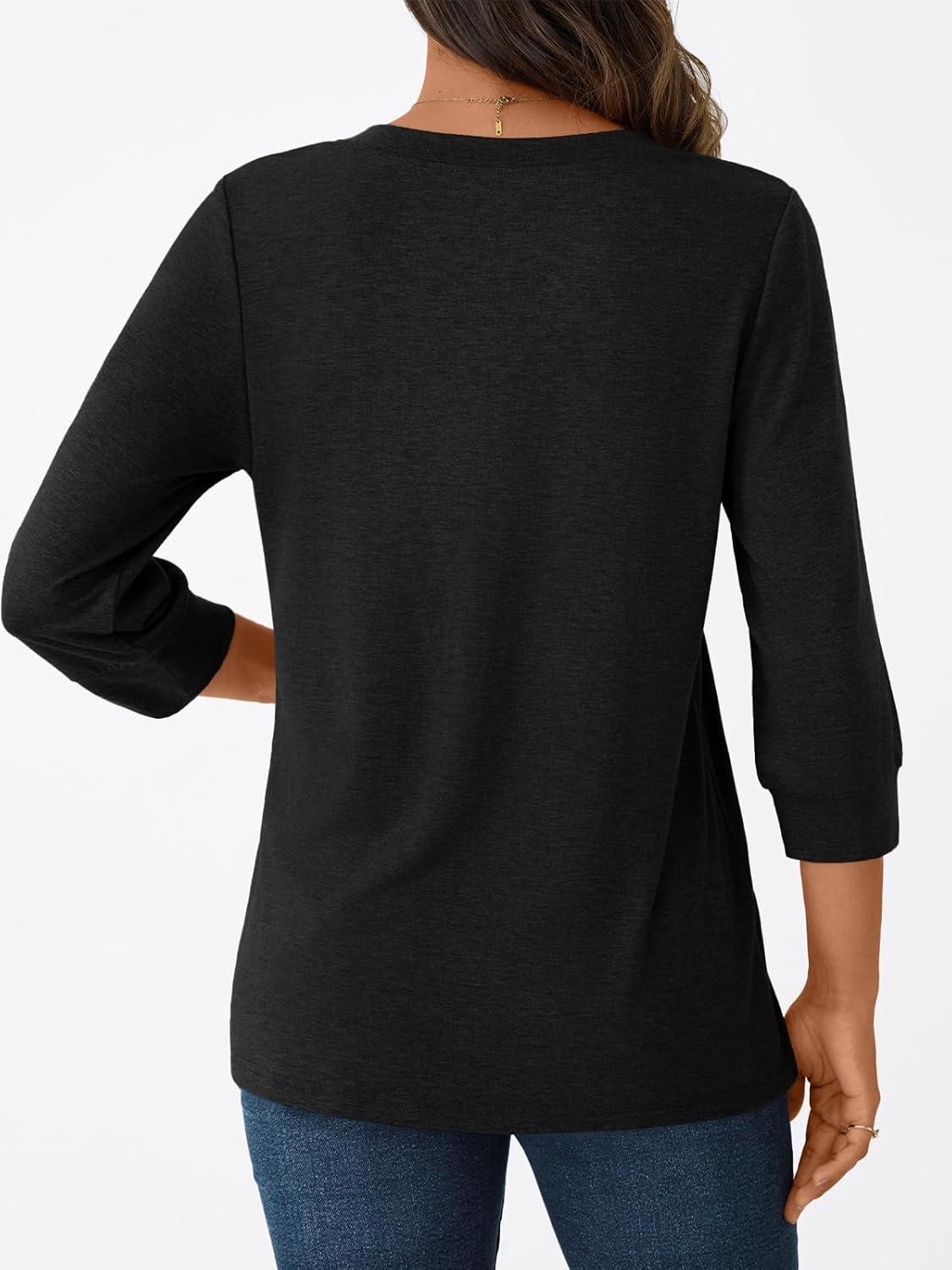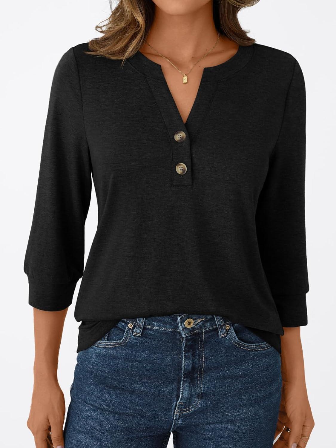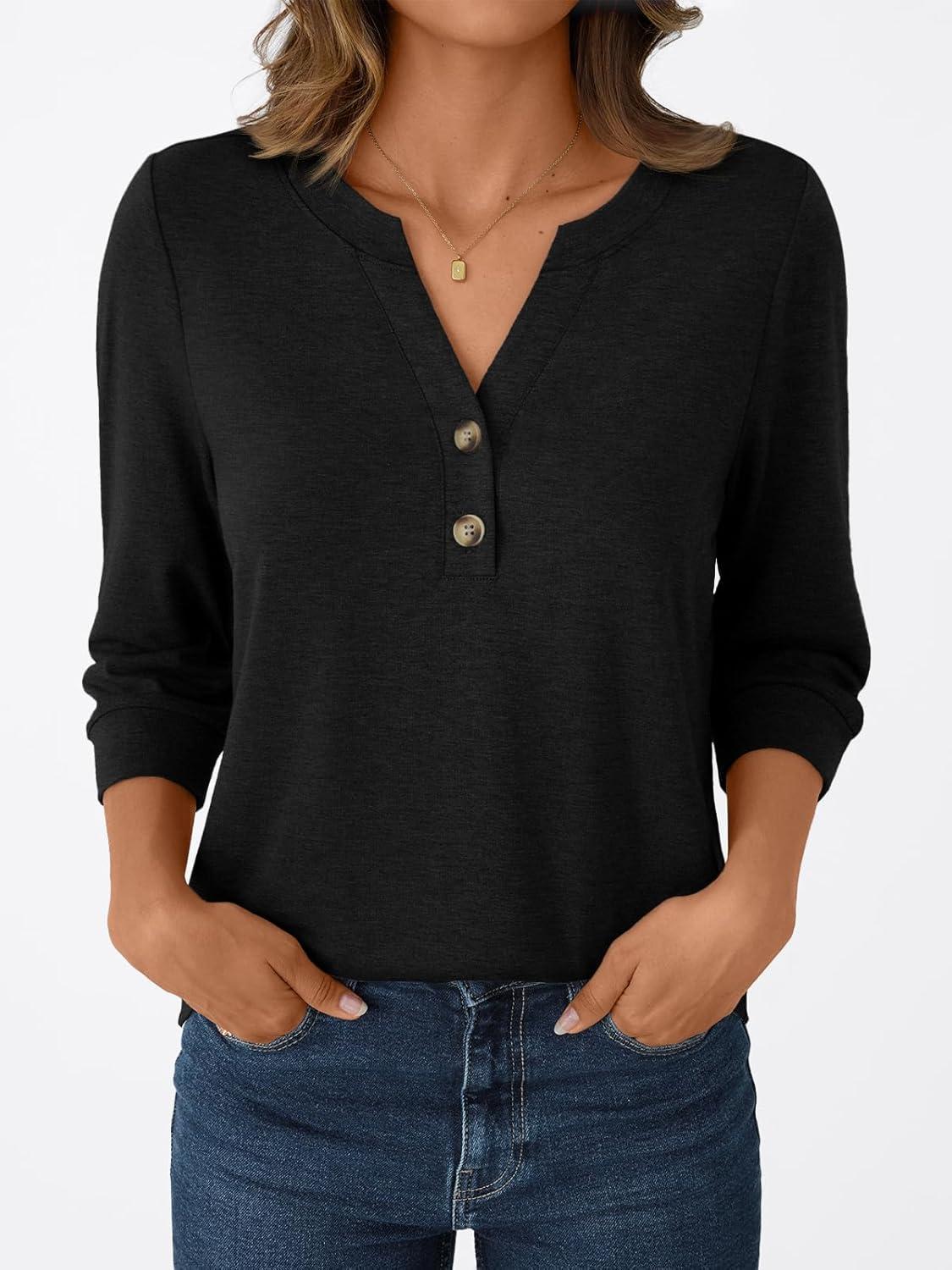 AUTOMET Womens Blouses Henley V Neck Shirts 3/4 Length Sleeve Summer Tops(Black)