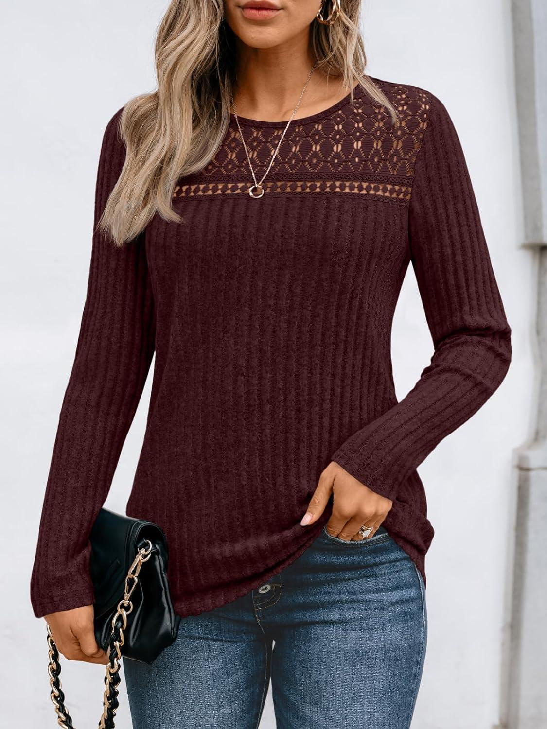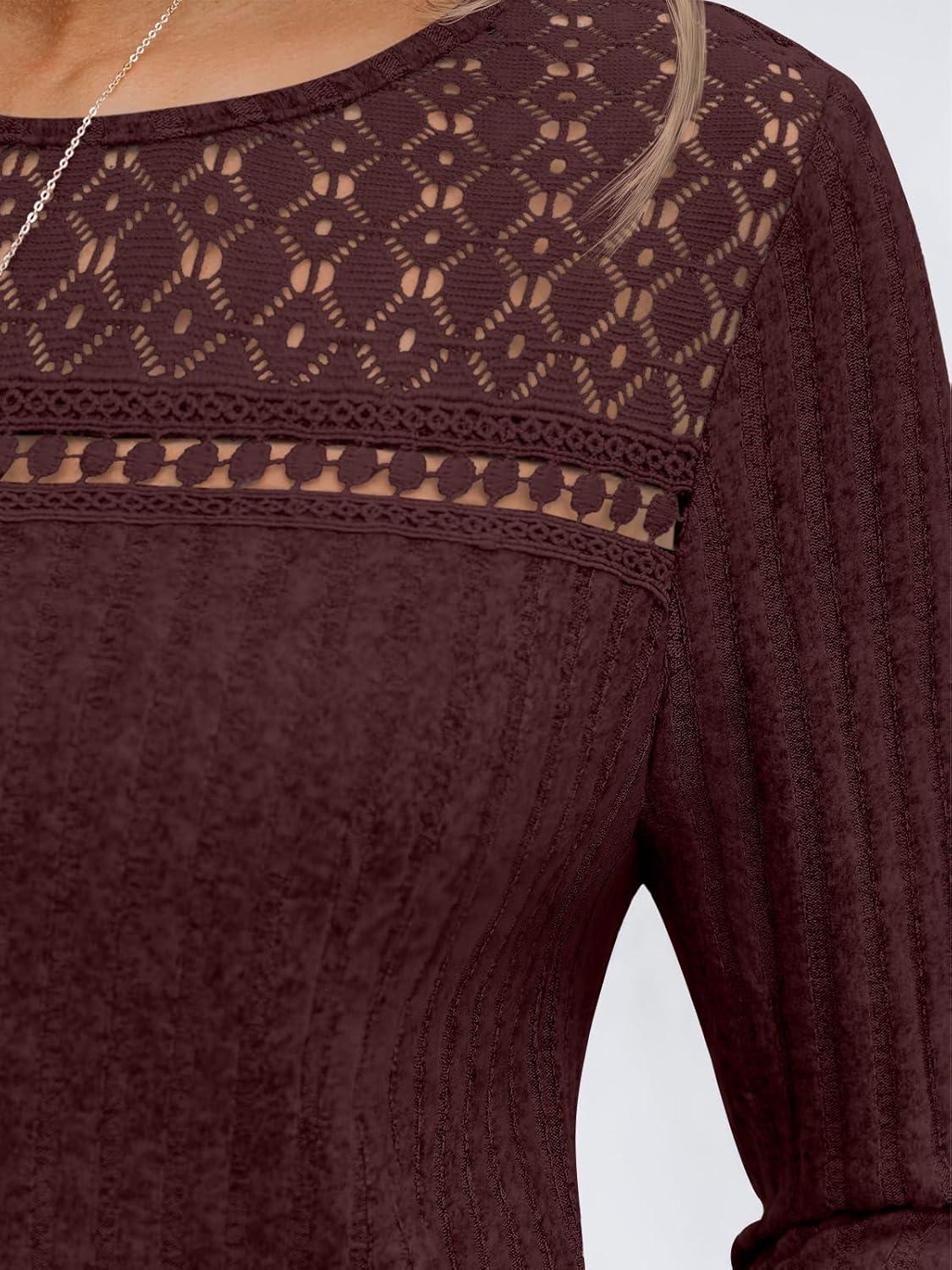 AUTOMET Womens Lace Long Sleeve Shirt Fall Top Fashion Dreesy Casual Tunic Sweaters Mesh Clothes Trendy Work Cute Outfits(Maroon)