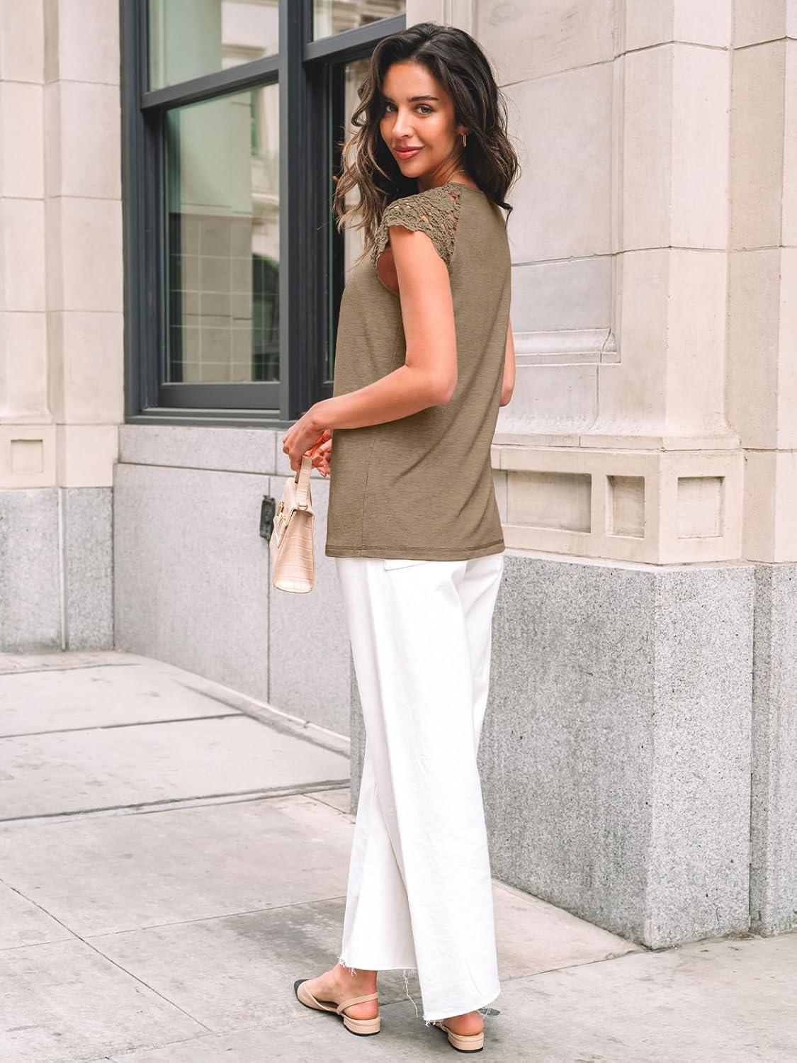 AUTOMET Womens Lace Tops Pleated Short Sleeve Shirts Summer Business Casual Dressy Blouses(Khaki)