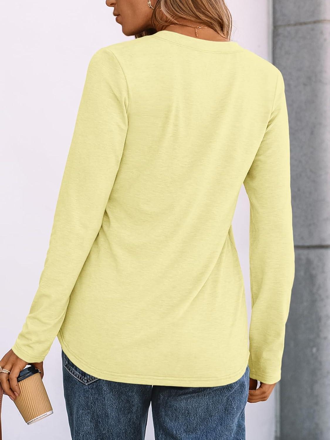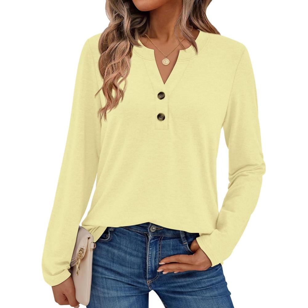 AUTOMET Women's Long Sleeve Shirts 2025 Fall Fashion Dressy Casual Tops Trendy Henley Blouses Cute Work Outfits Clothes(Butter Yellow)