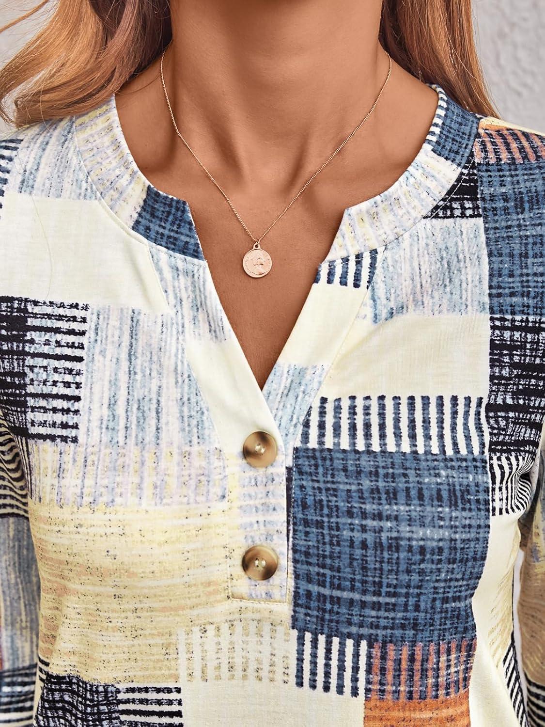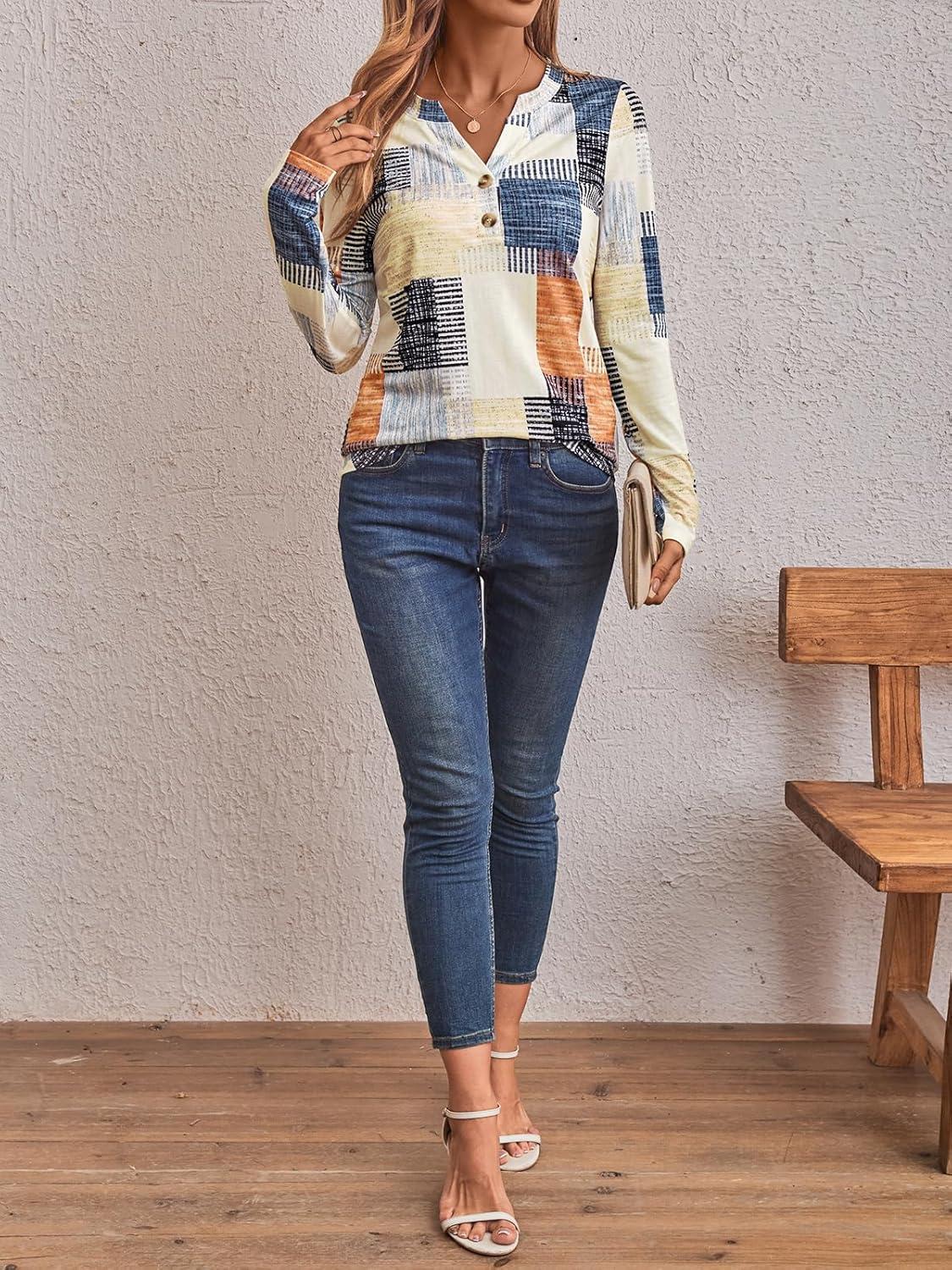 AUTOMET Women’s Long Sleeve Shirts 2025 Fall Fashion Dressy Casual Tops Trendy Henley Blouses Cute Work Outfits Clothes(Plaid Multi)