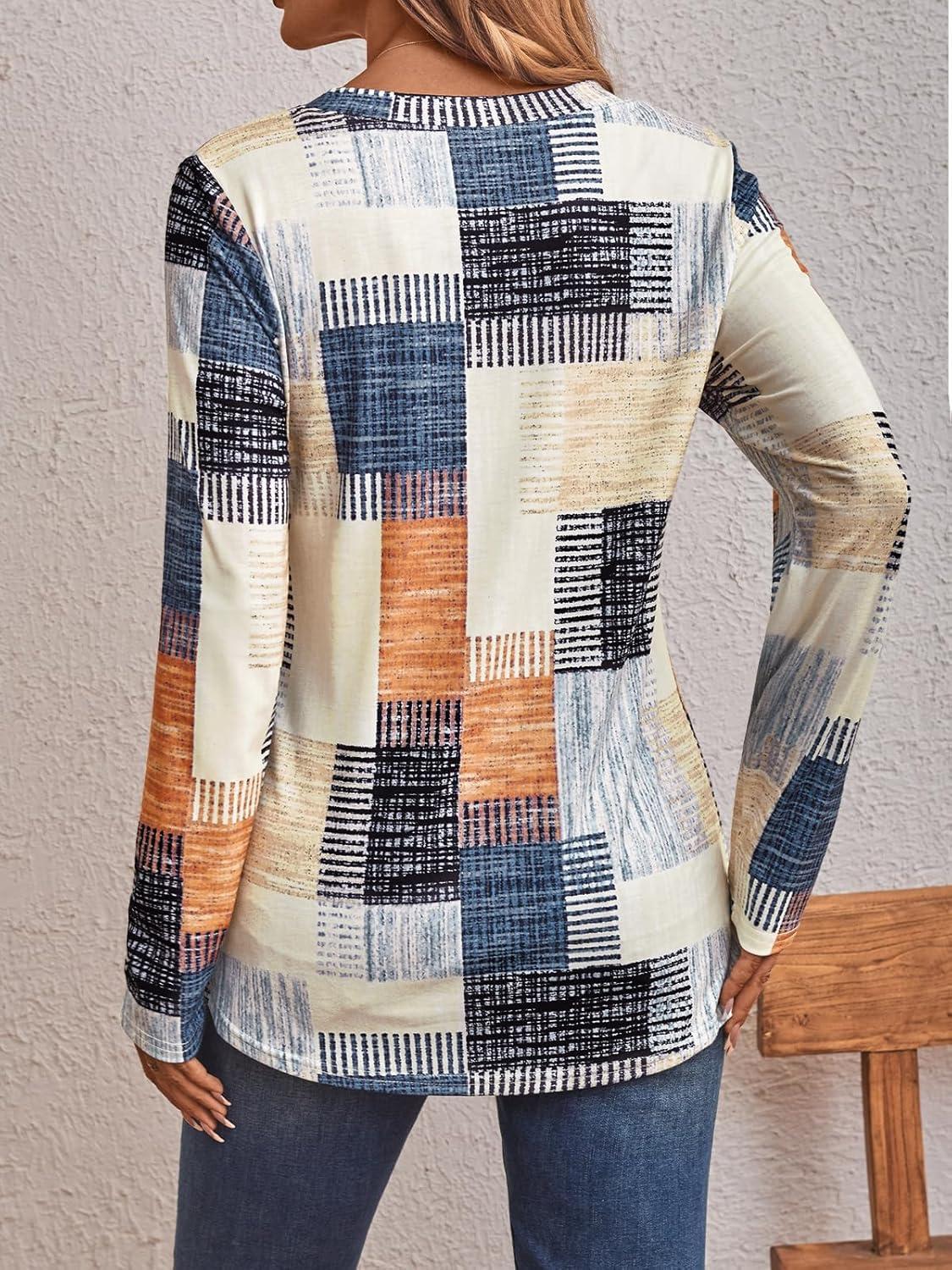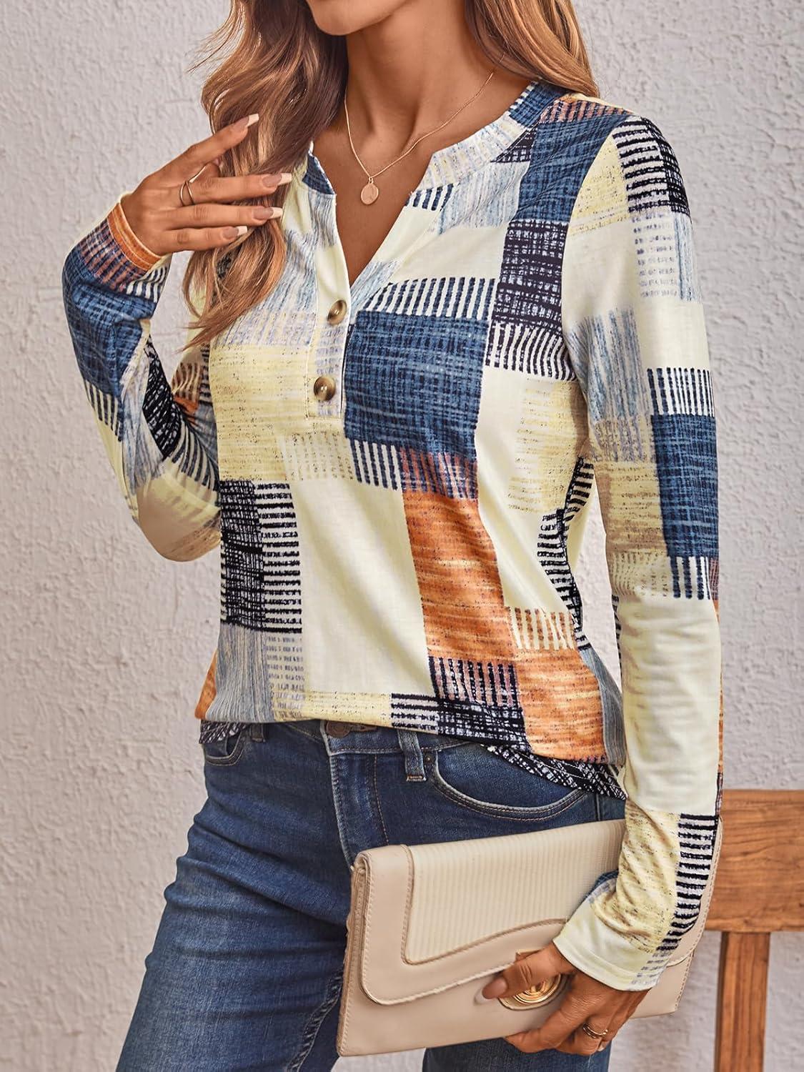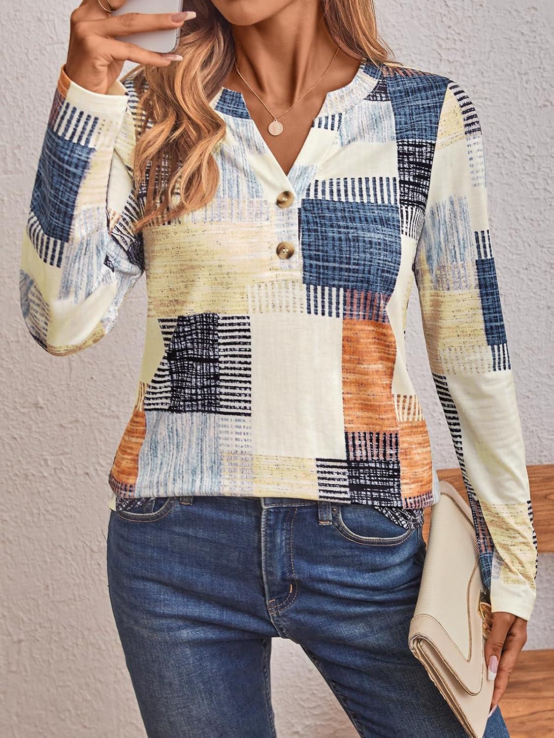 AUTOMET Women's Long Sleeve Shirts 2025 Fall Fashion Dressy Casual Tops Trendy Henley Blouses Cute Work Outfits Clothes(Plaid Multi)