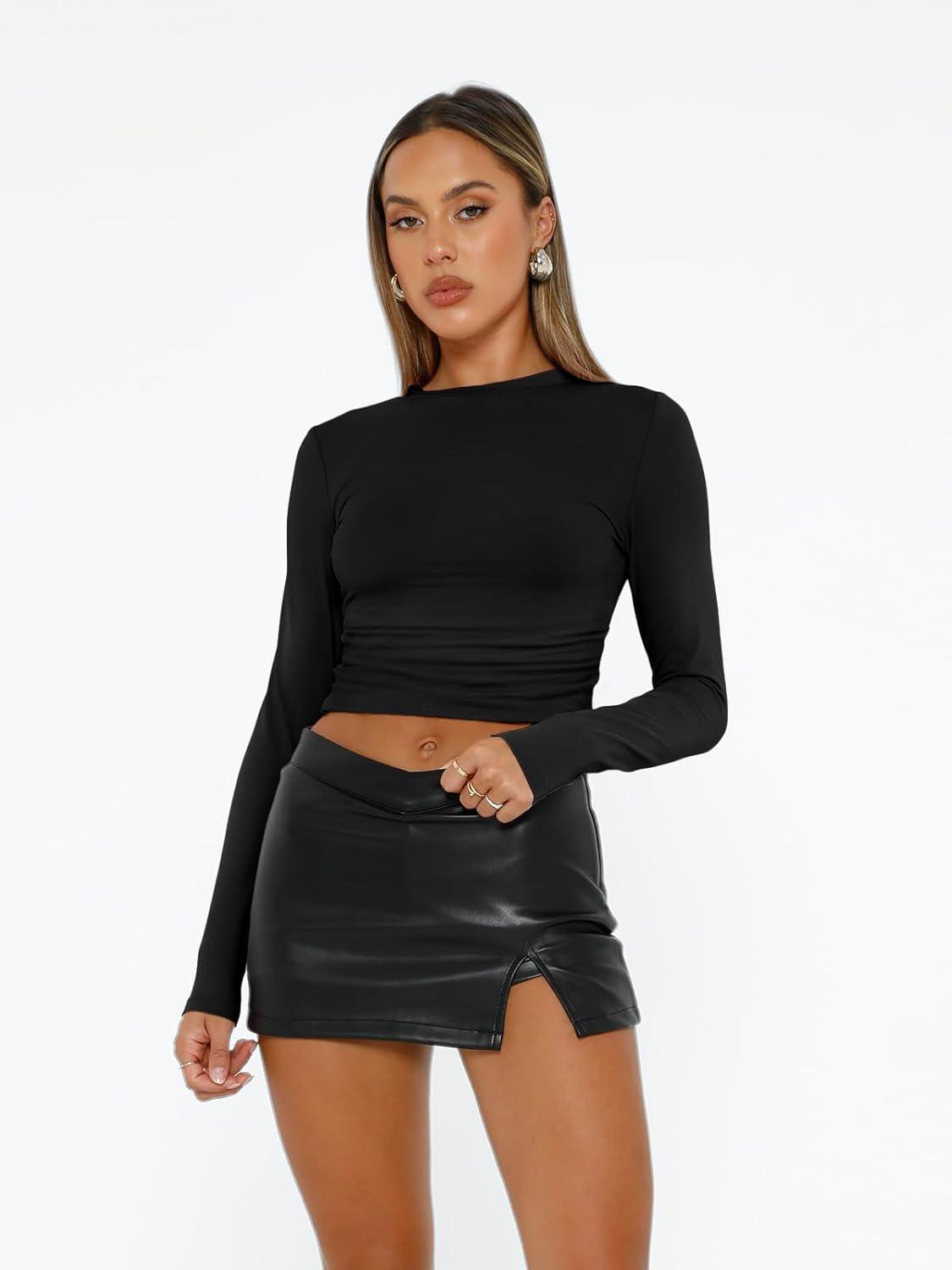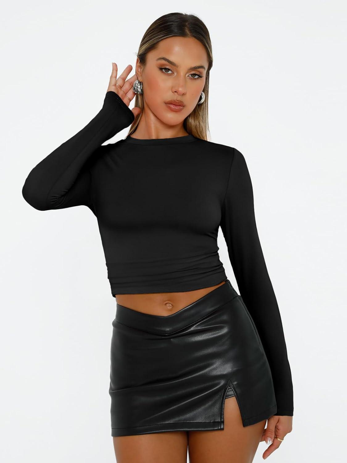 AUTOMET Womens Long Sleeve Shirts Basic Compression Going Out Crop Tops Fall Fashion Y2K Clothes 2025(Black)