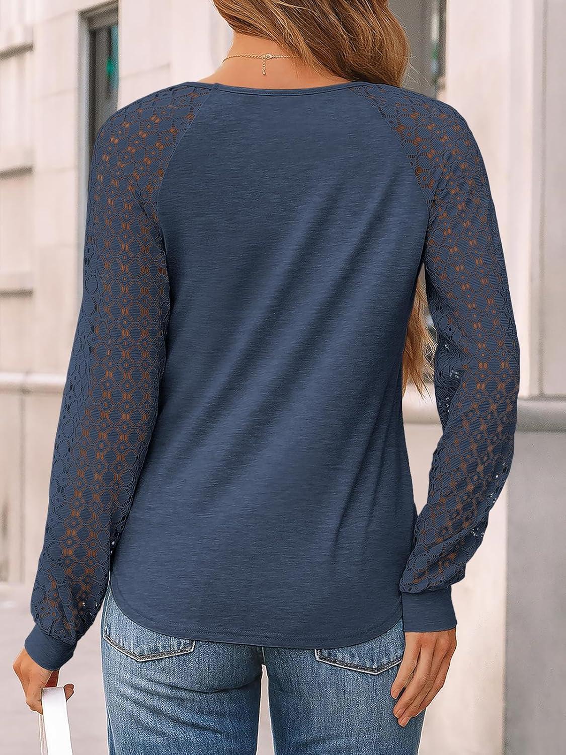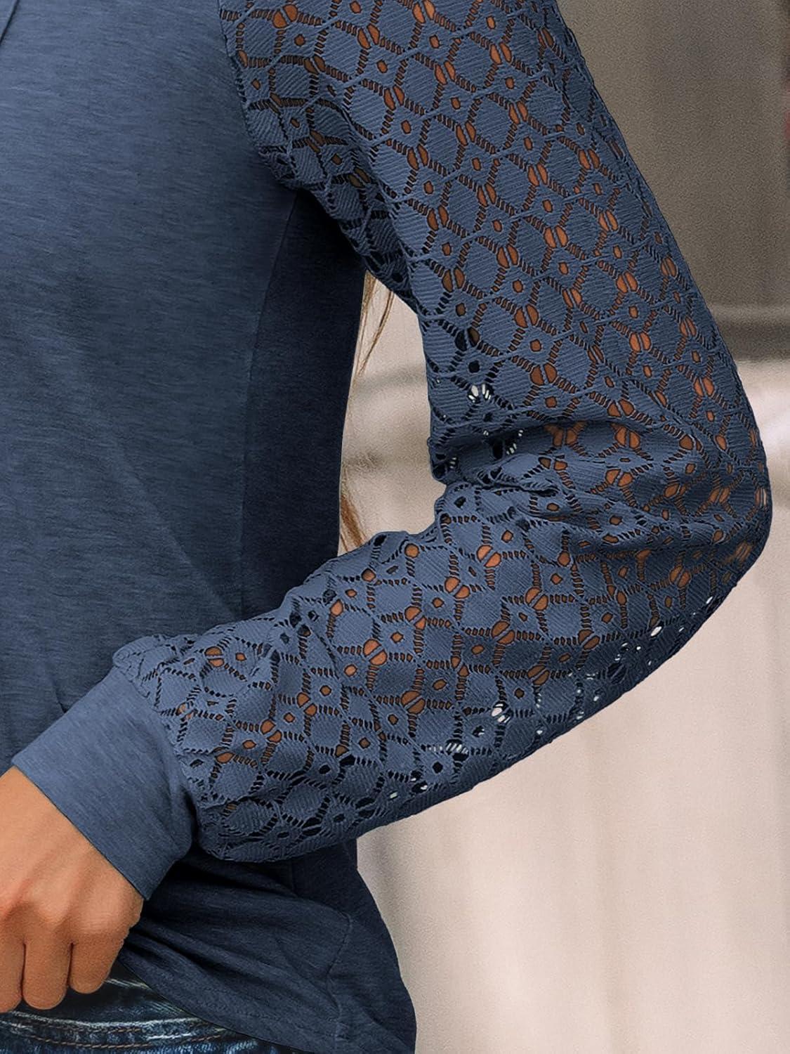 AUTOMET Womens Long Sleeve Shirts Business Casual Dressy Tops Lace Crewneck Work Trendy Fall Fashion Outfits Clothes(Darkblue)
