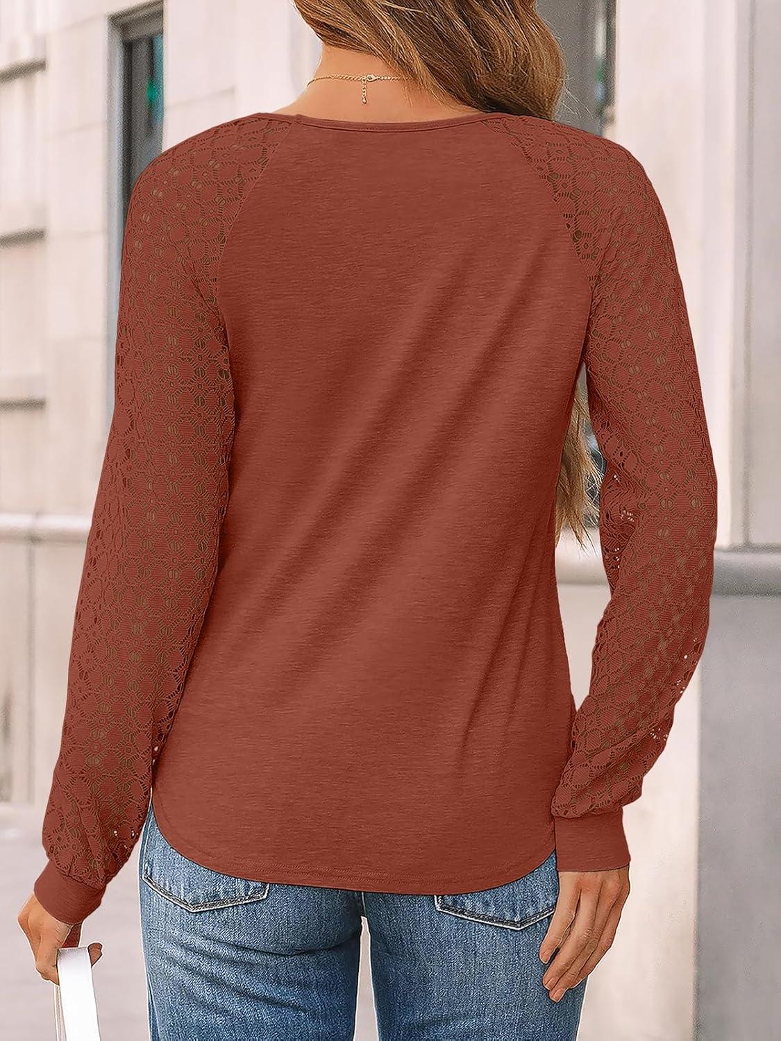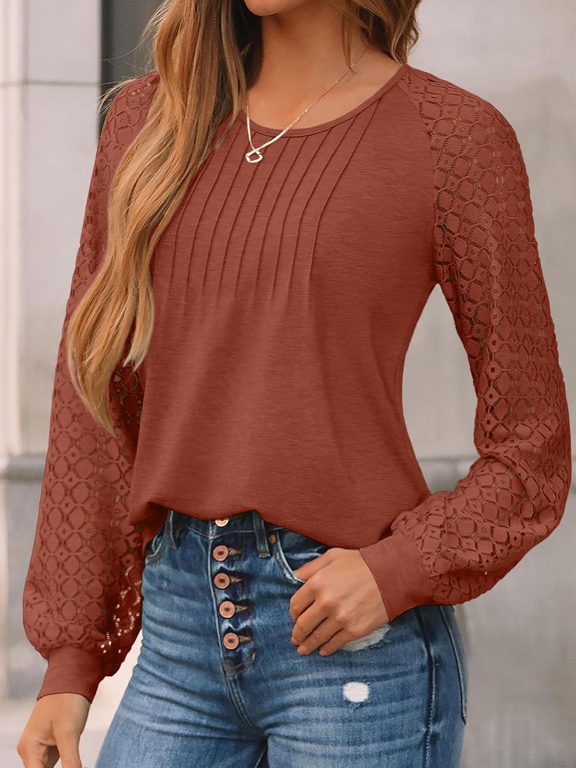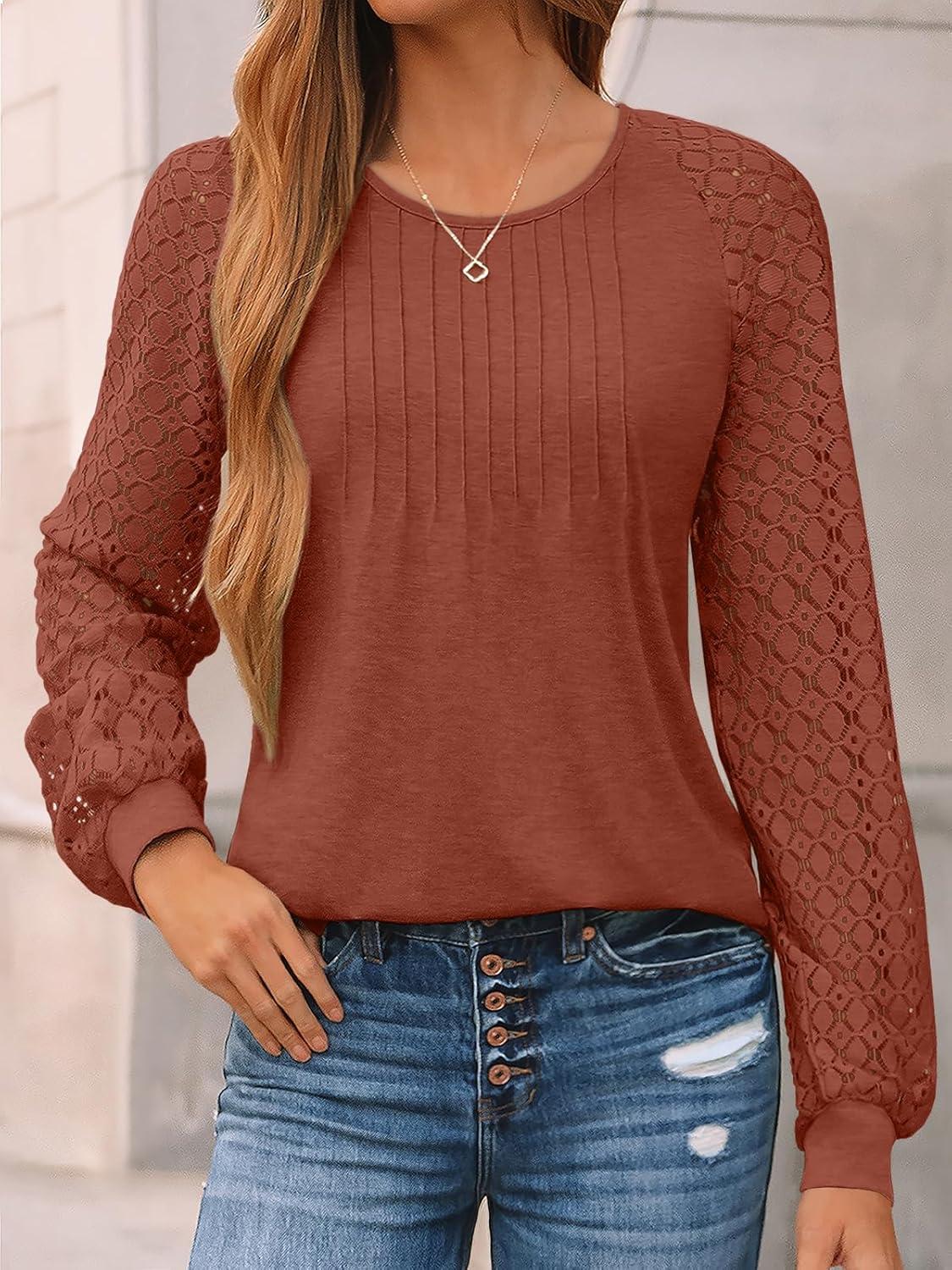AUTOMET Womens Long Sleeve Shirts Business Casual Dressy Tops Lace Crewneck Work Trendy Fall Fashion Outfits Clothes(Maple)