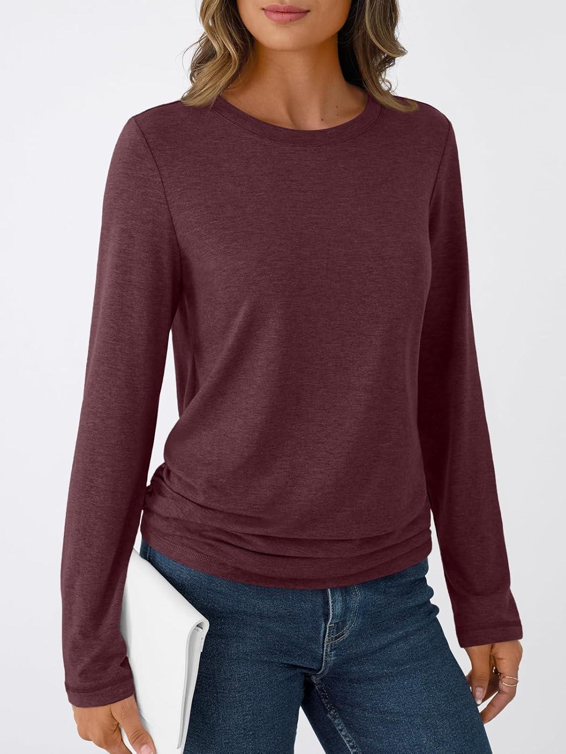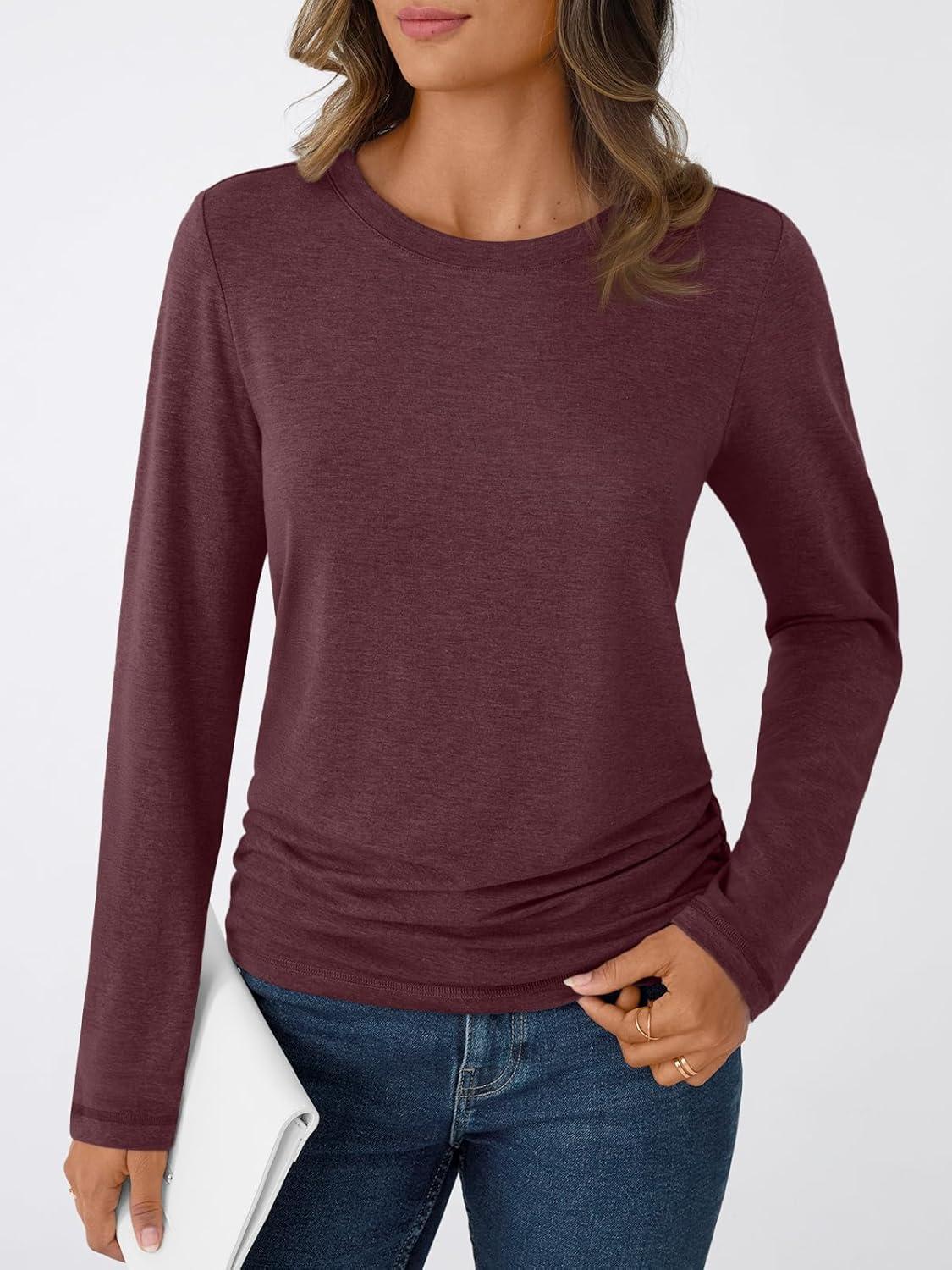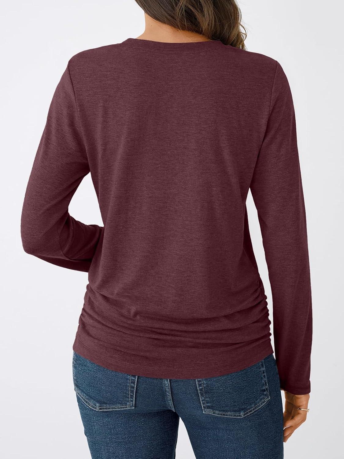 AUTOMET Womens Long Sleeve Shirts Business Casual Tops Ruched Fall Trendy Tshirt 2025(Winered)