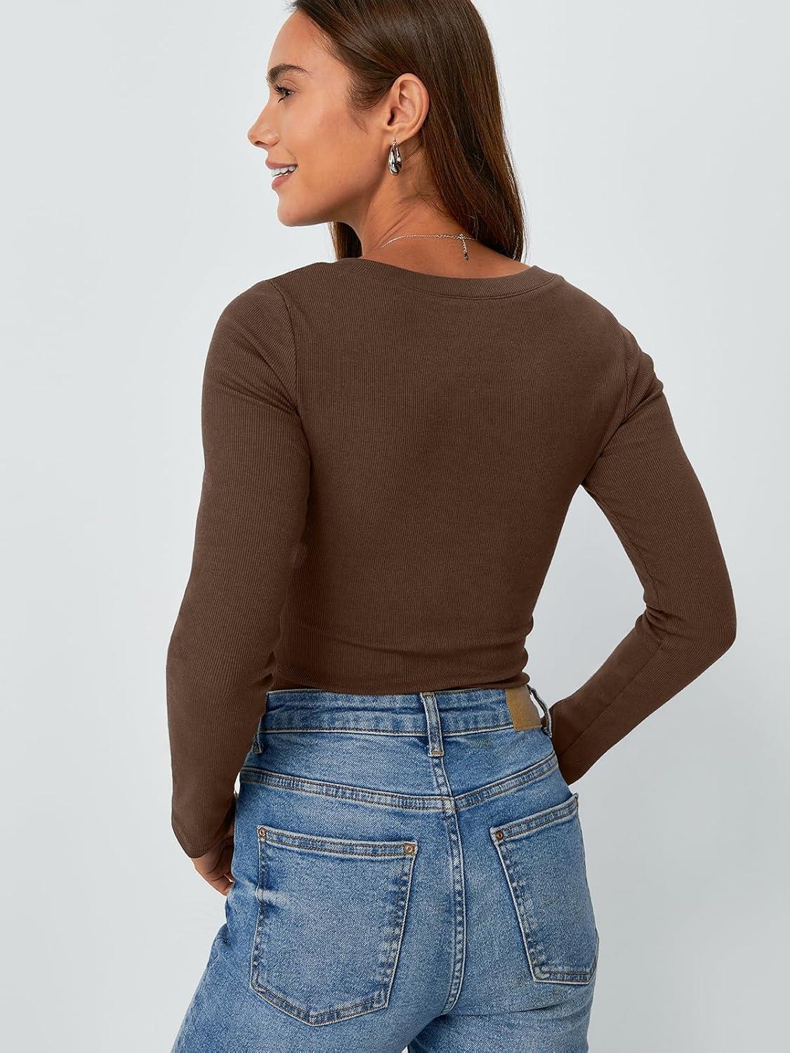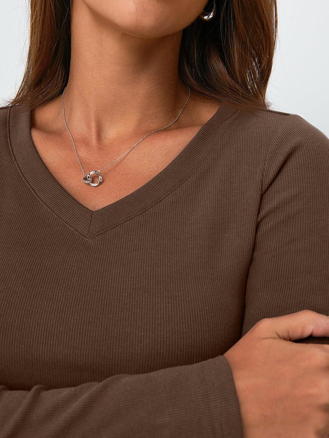 AUTOMET Womens Long Sleeve Shirts Fall Outfits Fashion Tops V Neck Ribbed Basic Casual Clothes Winter Underscrub(Brown)