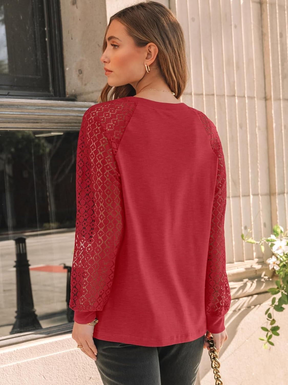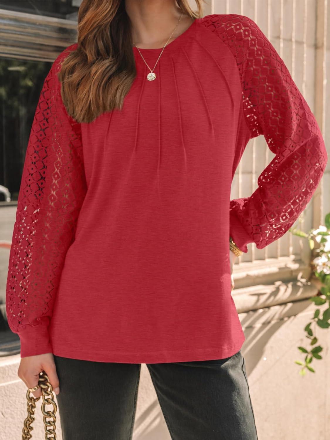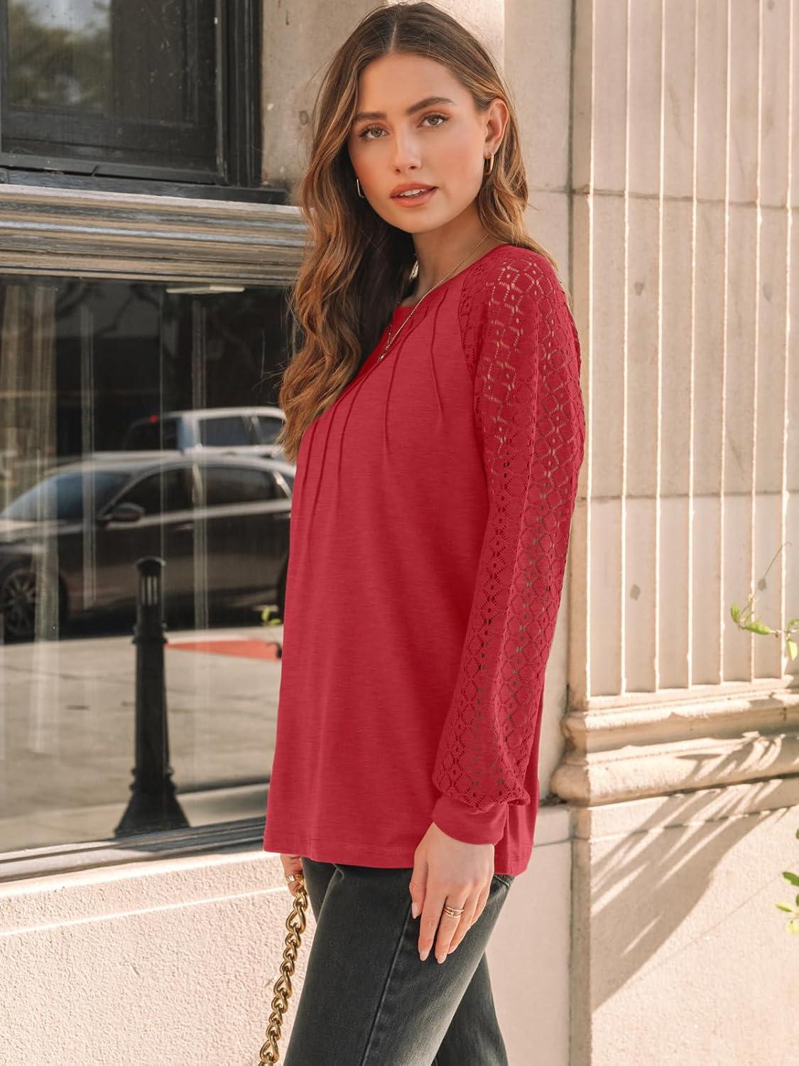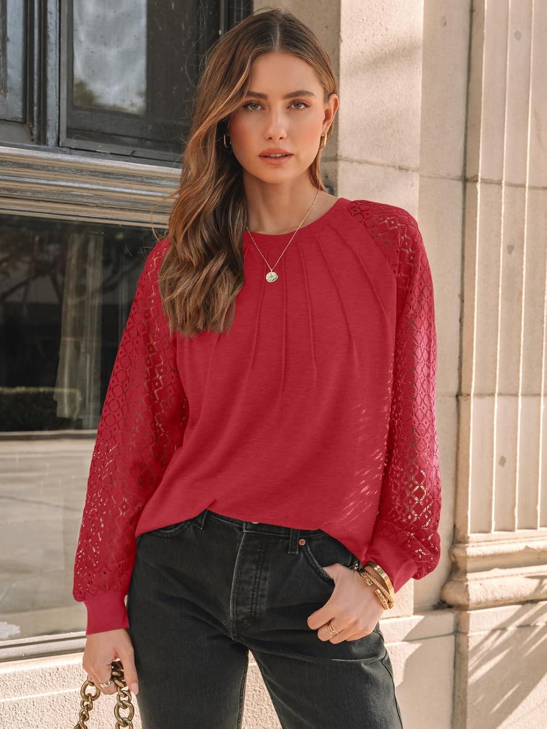 AUTOMET Womens Long Sleeve Shirts Pleated Lace Tops Fall Fashion Outfits Business Casual Blouses(Brightred)