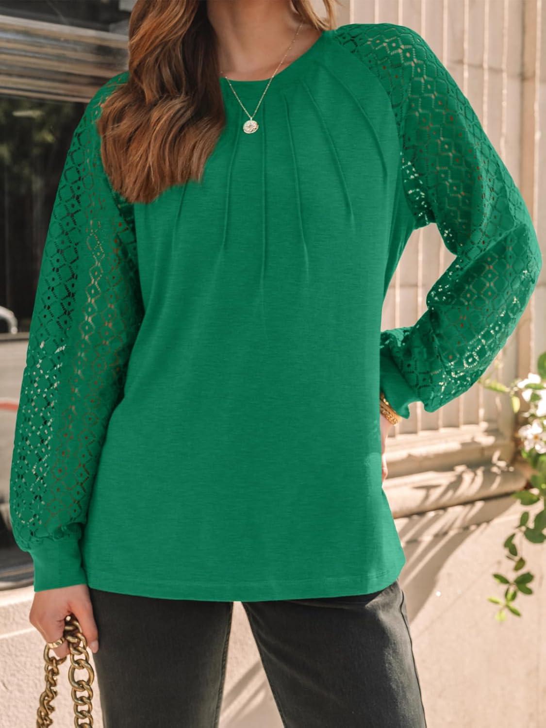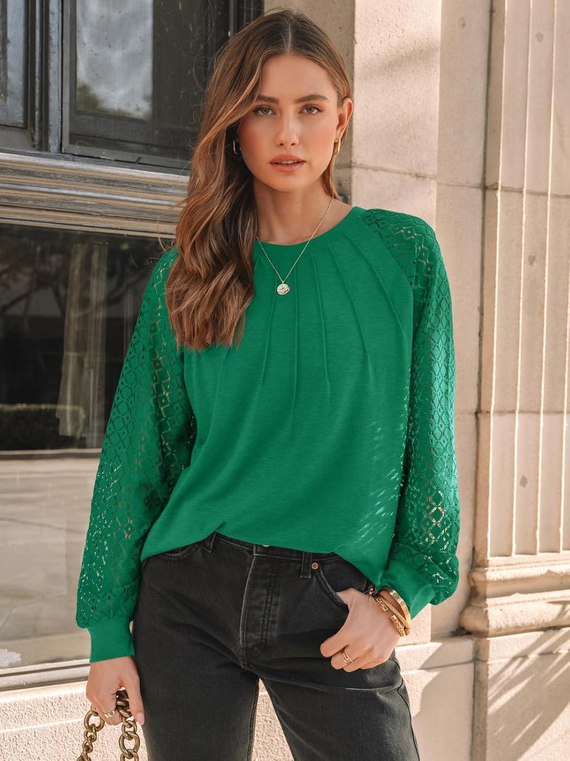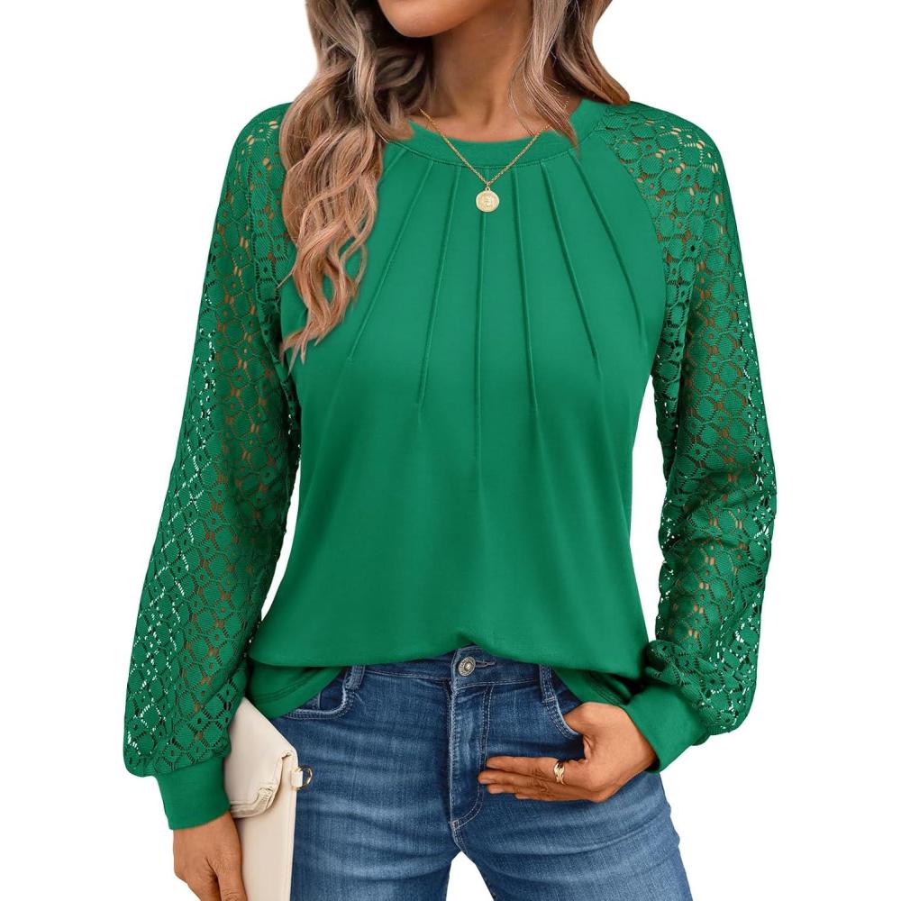 AUTOMET Womens Long Sleeve Shirts Pleated Lace Tops Fall Fashion Outfits Business Casual Blouses(Grass)