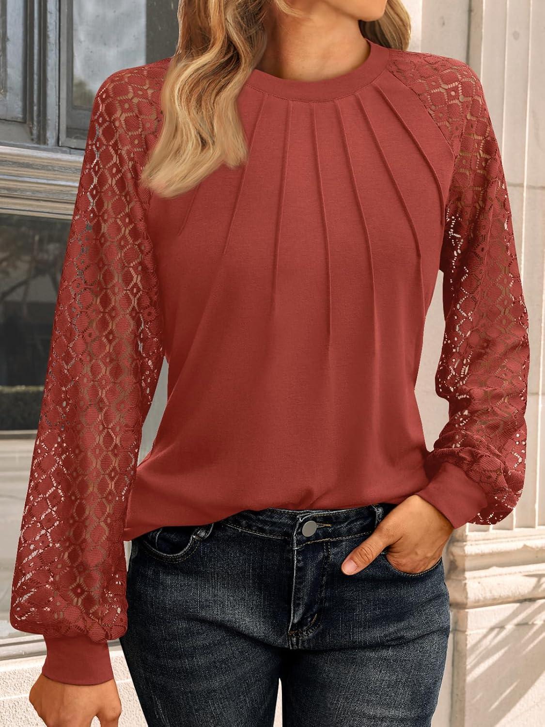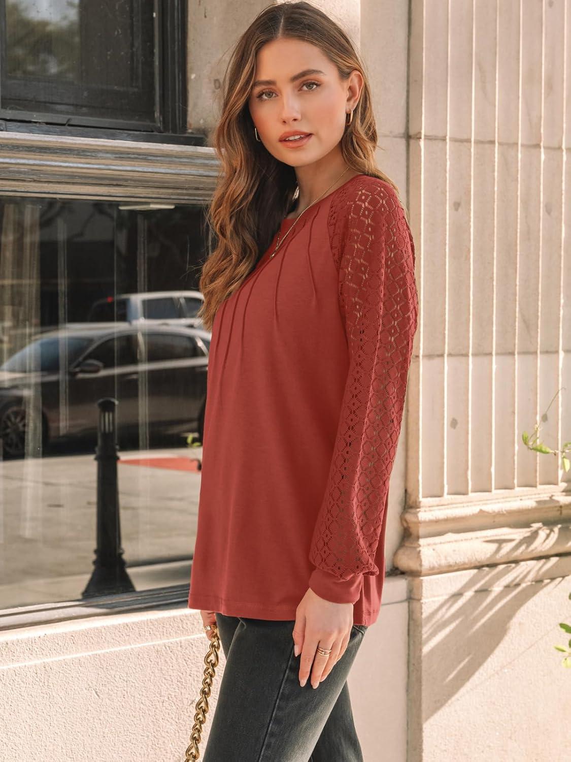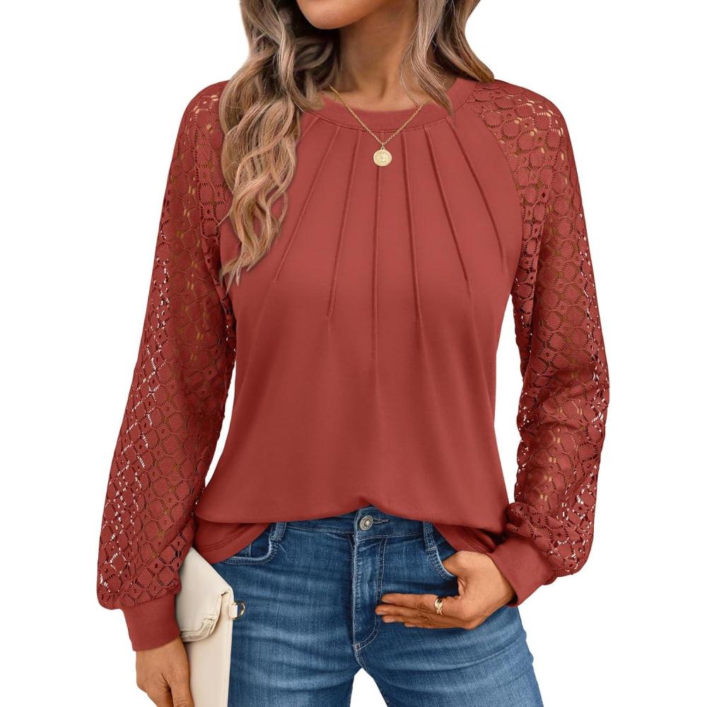 AUTOMET Womens Long Sleeve Shirts Pleated Lace Tops Fall Fashion Outfits Business Casual Blouses(Orange)