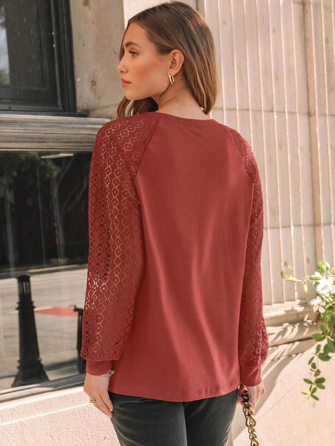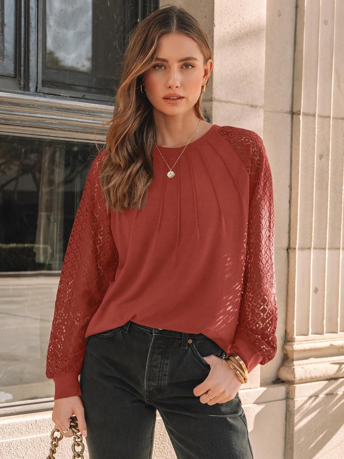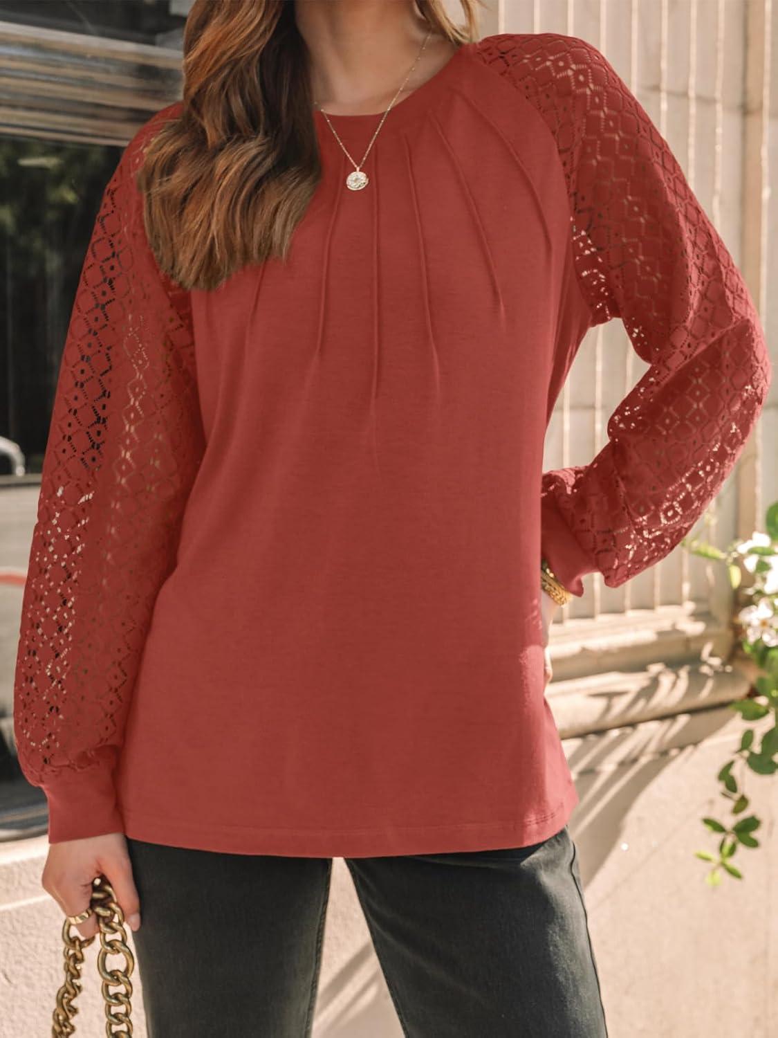 AUTOMET Womens Long Sleeve Shirts Pleated Lace Tops Fall Fashion Outfits Business Casual Blouses(Orange)