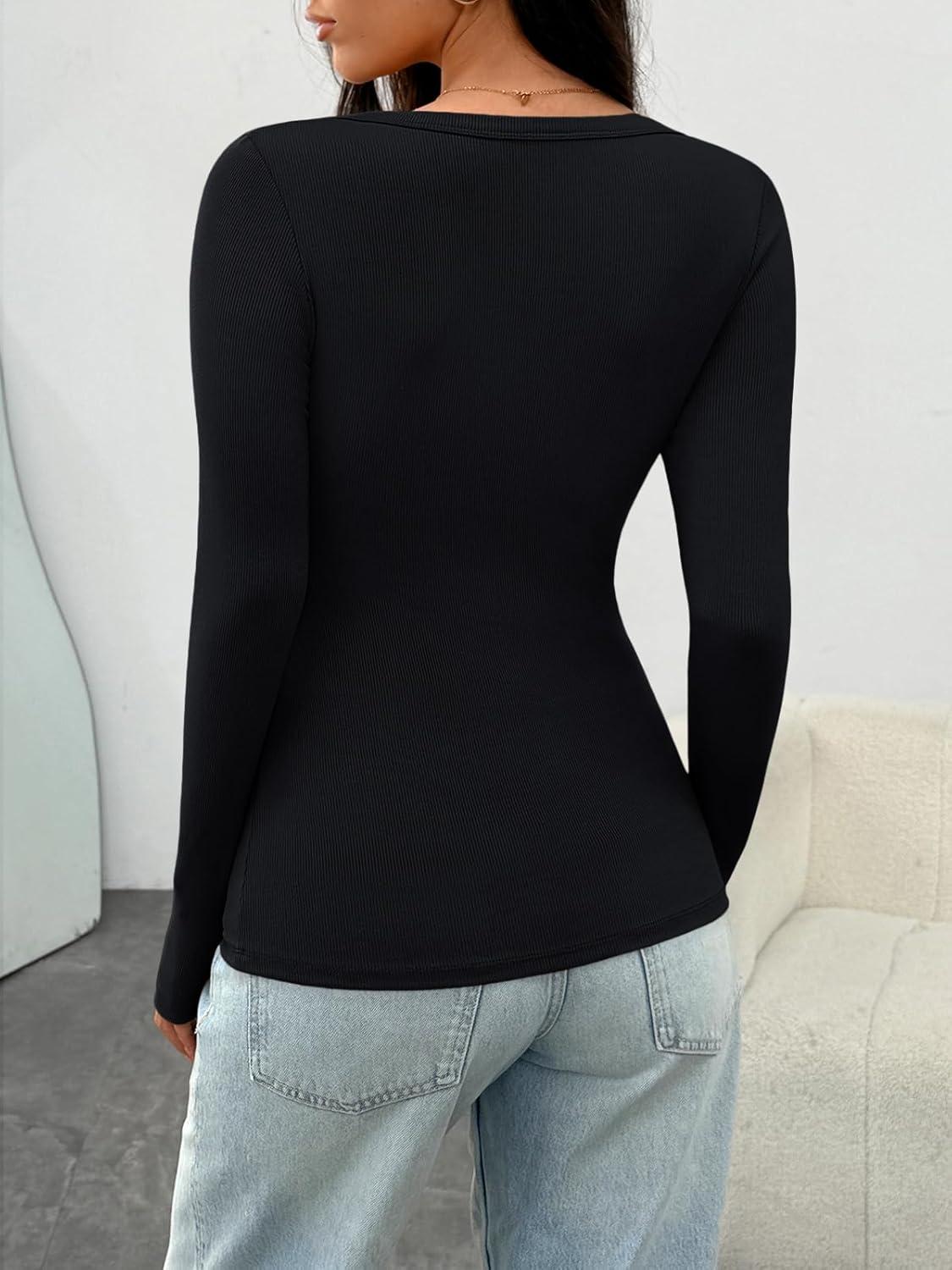 AUTOMET Womens Long Sleeve Shirts Ribbed Knit Tops Scoop Neck Fall Tops(Black)