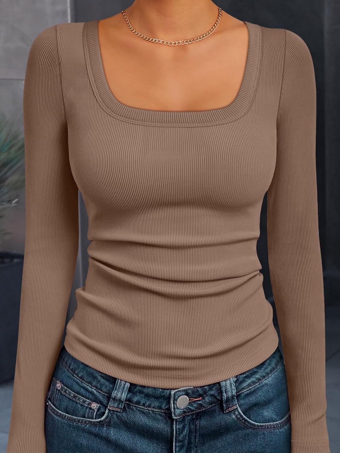 AUTOMET Womens Long Sleeve Shirts Square Neck Tops Ribbed Knit Basic Teen Girls Crop Tops Fall Outfits Fashion Clothes 2025(Khaki)