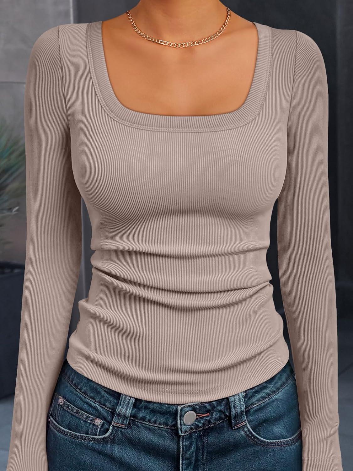 AUTOMET Womens Long Sleeve Shirts Square Neck Tops Ribbed Knit Basic Teen Girls Crop Tops Fall Outfits Fashion Clothes 2025(Oatmeal)