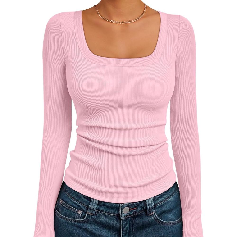 AUTOMET Womens Long Sleeve Shirts Square Neck Tops Ribbed Knit Basic Teen Girls Crop Tops Fall Outfits Fashion Clothes 2025(Pink)
