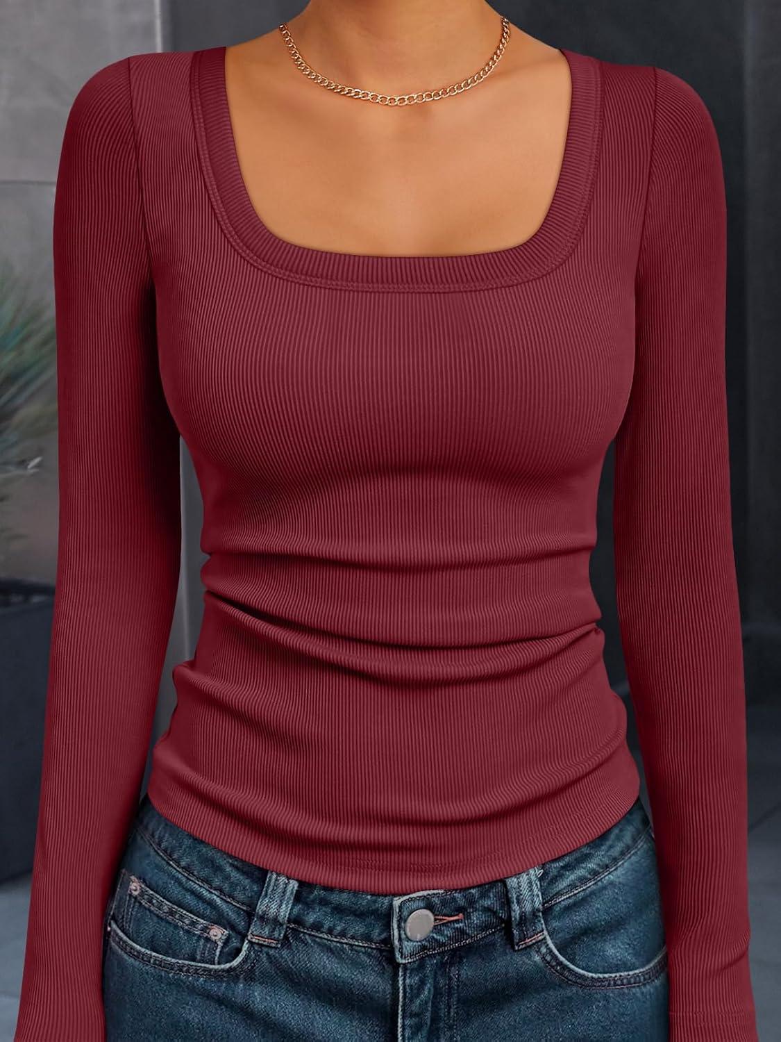 AUTOMET Womens Long Sleeve Shirts Square Neck Tops Ribbed Knit Basic Teen Girls Crop Tops Fall Outfits Fashion Clothes 2025(Wine)