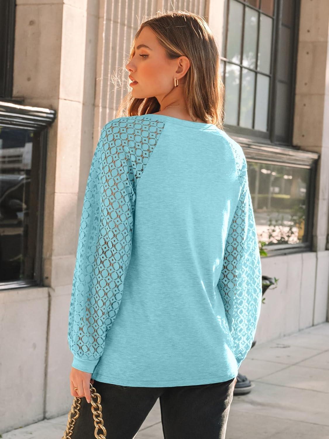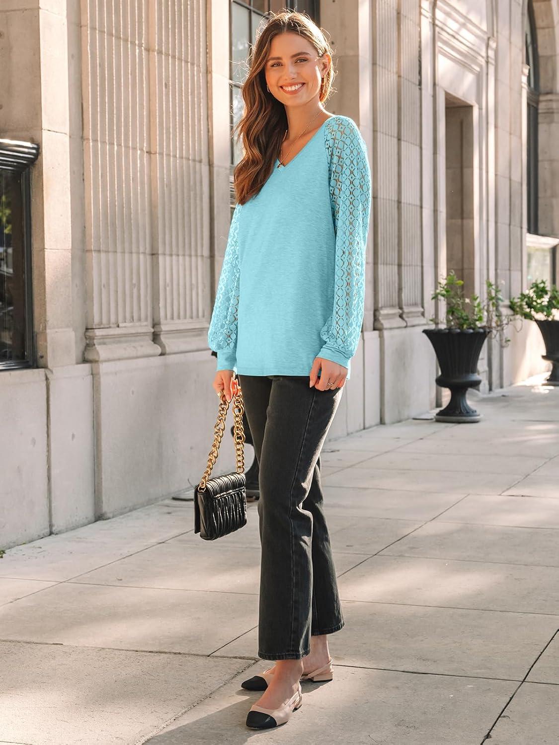 AUTOMET Womens Long Sleeve Shirts V-Neck Lace Tops Business Casual Blouses Tee Trendy 2025 Fall Fashion Outfits Clothes(Cyan)