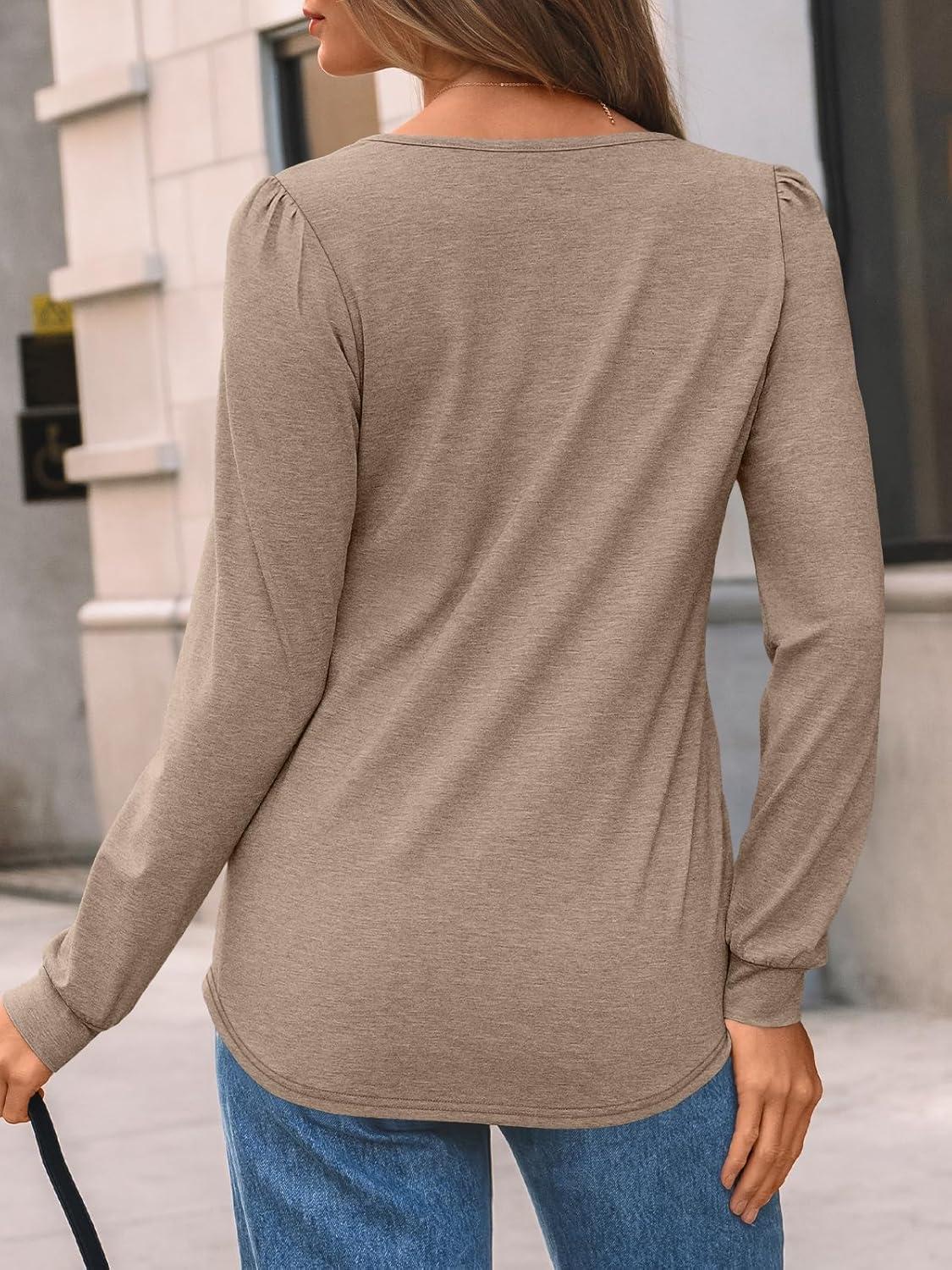 AUTOMET Womens Long Sleeve T-Shirts Dressy Business Casual Tops Tunic Fall Fashion Crewneck Blouse Trendy Winter Outfits 2025(Khaki)