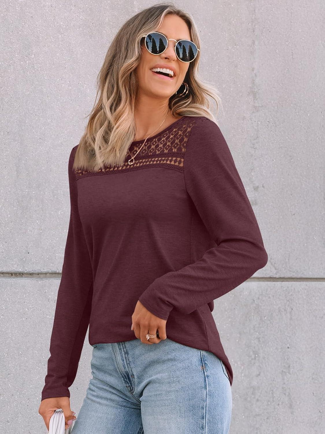 AUTOMET Womens Long Sleeve Tops Dressy Casual Blouses Business Lace T-Shirts Fall Fashion 2025 Outfits Winter Trendy Clothes(Winered)