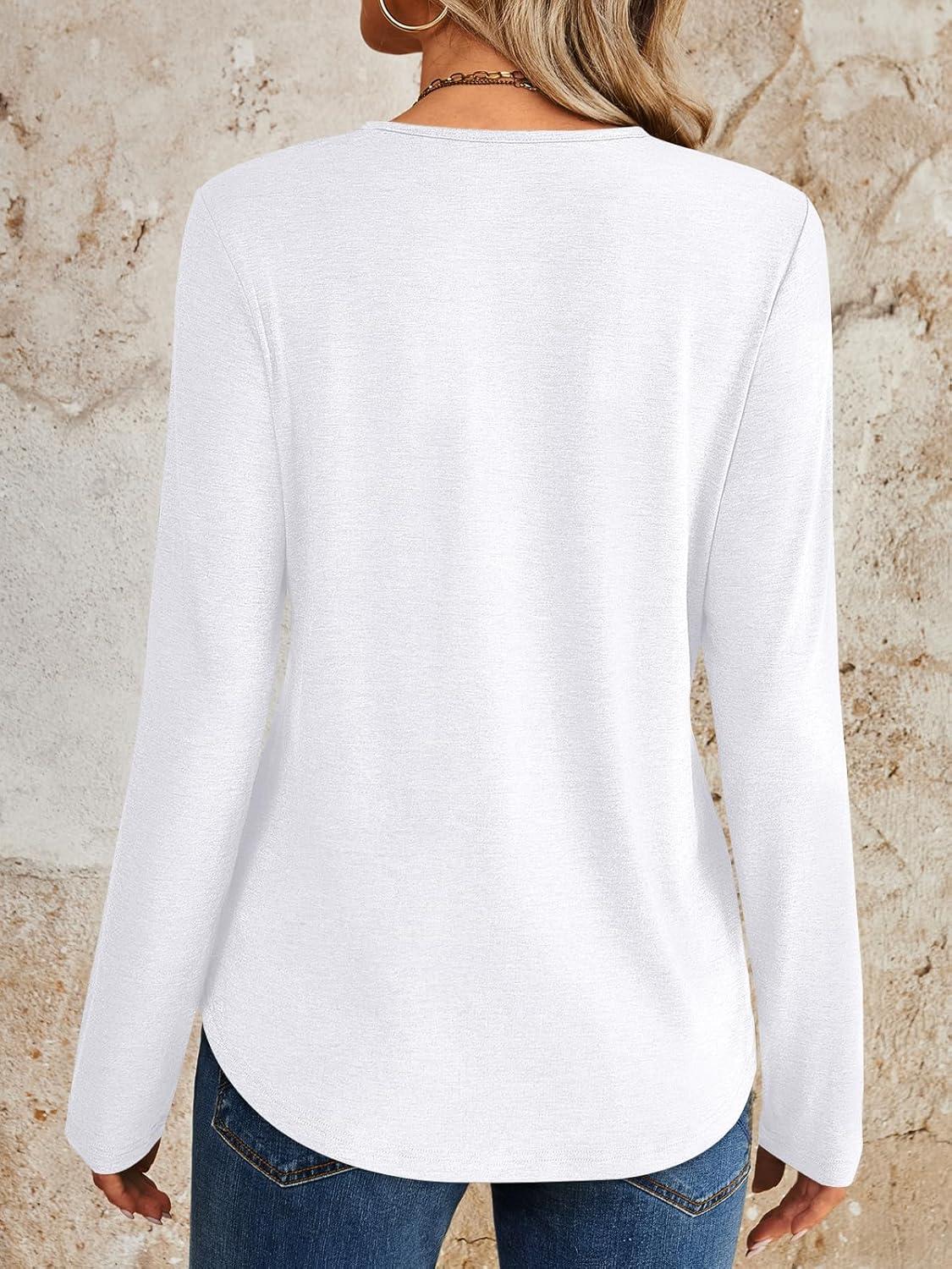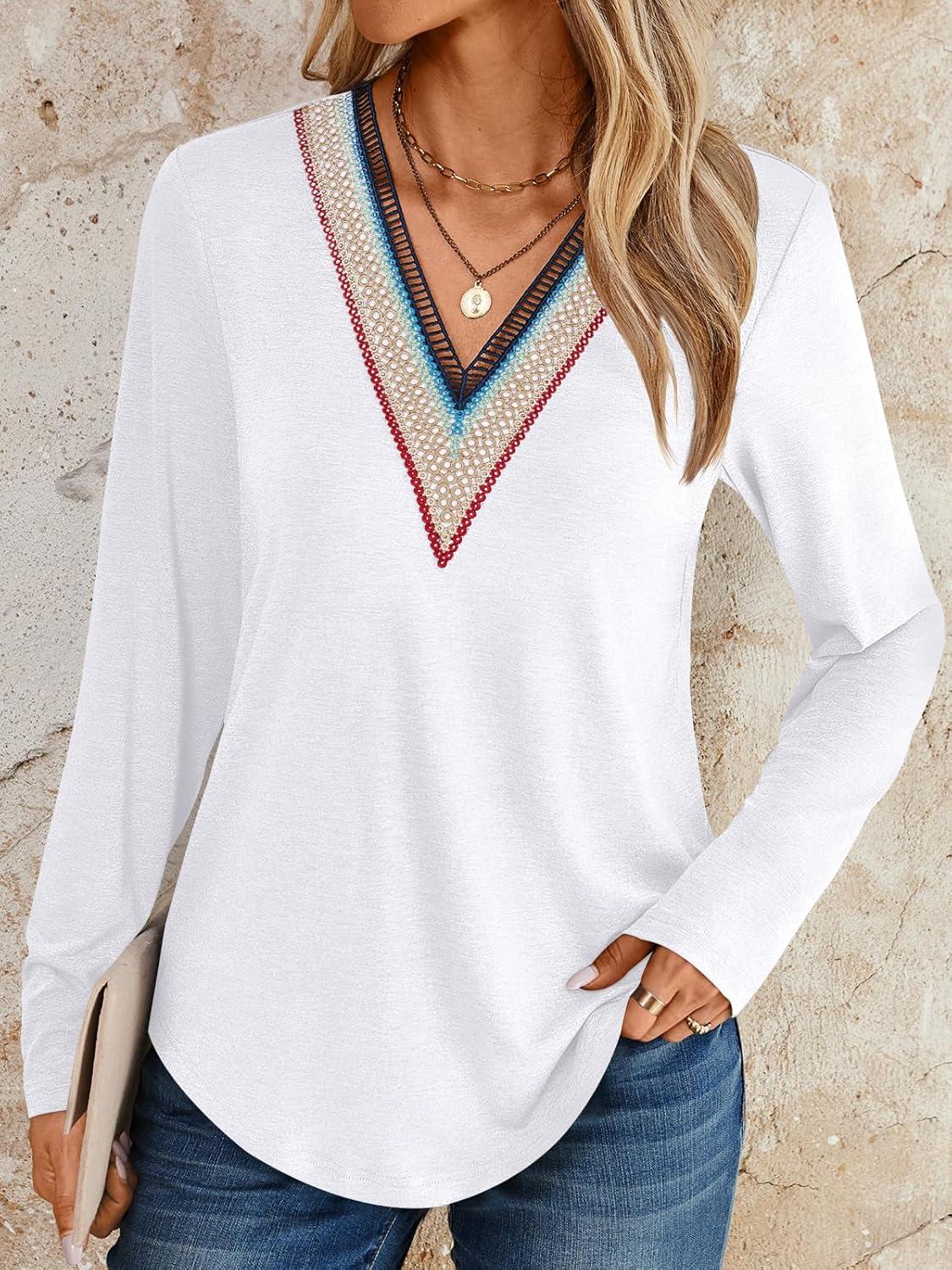 AUTOMET Womens Long Sleeve Tops Lace V Neck Shirts Casual Boho Top Fall Fashion Blouses 2025 Trendy Soft Basic Clothes(White)