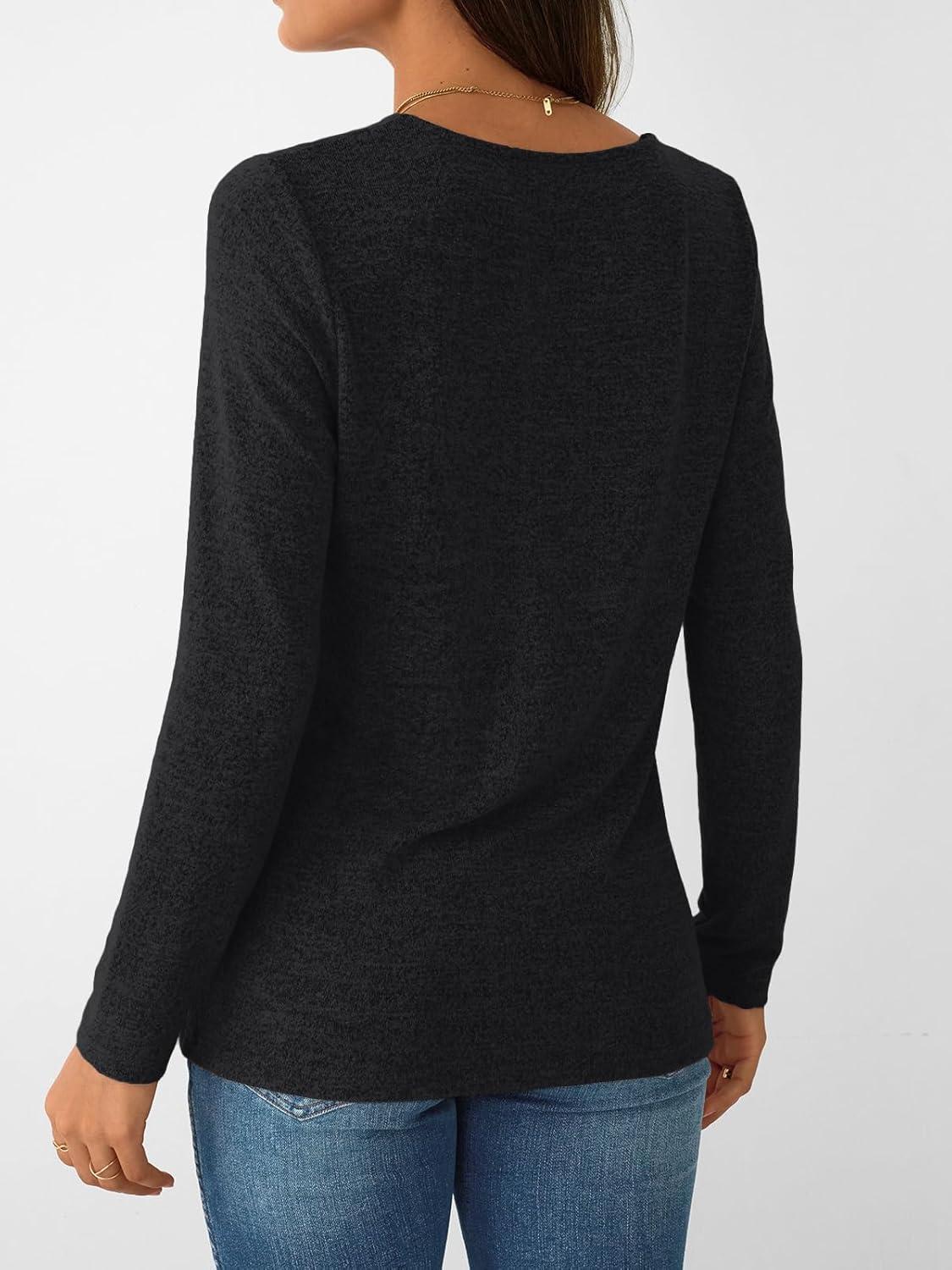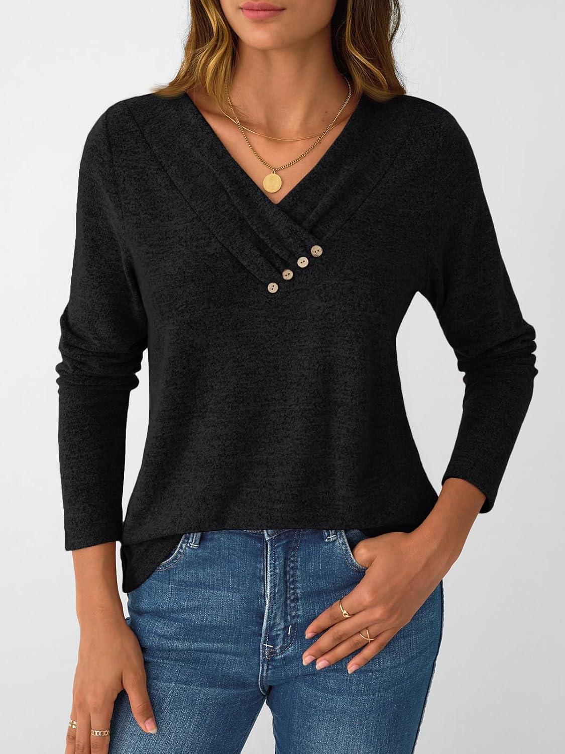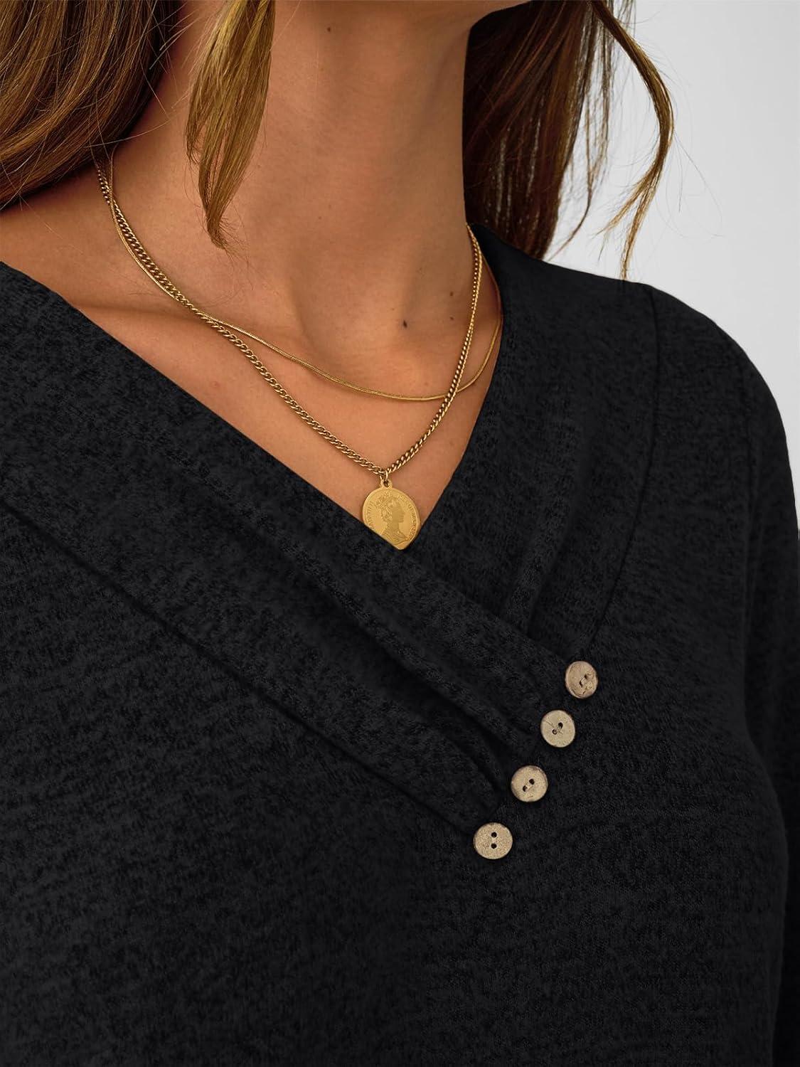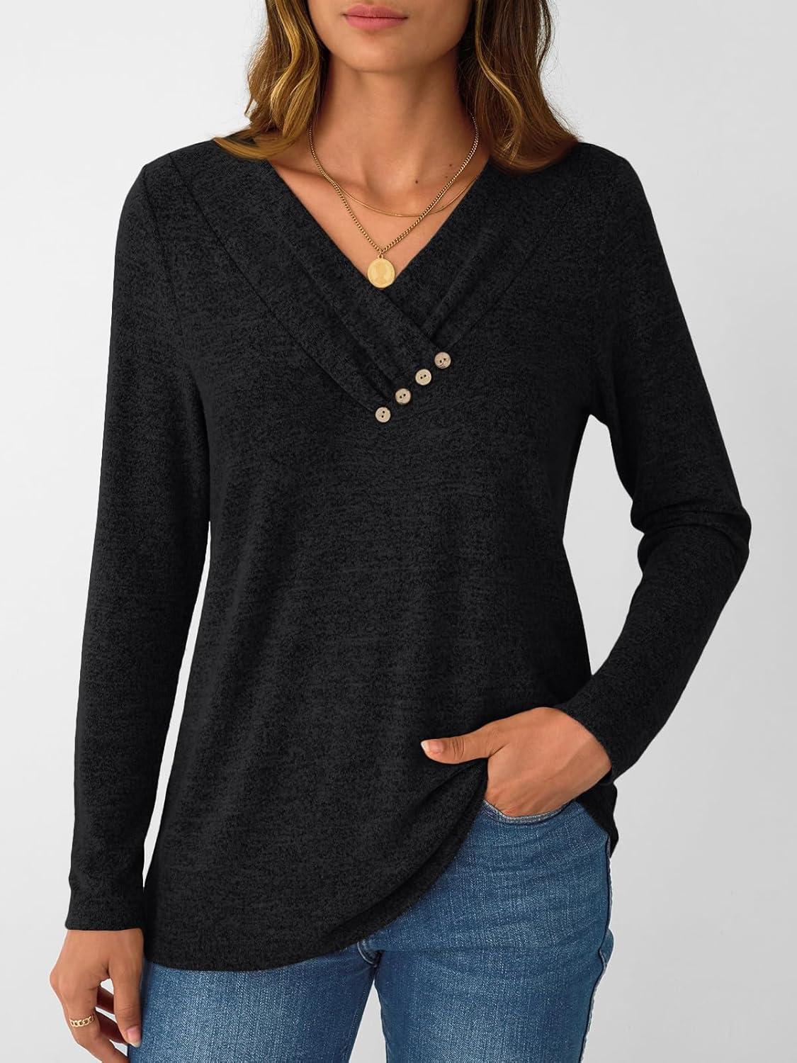 AUTOMET Womens Long Sleeve Tunic Top V Neck Button Shirts 2025 Dressy Casual Business Blouses(Black)