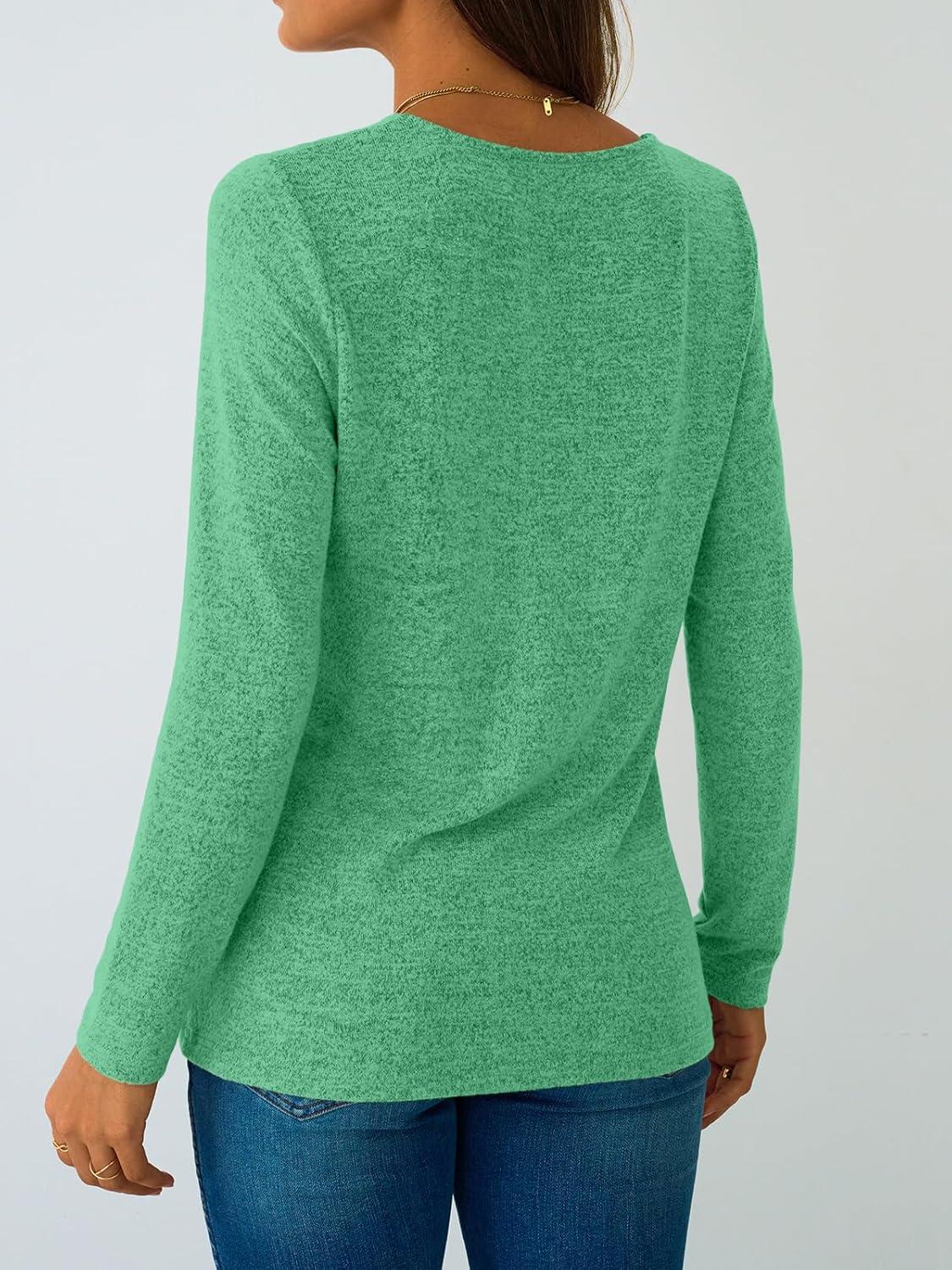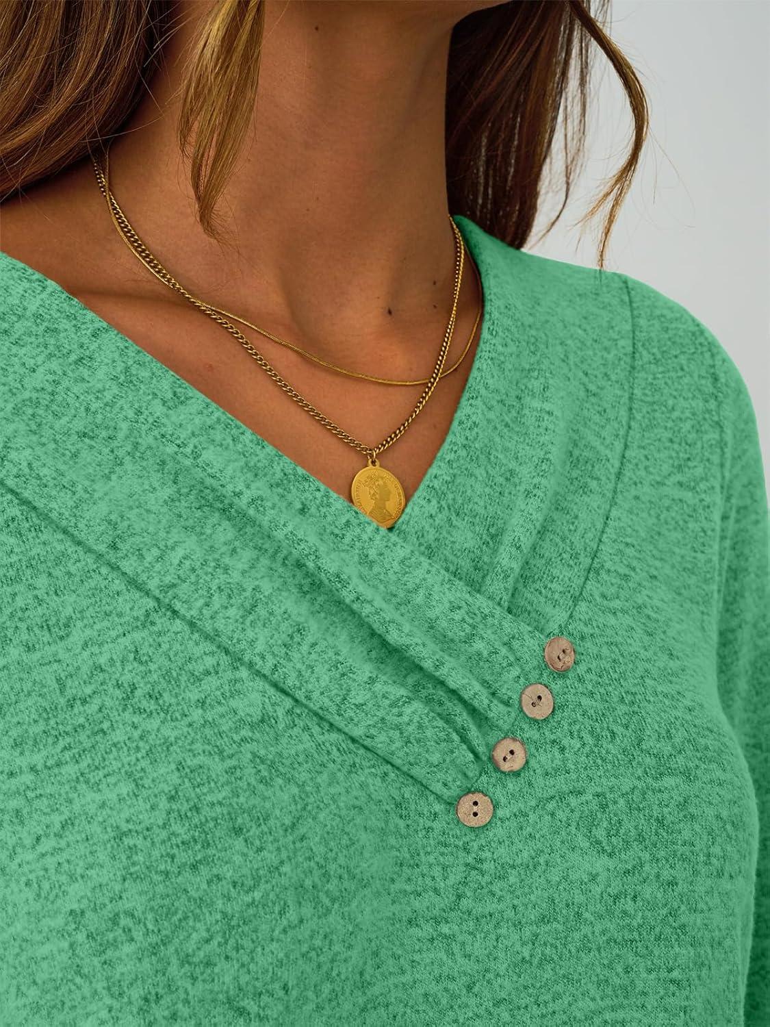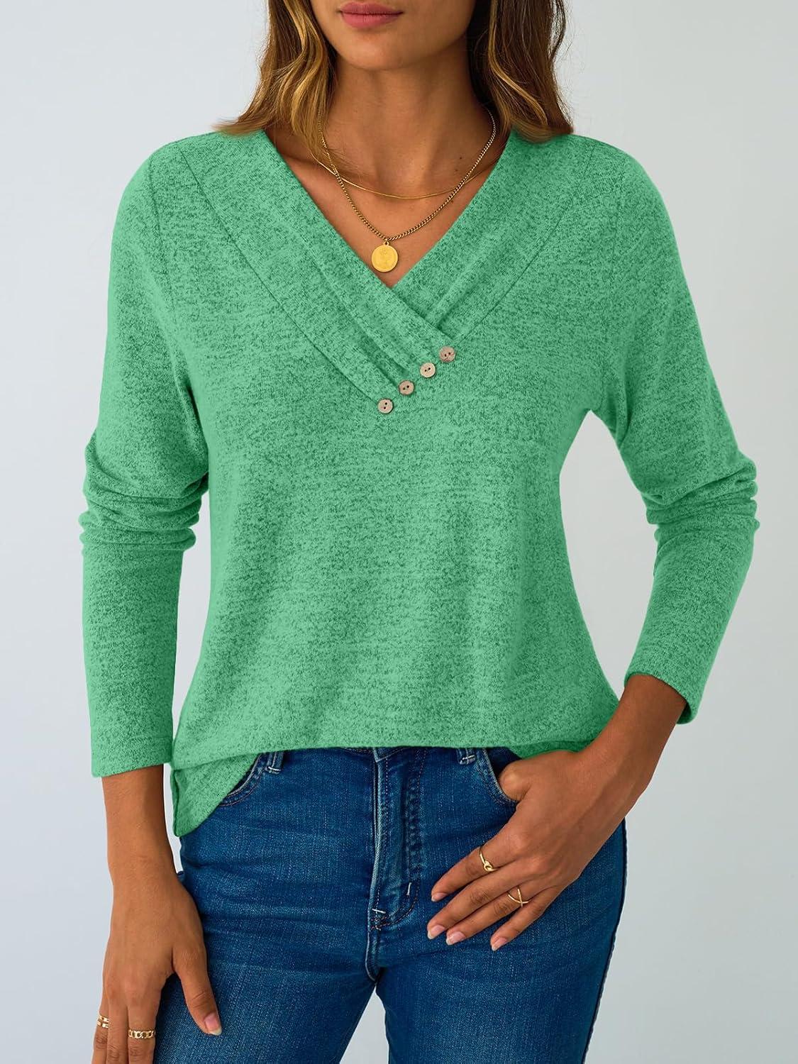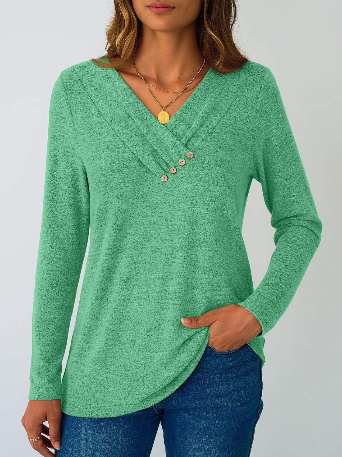 AUTOMET Womens Long Sleeve Tunic Top V Neck Button Shirts 2025 Dressy Casual Business Blouses(Lightgreen)