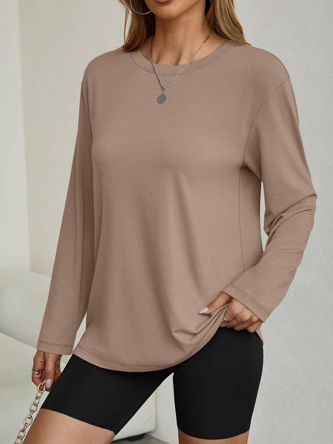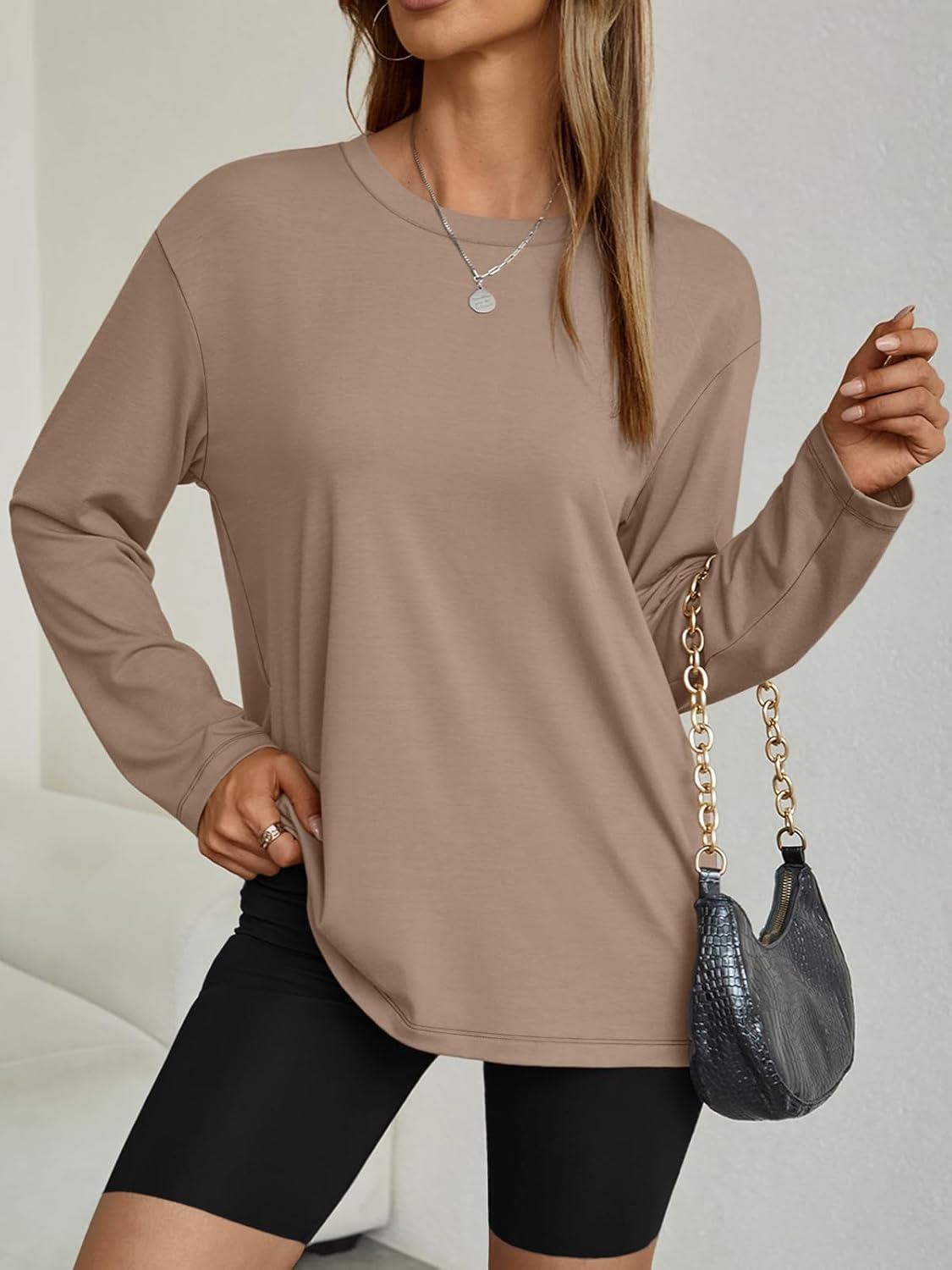 AUTOMET Women’s Oversized Long Sleeve Shirts Fall Trendy Tops Fashion Gym Baggy Basic Casual Loose Fit Workout Y2k Clothes(Khaki)