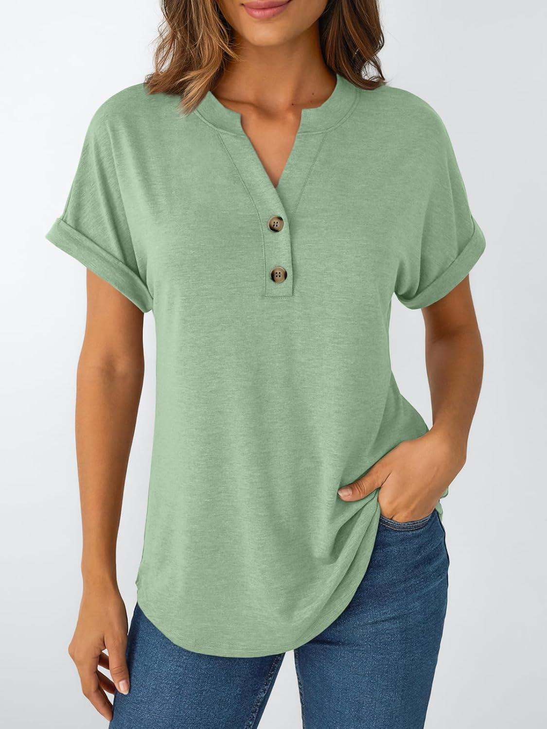 AUTOMET Women’s Short Sleeve Shirts Henley Dressy Casual Summer Tops 2025 Trendy Blouses Cute T-Shirts Outfits Clothes(Light Green)
