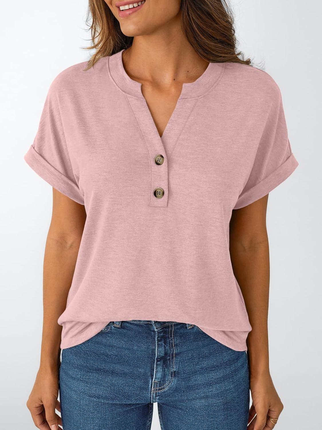 AUTOMET Women’s Short Sleeve Shirts Henley Dressy Casual Summer Tops 2025 Trendy Blouses Cute T-Shirts Outfits Clothes(Pink)