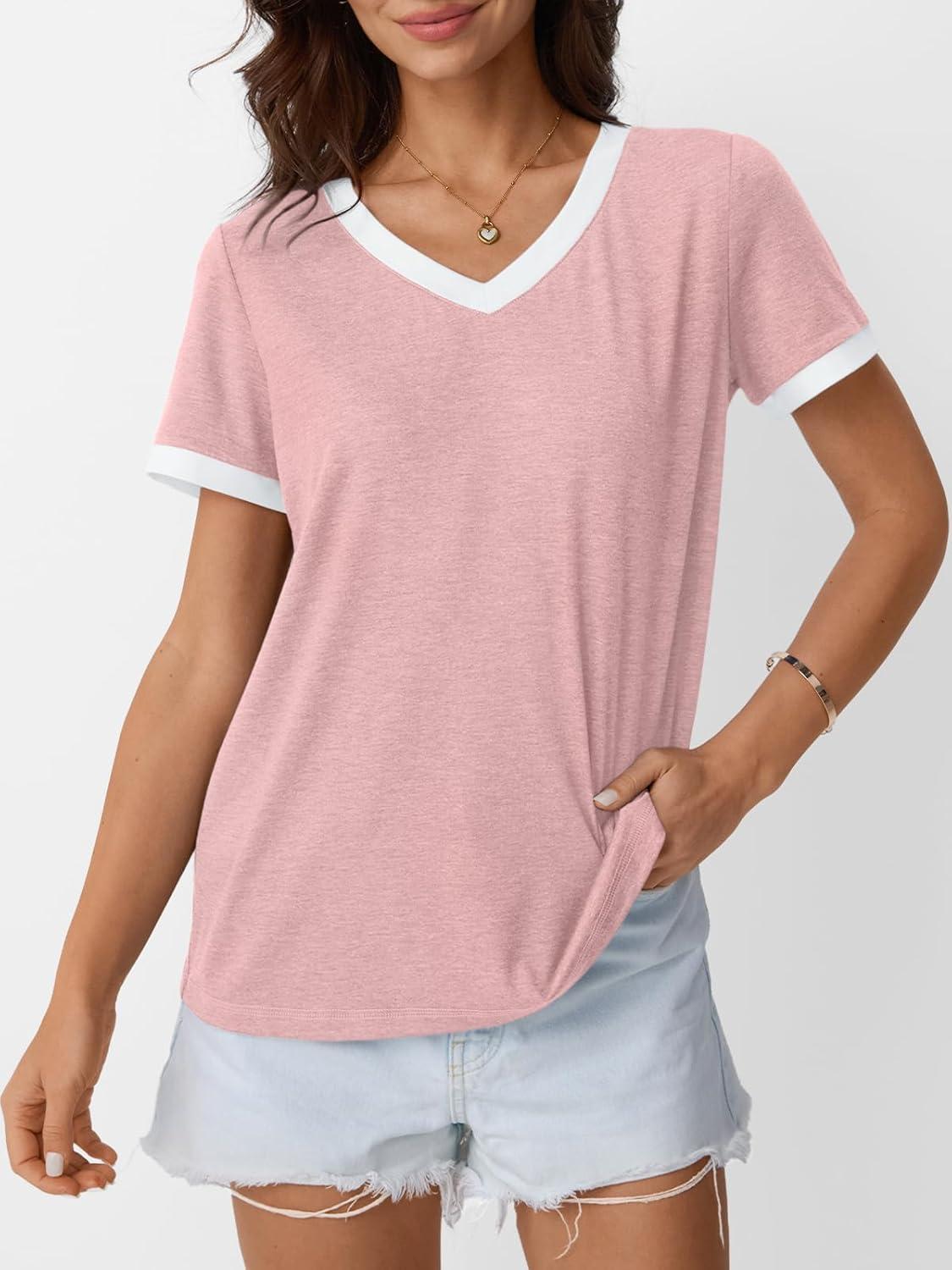 AUTOMET Womens Short Sleeve T-Shirts Summer Tops Casual Soft Tunic V Neck Basic Workout Clothes Spring Fashion Outfits 2025(Pink)
