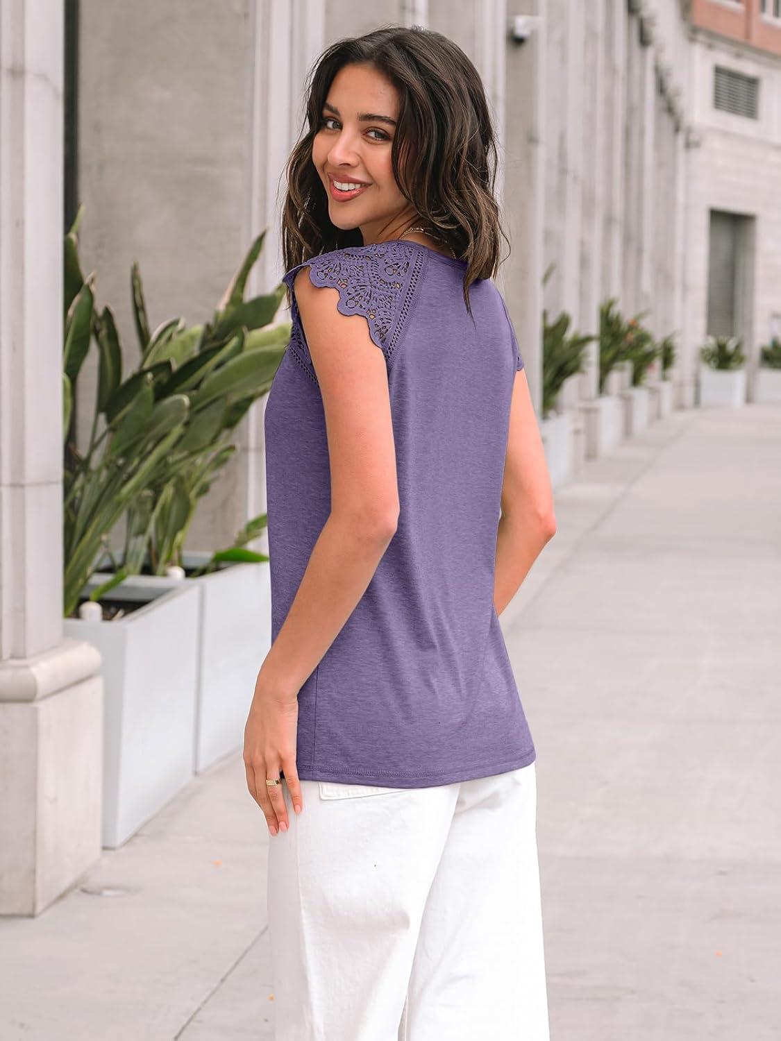 AUTOMET Womens Tops Casual Dressy Lace Summer Tee 2025 Cap Sleeve T Shirts Cute Basic Trendy Fashion Spring Outfits(Greypurple)